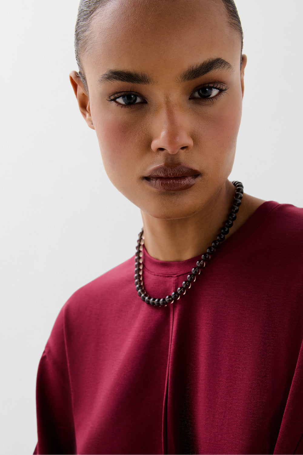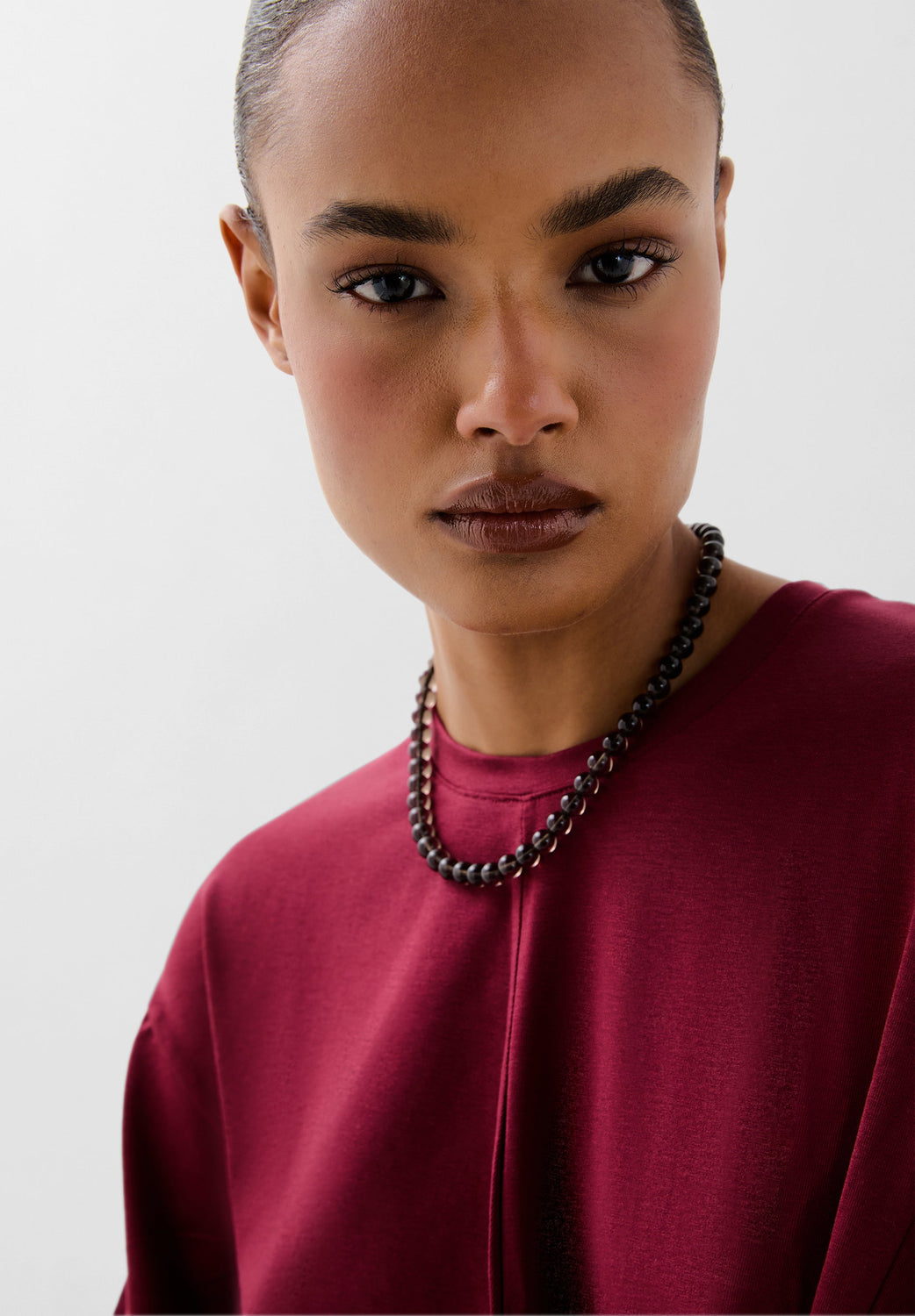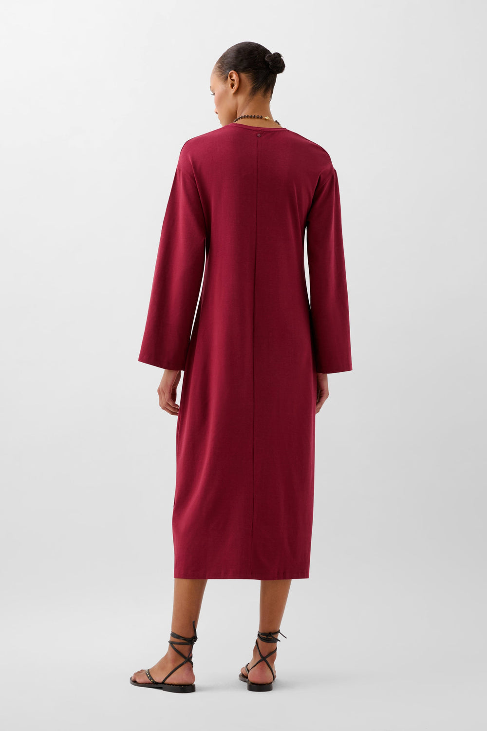 Flowing dress made of a slightly stretchy floaty material. Regular fit, round neck and long sleeves. Knot detail at the waist.