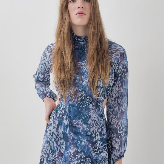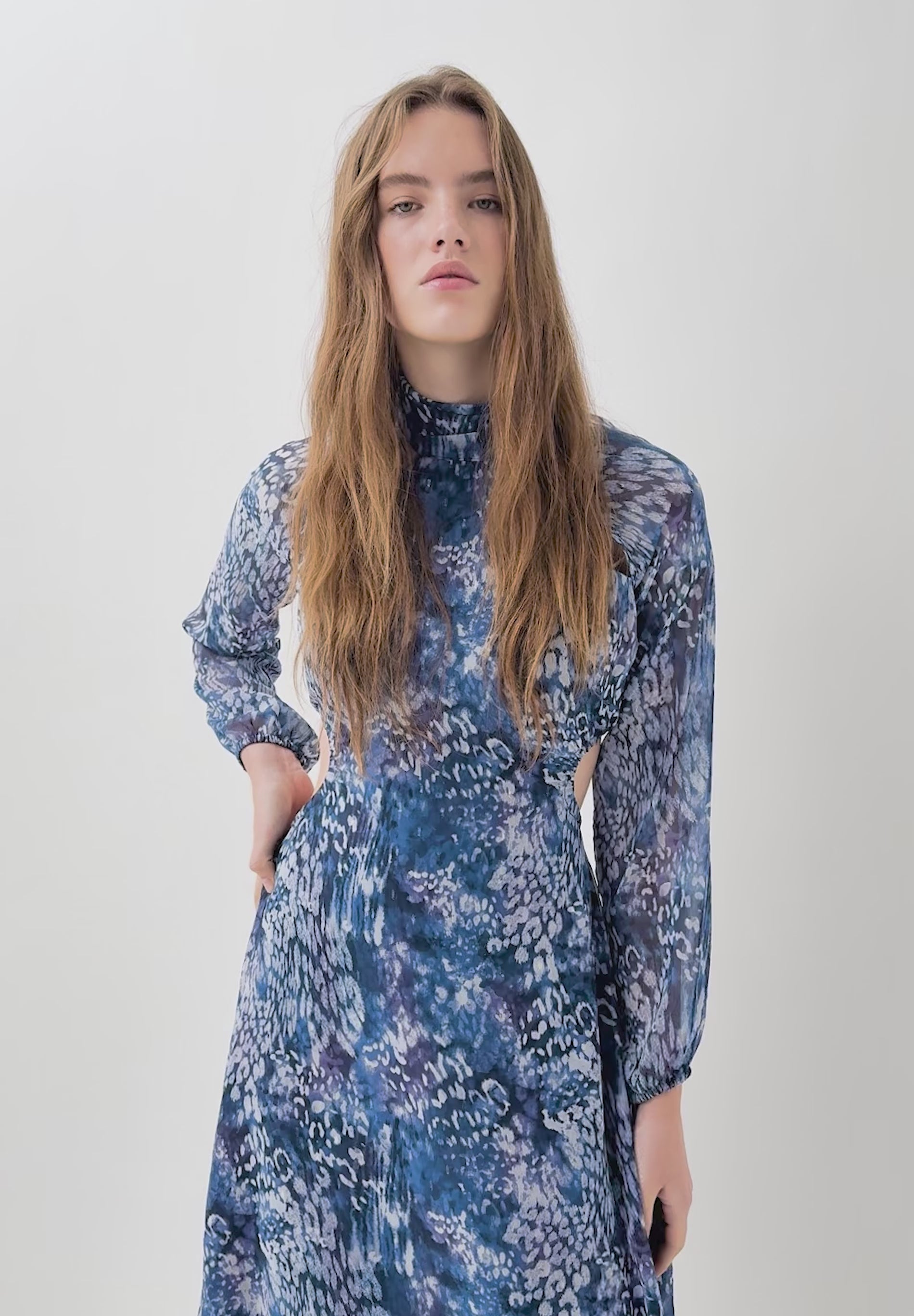 Print midi dress made of flowing fabric. Regular fit, high collar and button fastening. Slits at the neckline and elasticated back opening.