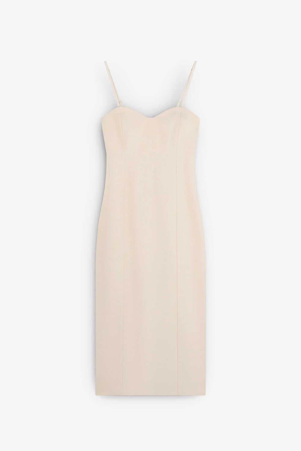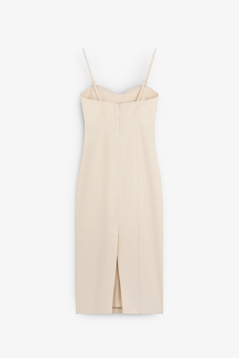 Dress made of a cotton blend. Fitted with sweetheart neckline and detachable straps. Front darts, zip fastening and back slit.