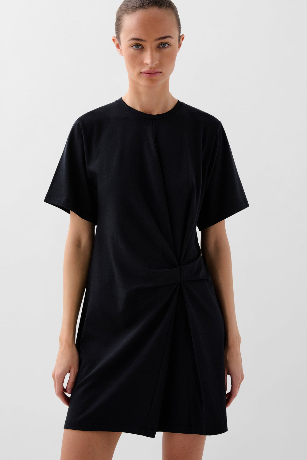 Midi dress made of slightly stretchy fluid fabric. Regular fit, round neck, short sleeves and knot detail at the waist.