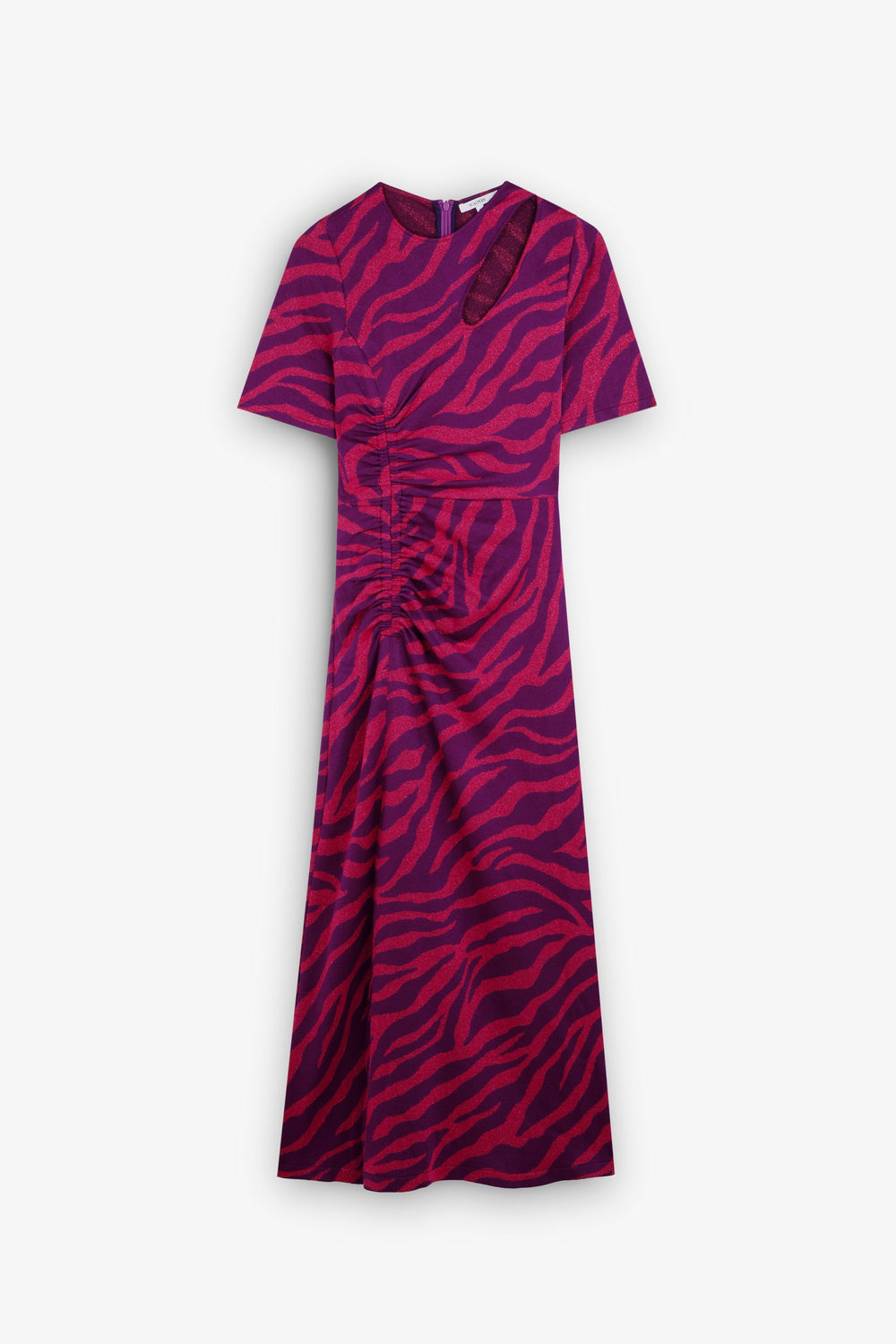 Slightly stretchy knit dress with animal print. Midi fit, round neck and back zip fastening. Short sleeves and teardrop-shaped slit detail at the top, gathering at the waist and leg slit.