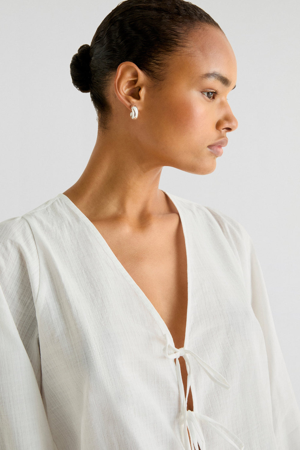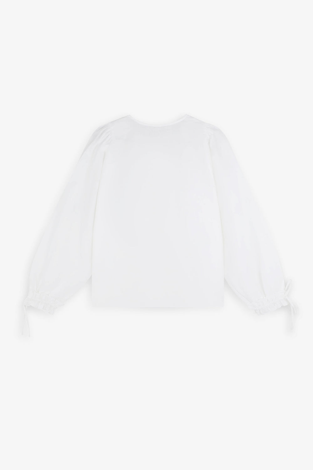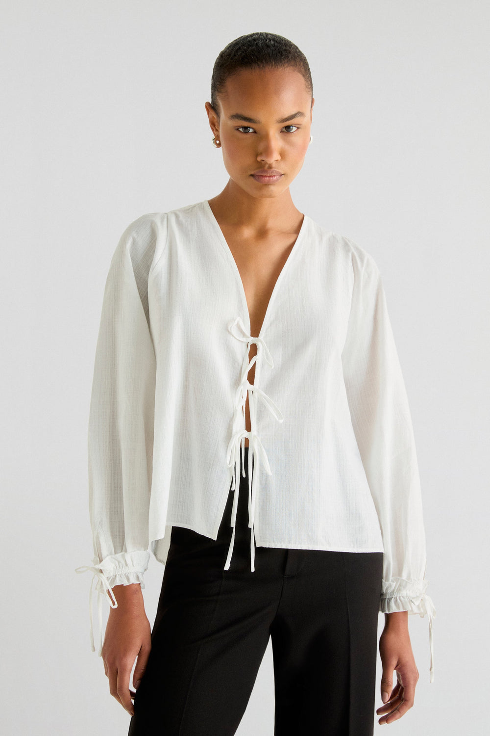 Blouse made of 100% cotton fabric. Regular fit, V-neckline and tie fastenings. Long sleeves with gathering and tie trim.