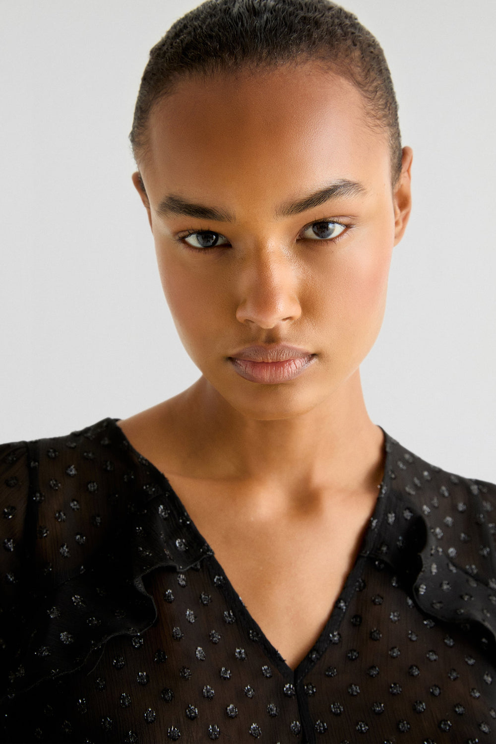 Semi-sheer blouse made of flowing shimmery fabric. Regular fit, V-neck and long sleeves with gathered trim. Ruffle details.
