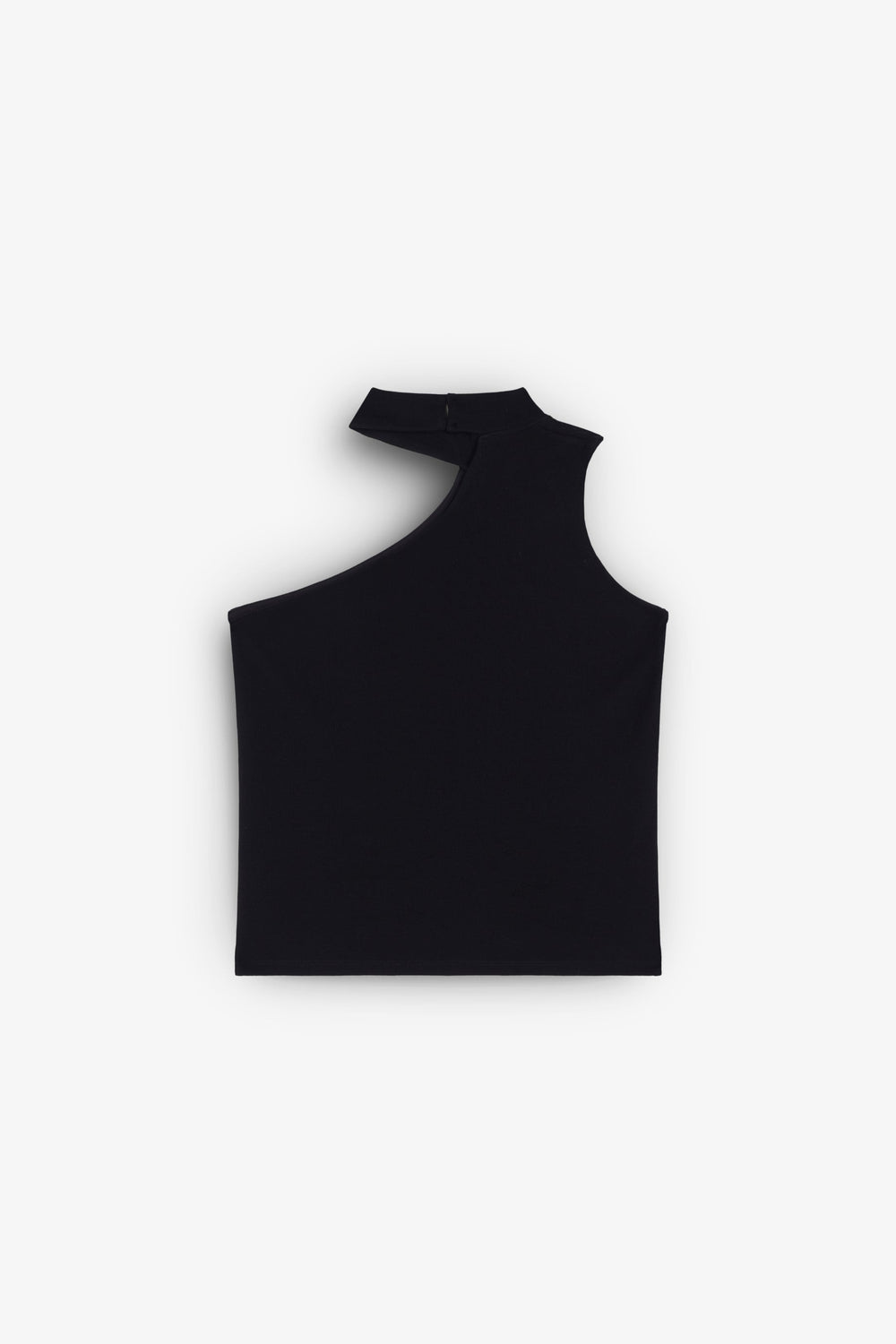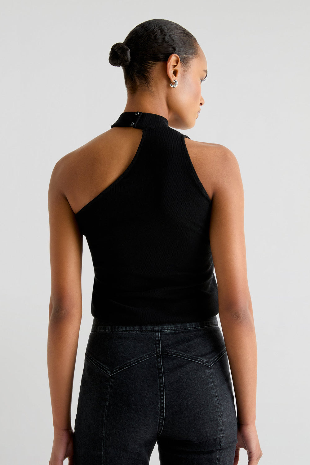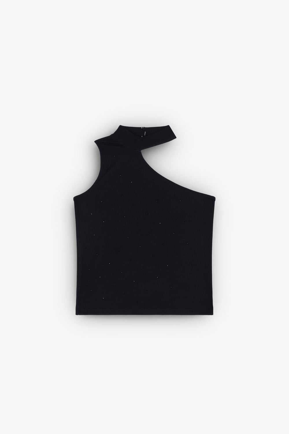 Top made of knit fabric with crystal details. Slim fit, asymmetric neckline and a strap at the neck.