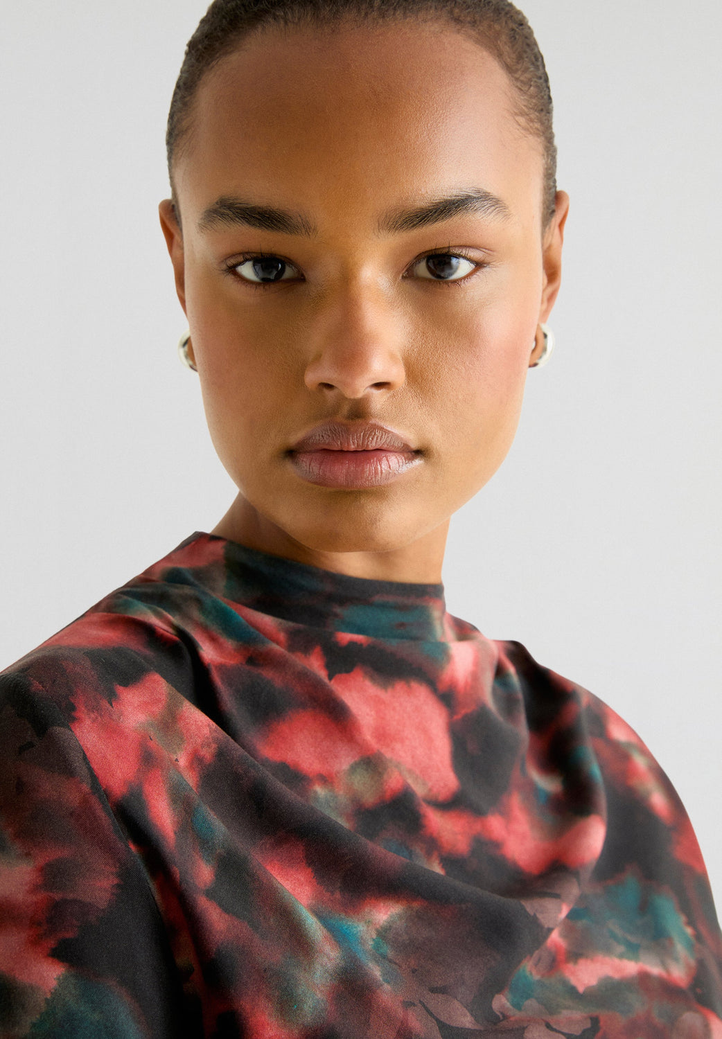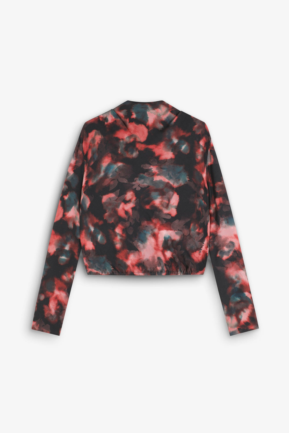 Printed blouse made of flowing fabric. Cropped regular fit, slightly high neck with draped detail and back button fastening. Long sleeves and hem with elasticated trims.