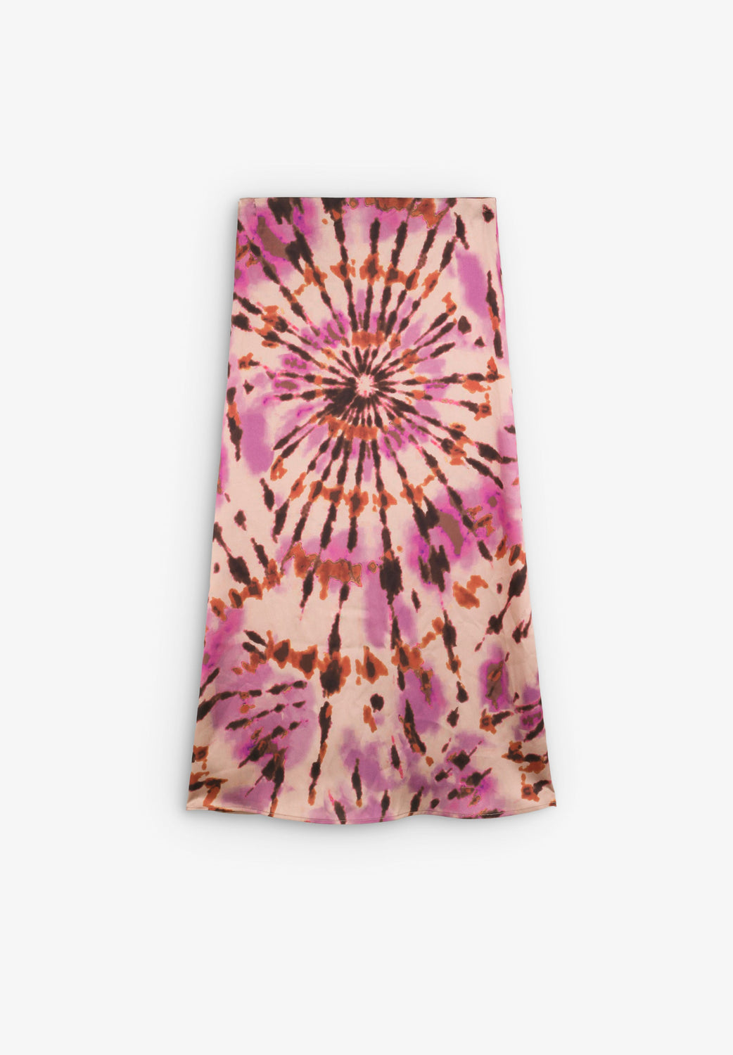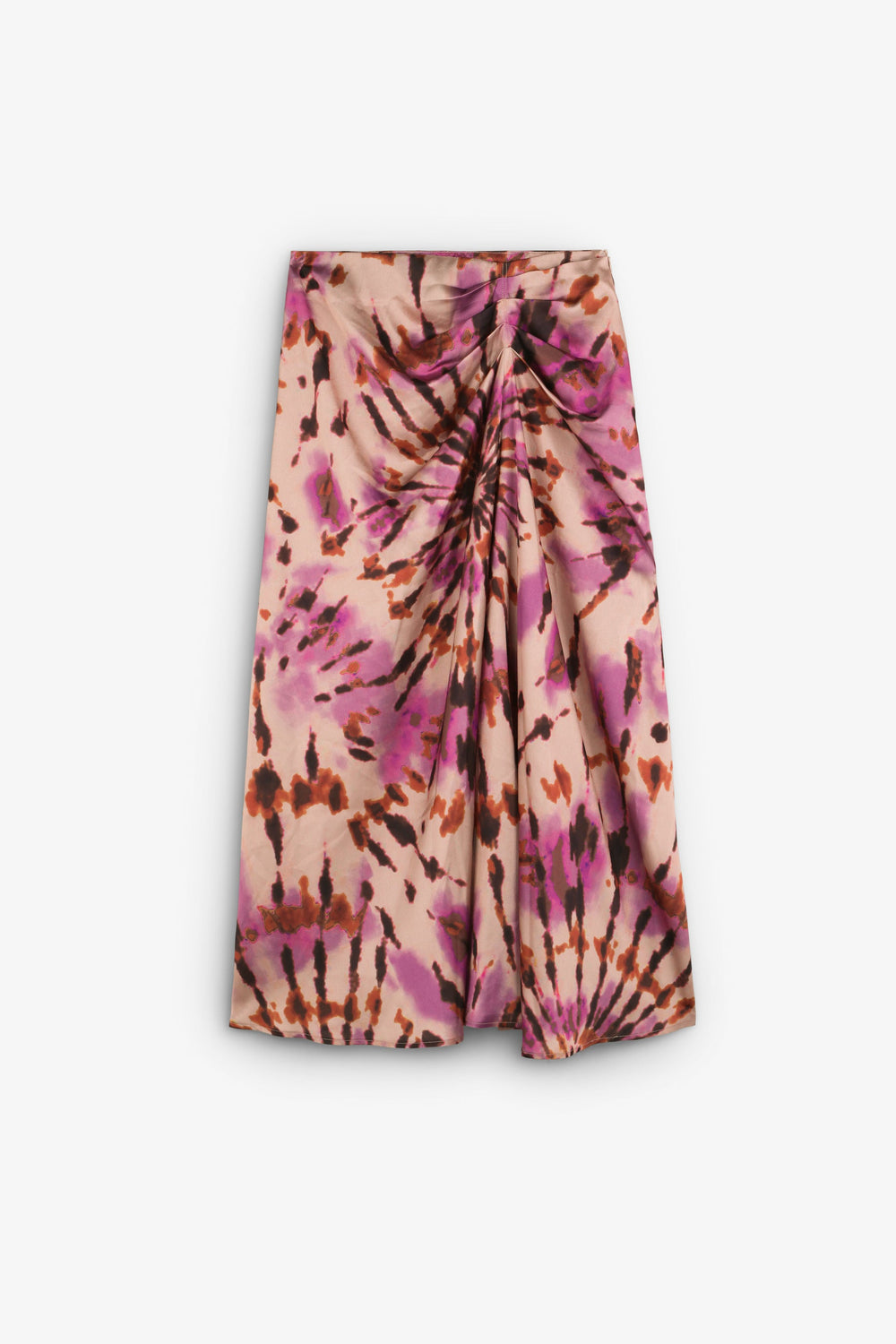 Midi skirt with a tie-dye print made of flowing fabric. Regular fit with front draping and back fastening.