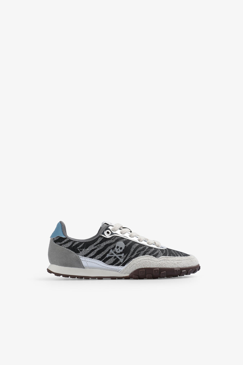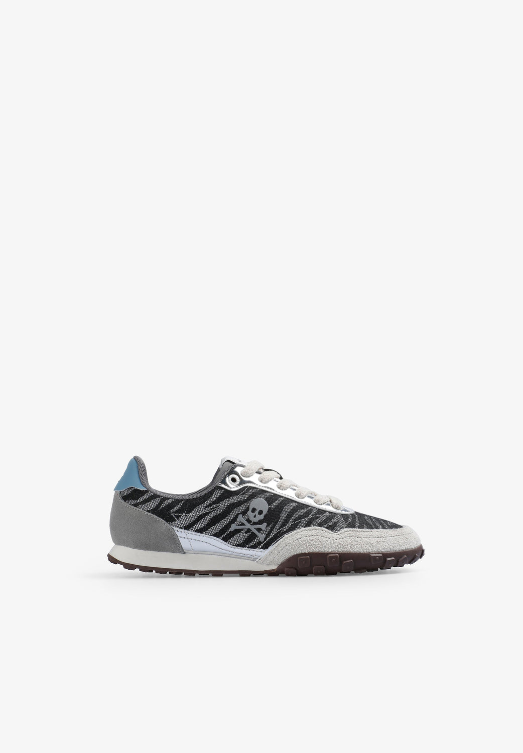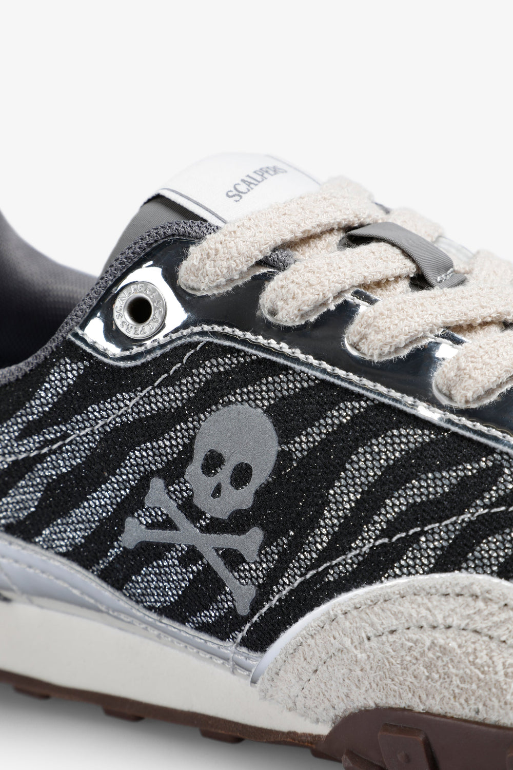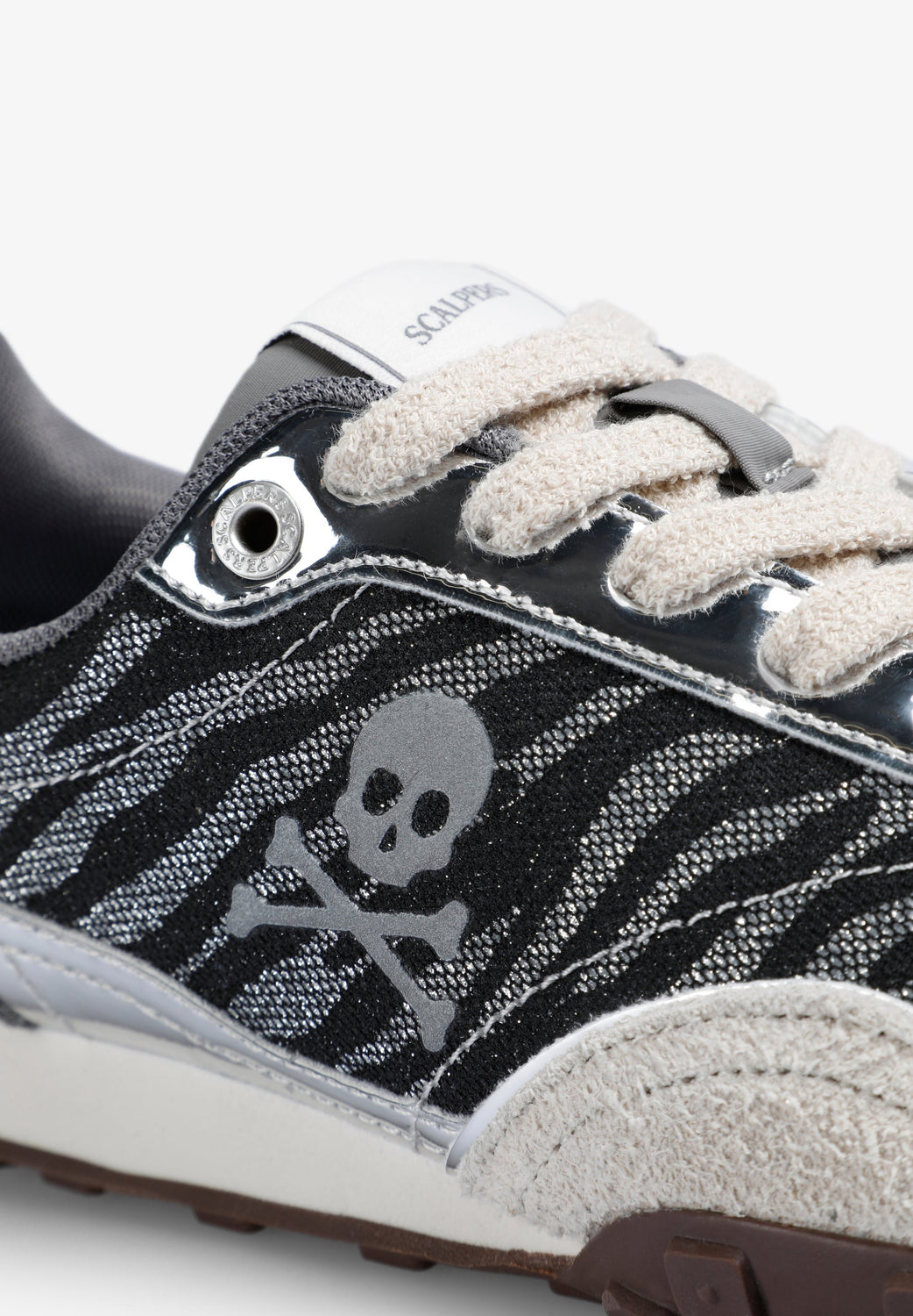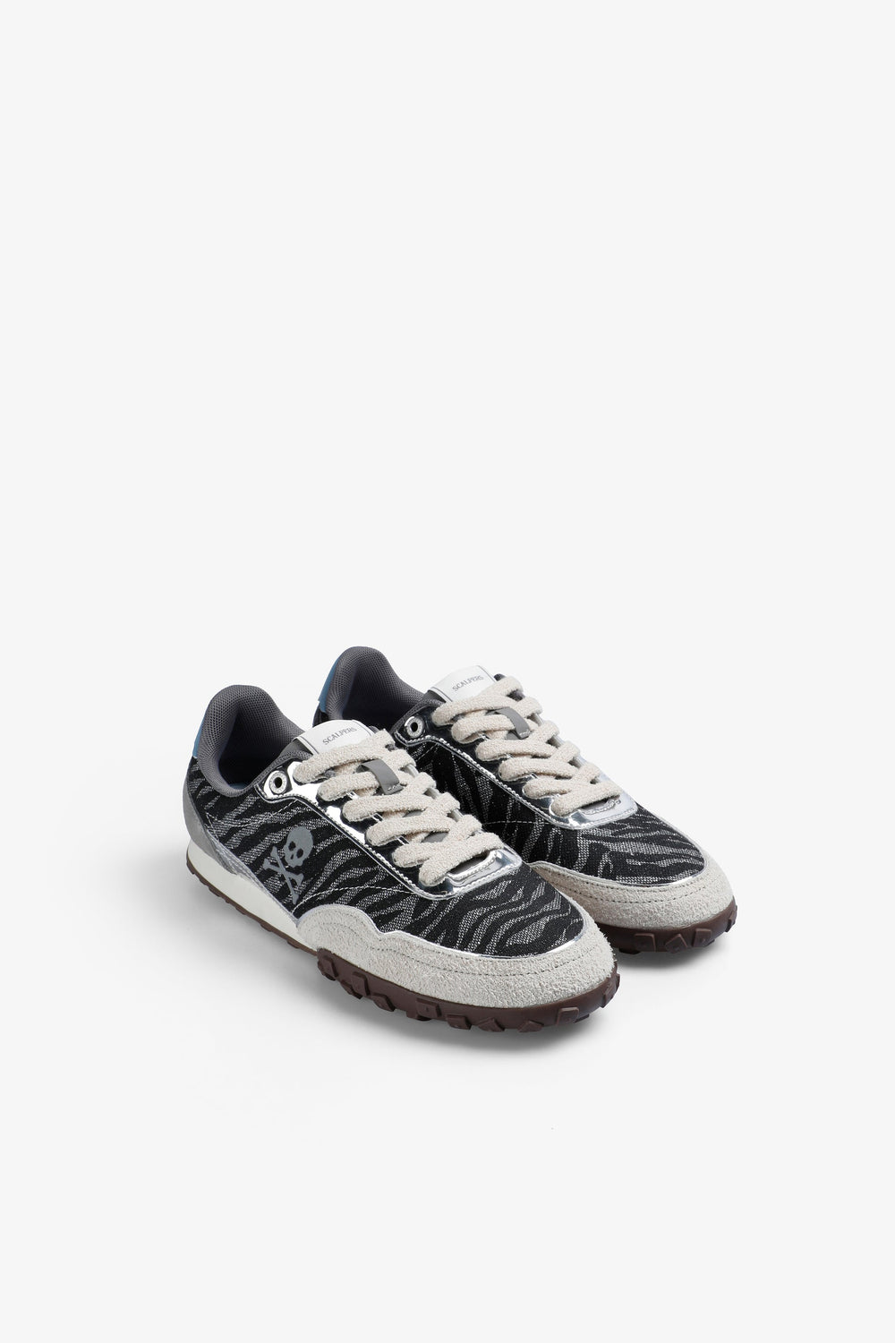 Sneakers with split leather trim. Rubber sole. Zebra print with glitter detail. Double stitching at the toe. Logo detail on the tongue. Skull logo on the side.