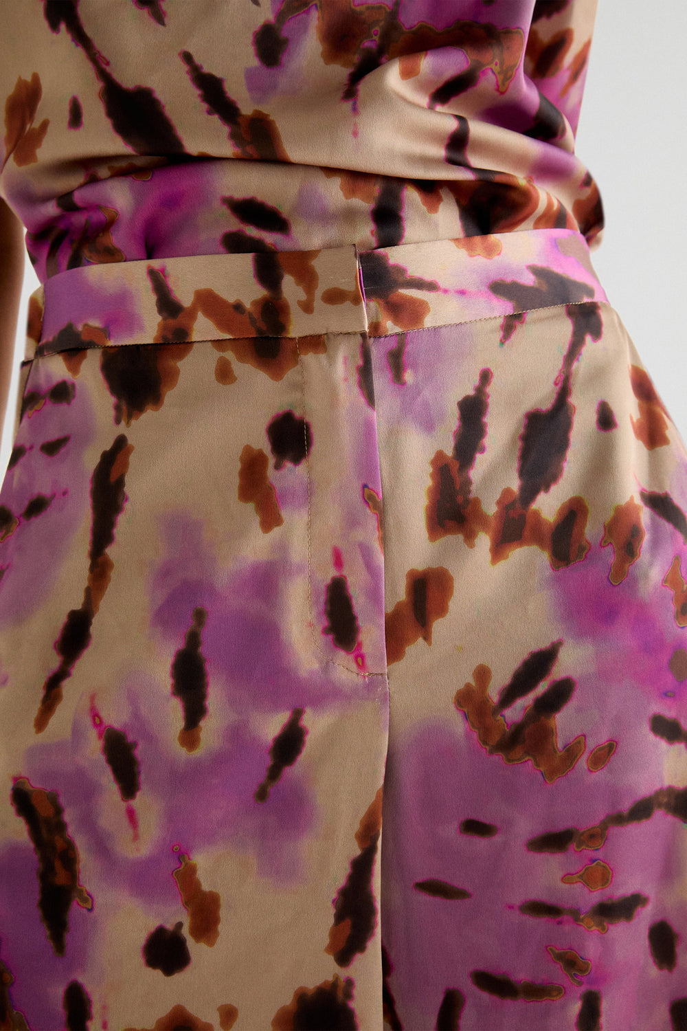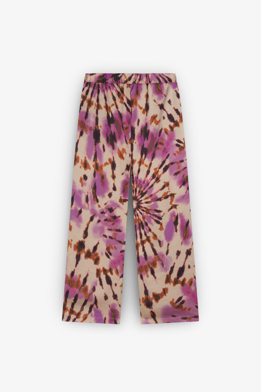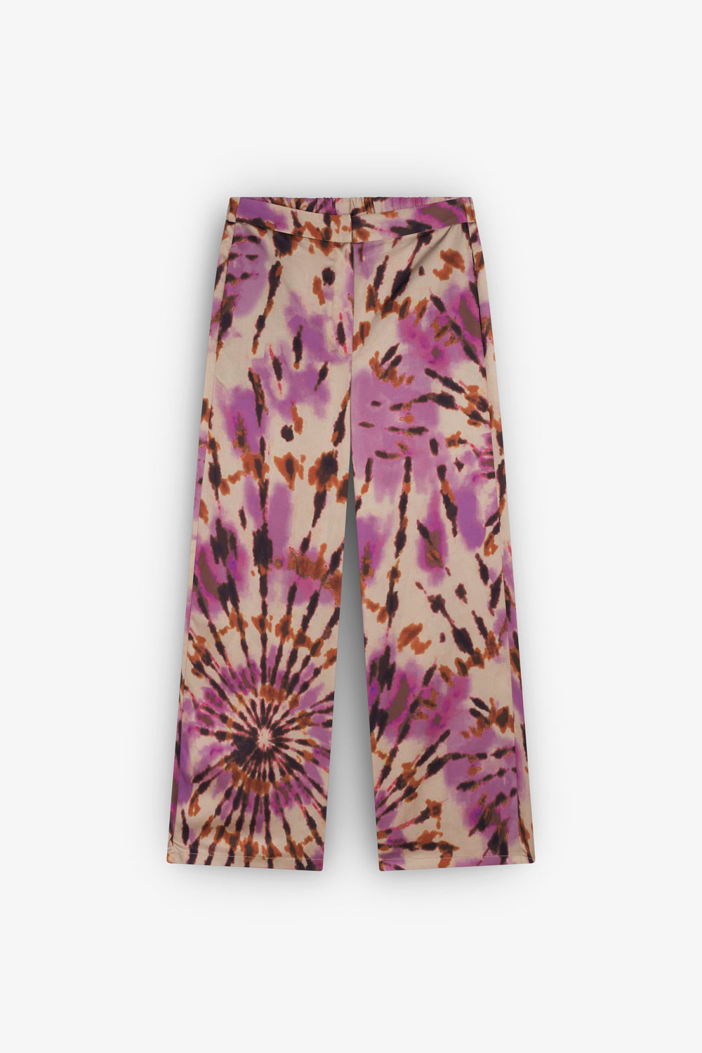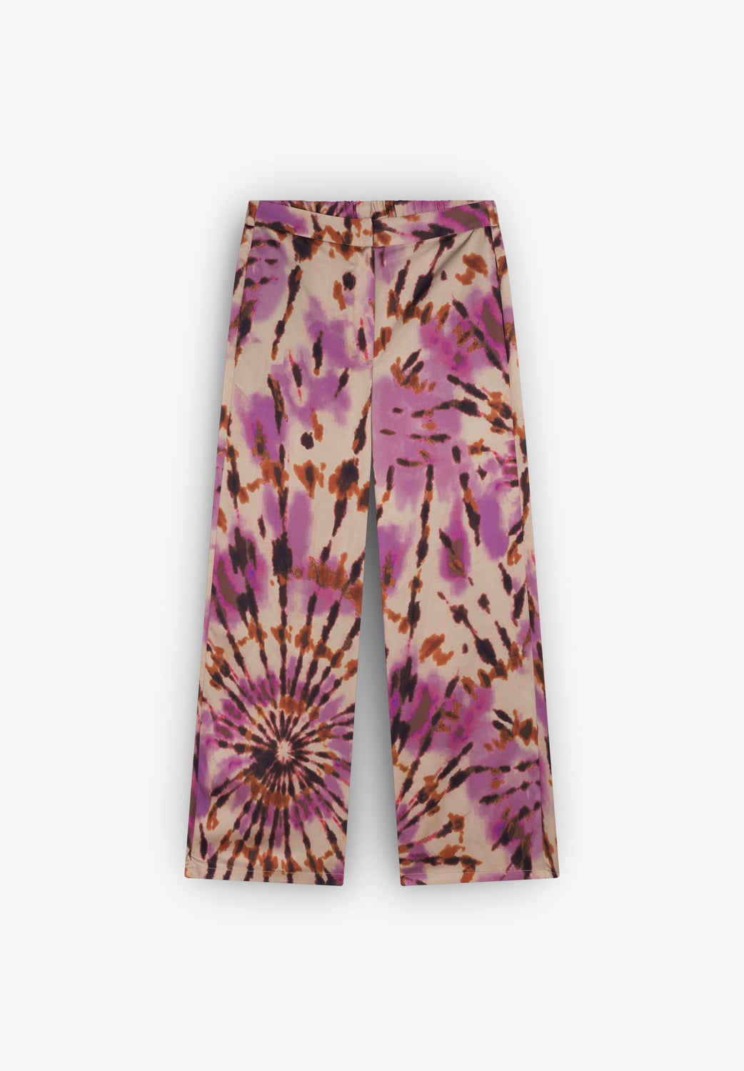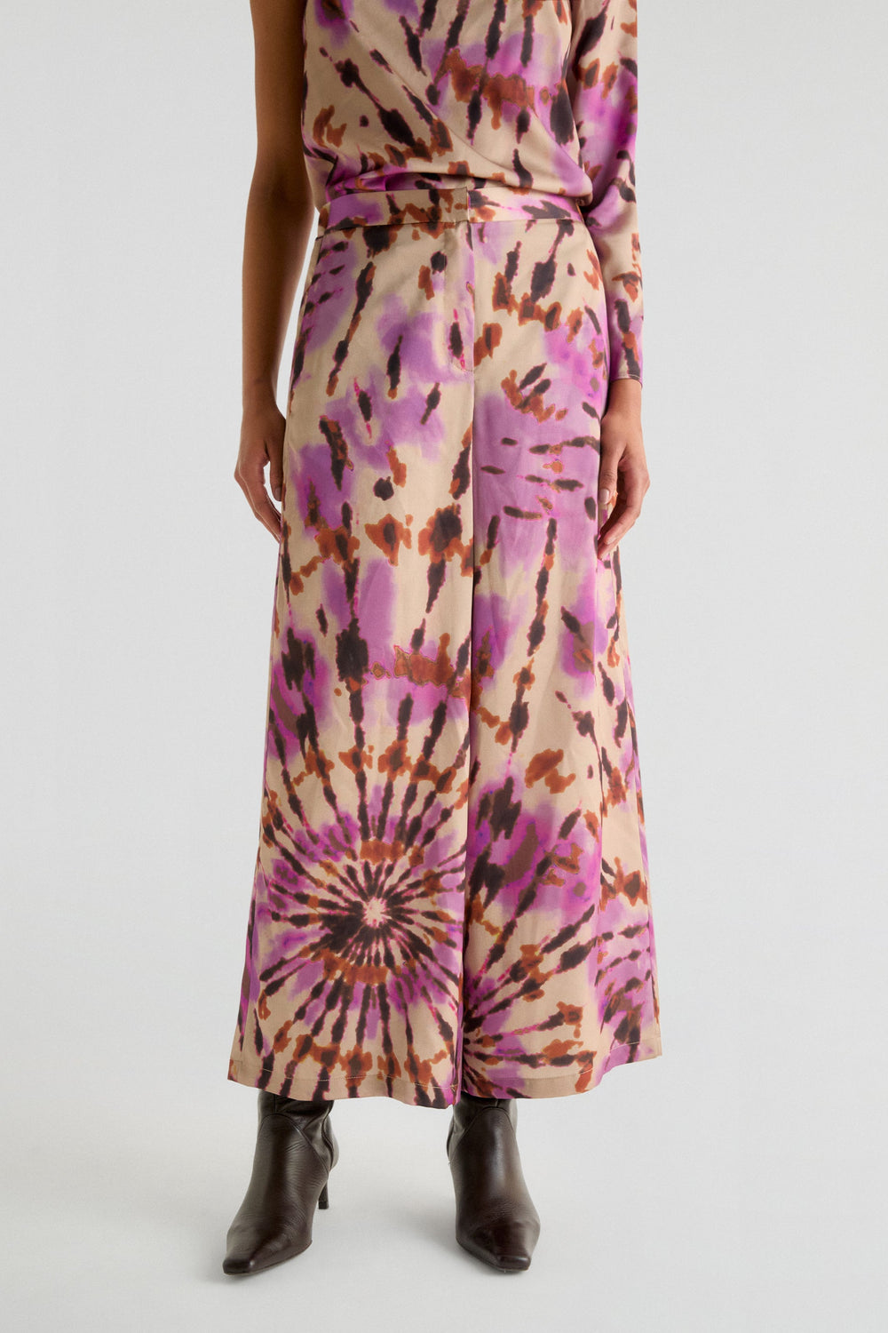 Trousers with a tie-dye print made of flowing fabric. Culotte design and zip and hook fastening.