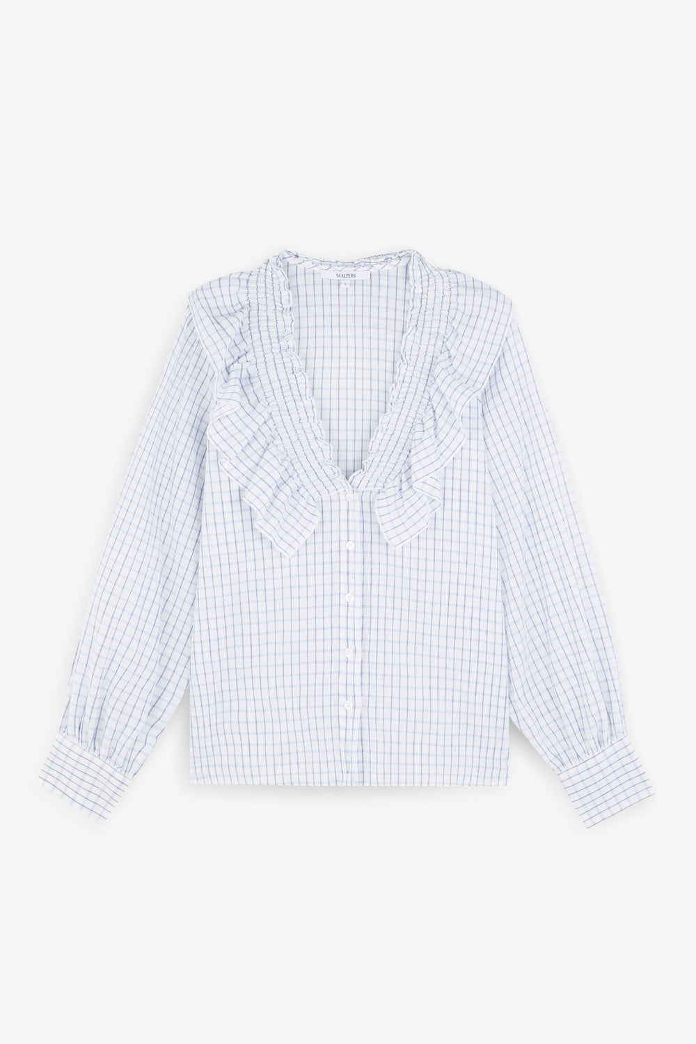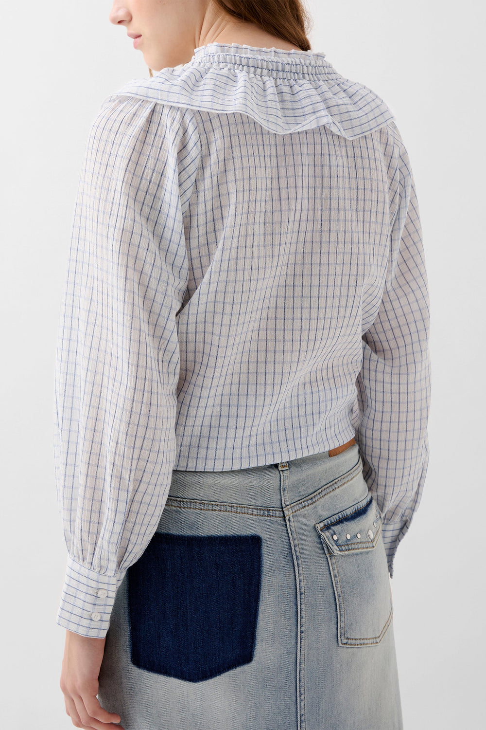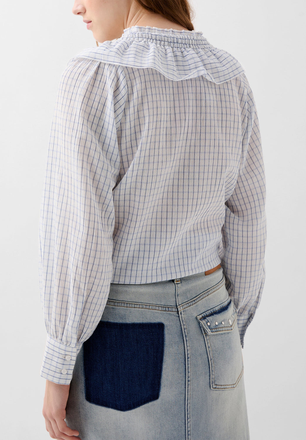 Check blouse made of 100% cotton. V-neck with smocked detail and ruffle on the neckline and top of the back. Regular fit with button fastening. Long puffed sleeves with buttoned cuffs.