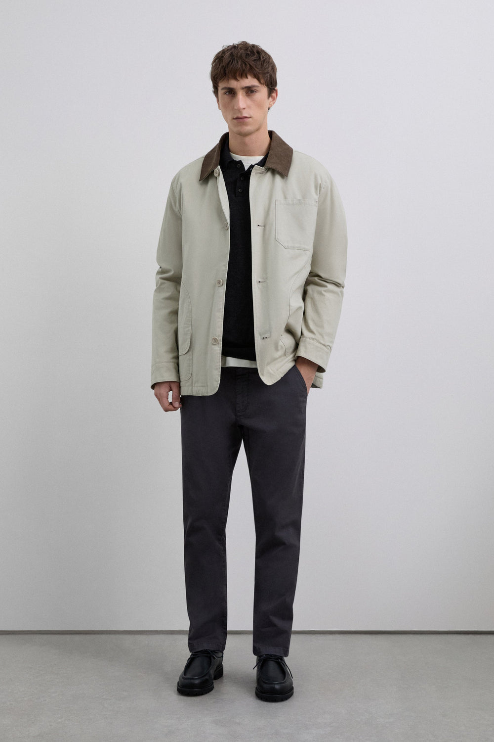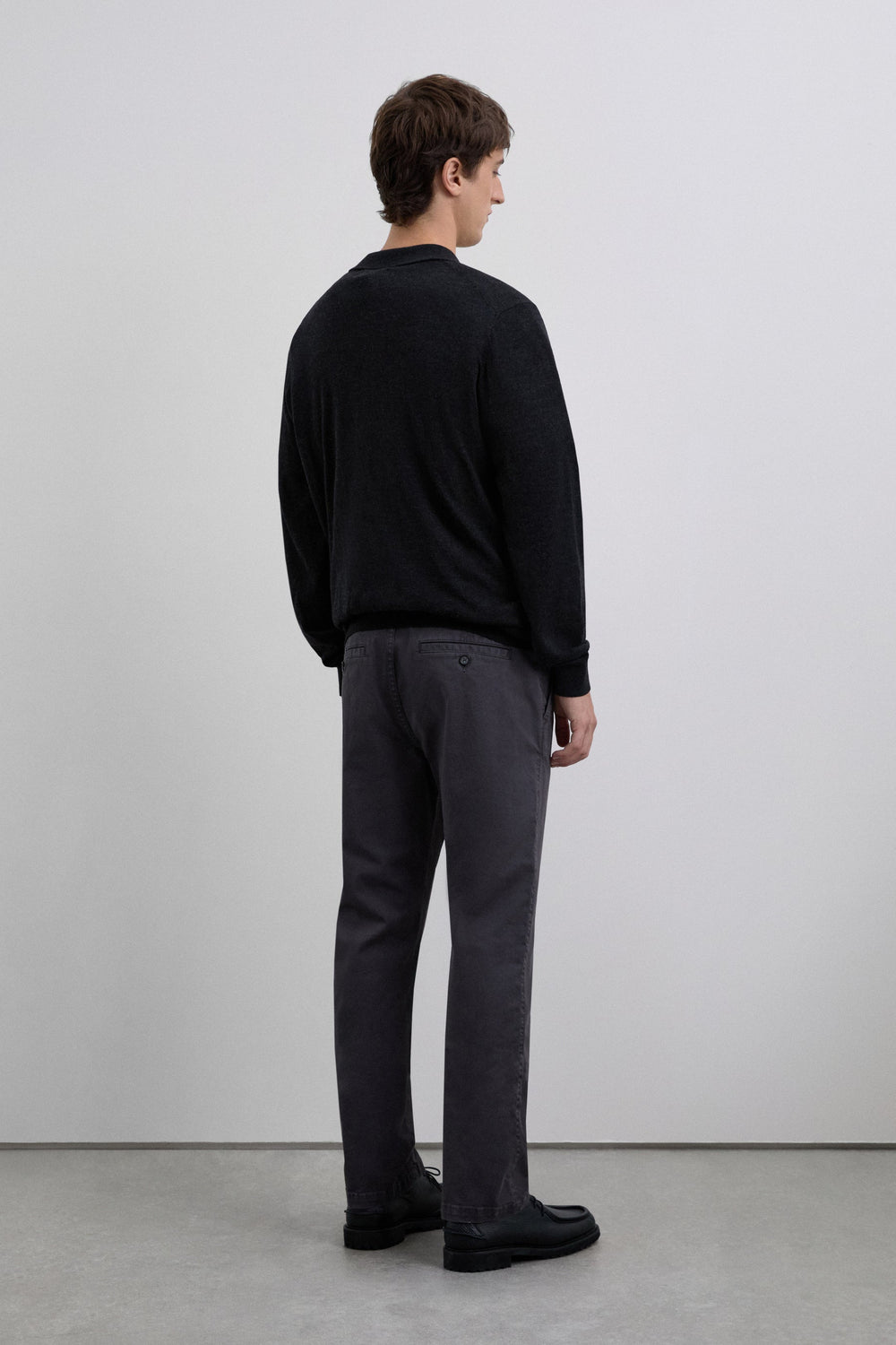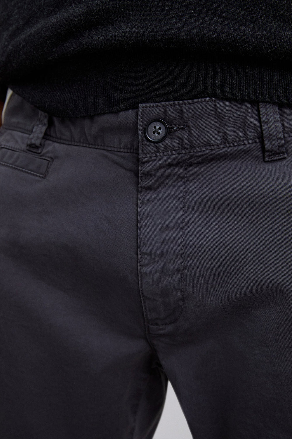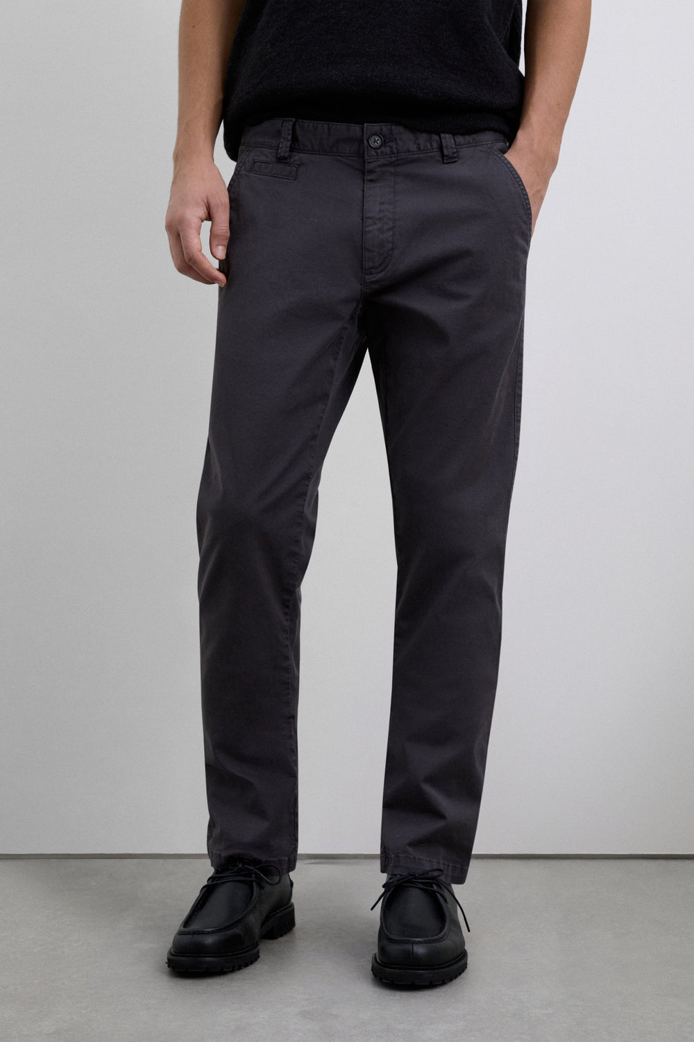 Casual chino trousers made of slightly stretch cotton blend fabric. Button and zip fastening. Side and back pockets. Belt loops at the waist. Inner logo label detail on the belt.