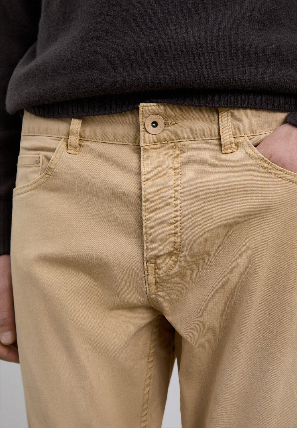 Trousers made of a cotton blend. Slightly stretchy. Button fastening. Regular fit. Back and side pockets. Belt loops.