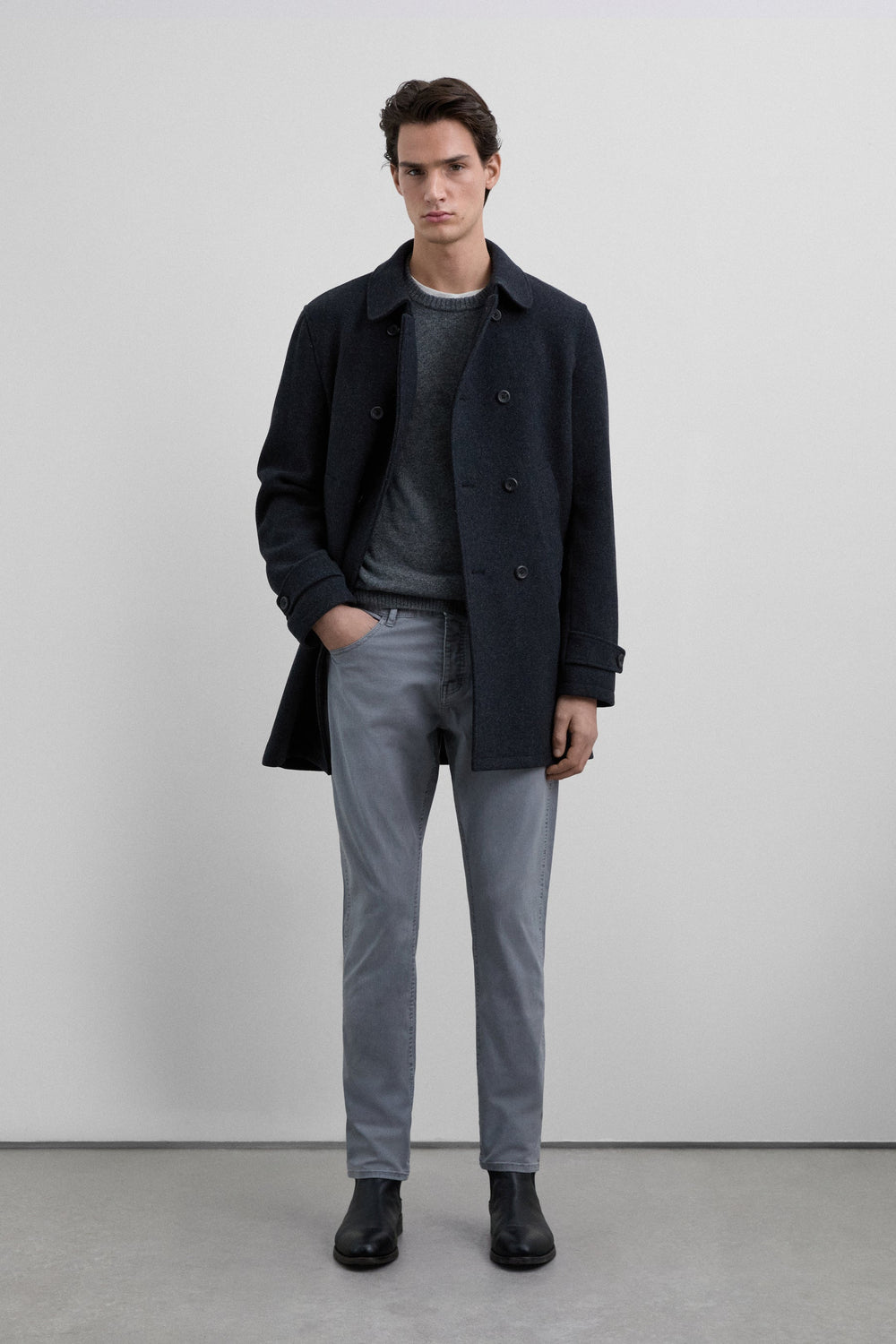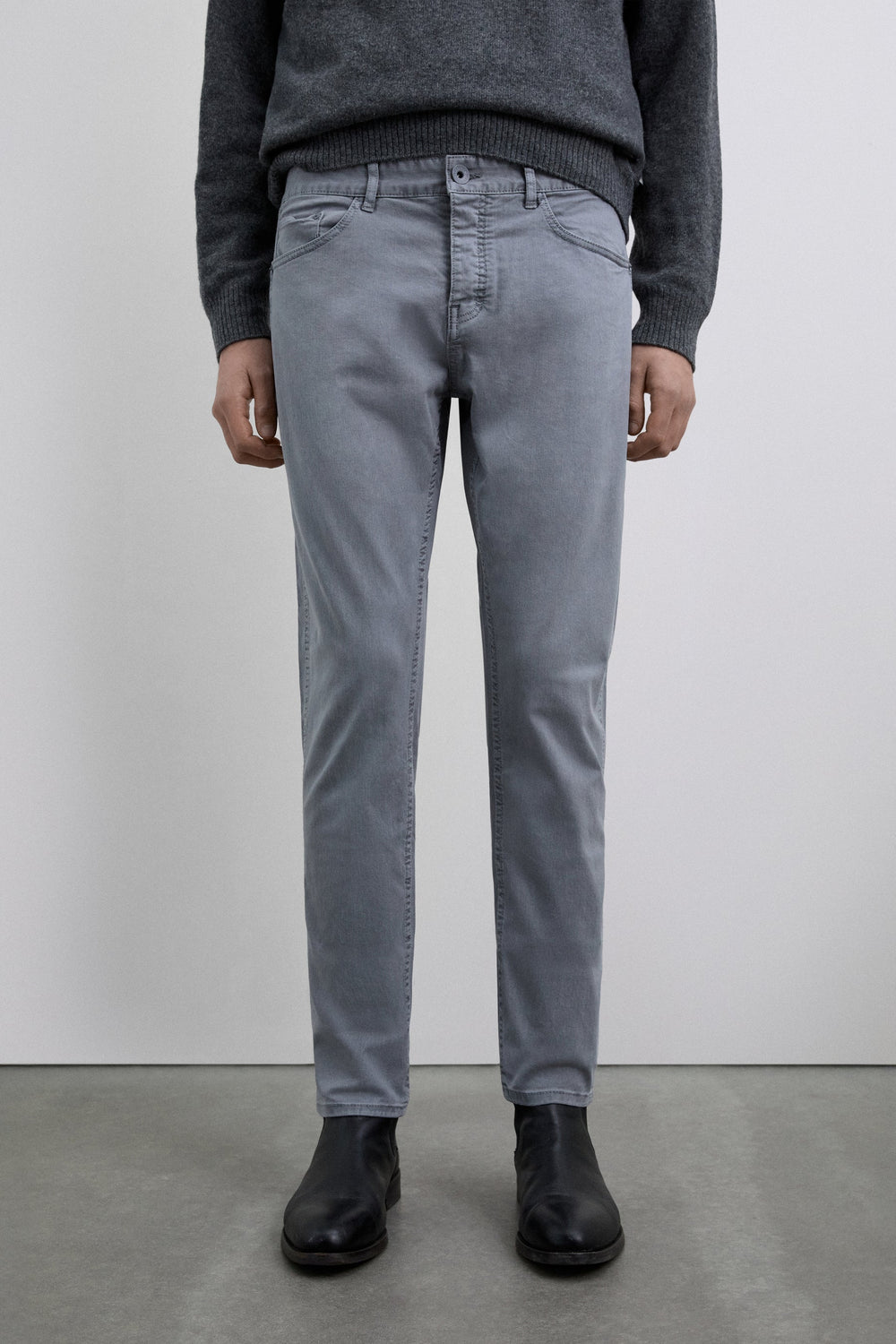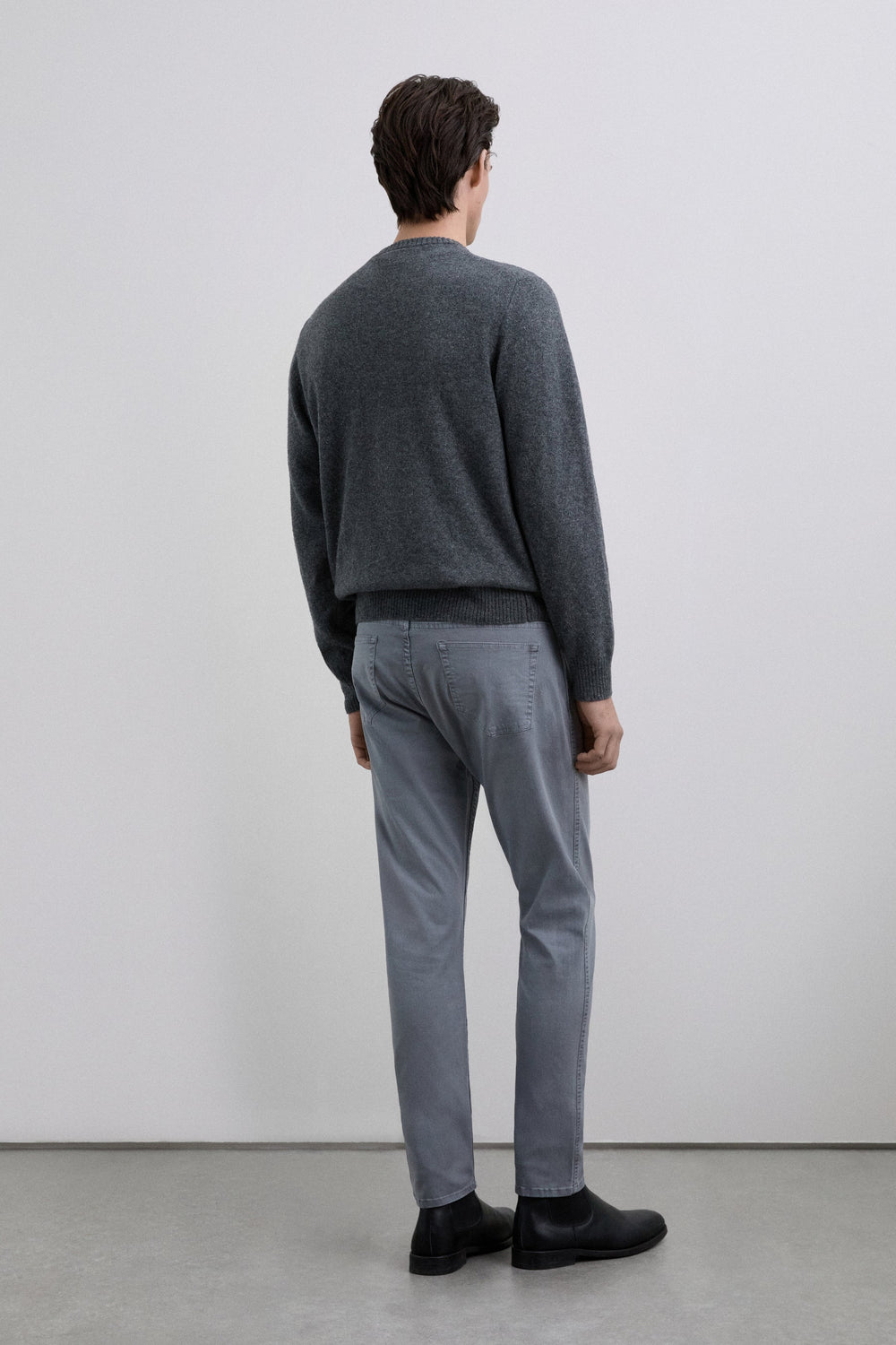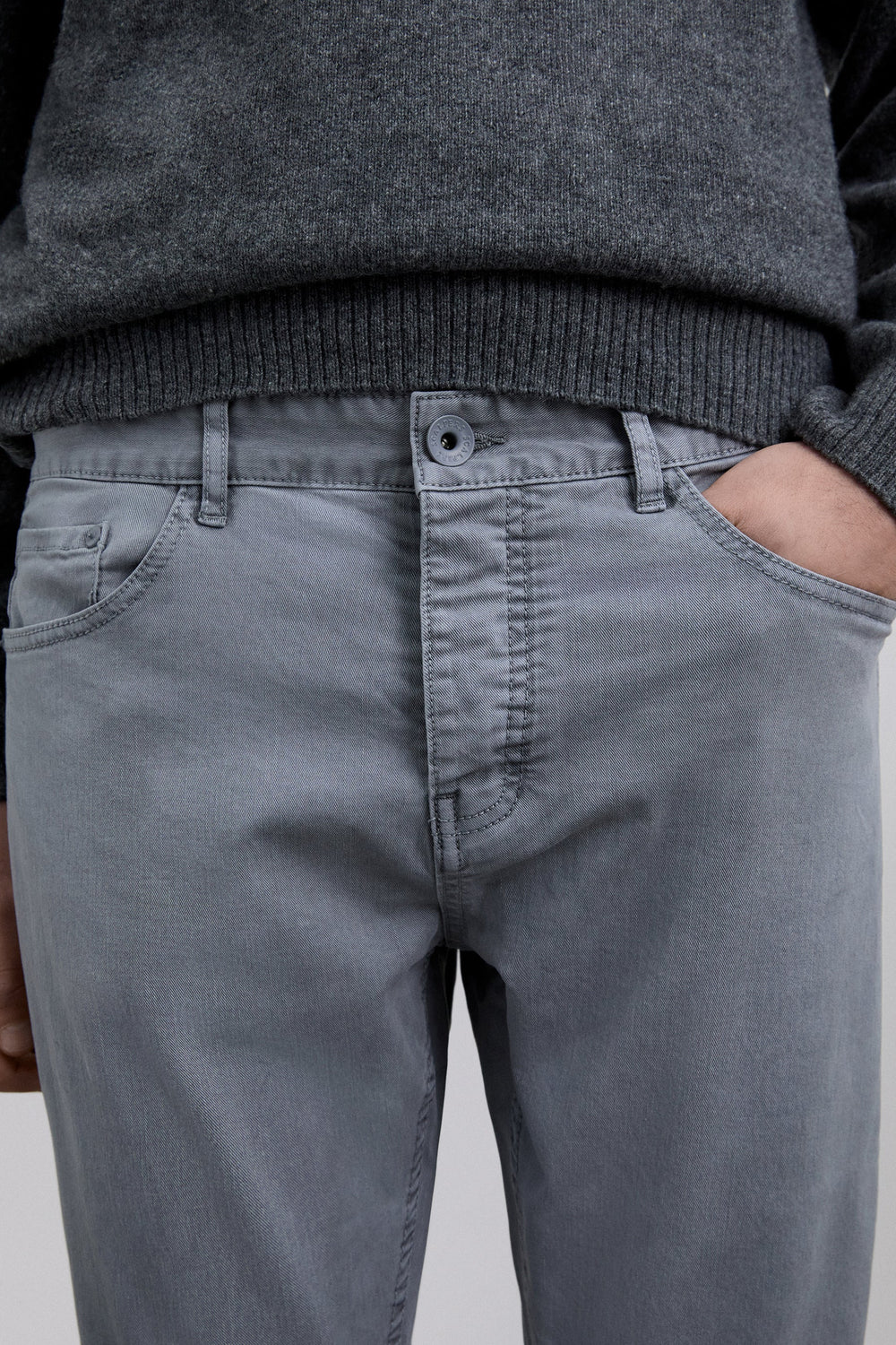 Trousers made of a cotton blend. Slightly stretchy. Button fastening. Regular fit. Back and side pockets. Belt loops.