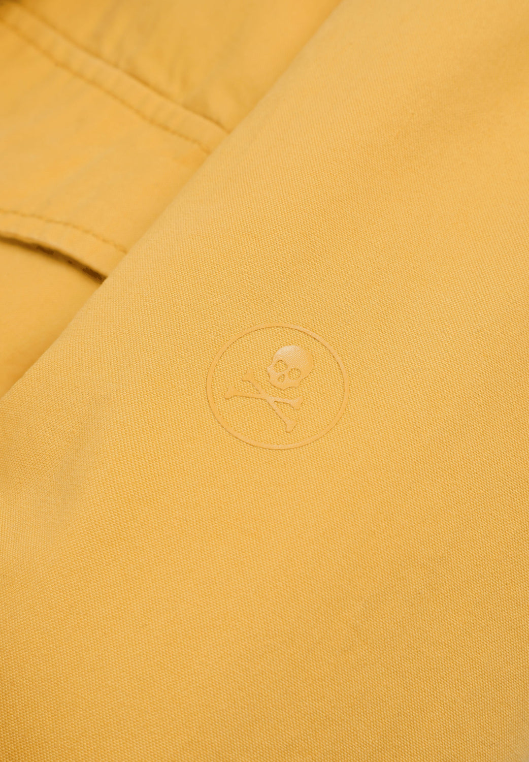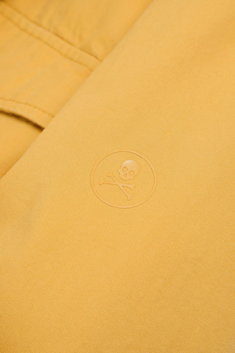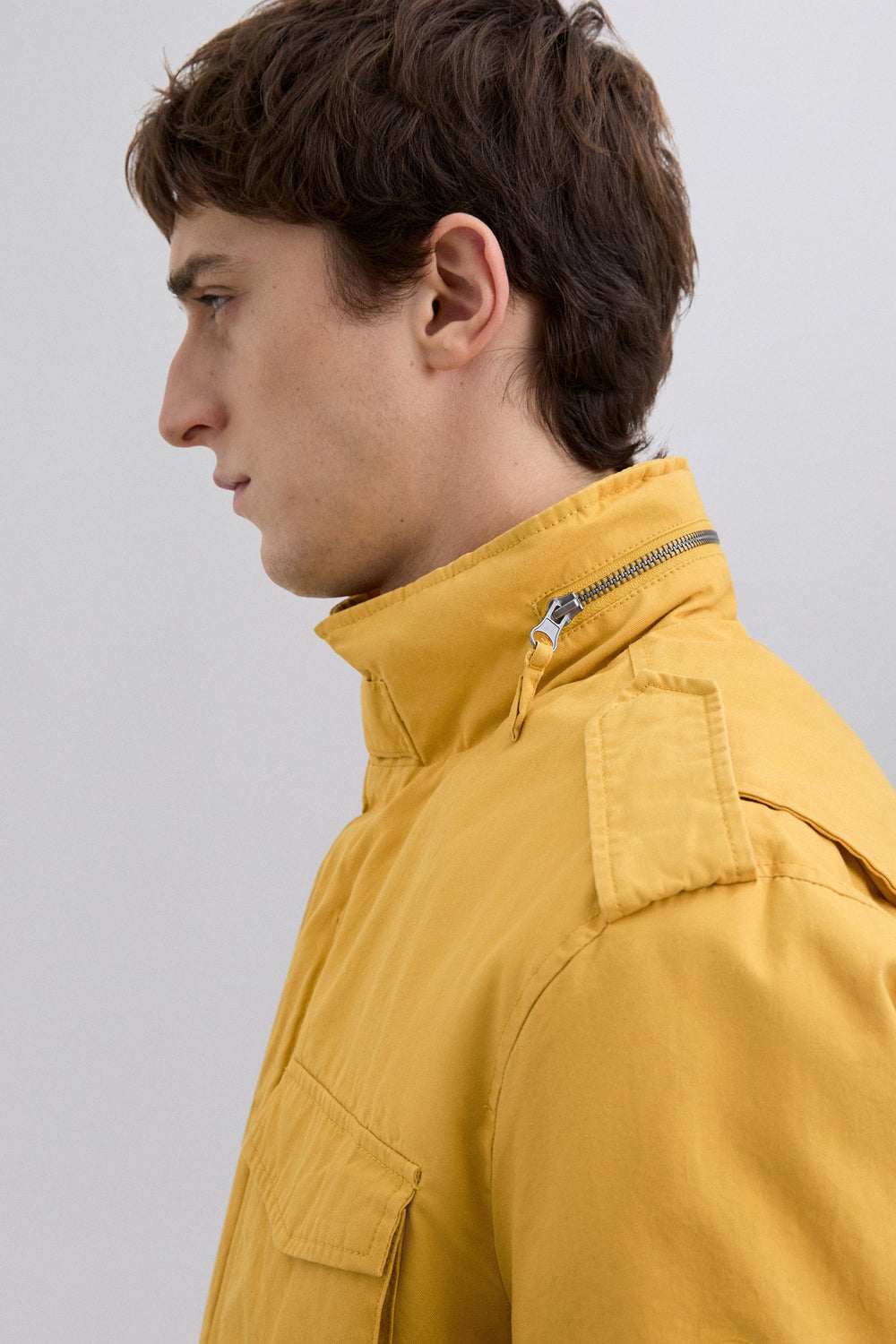 Jacket made of organic cotton. Military style. Four front pockets. Fastening at the neck. Adjustable inner drawstring. Front zip fastening and contrast hood concealed in the collar. Lined with diamond print. Adjustable cuffs. High-density logo detail on the sleeve.