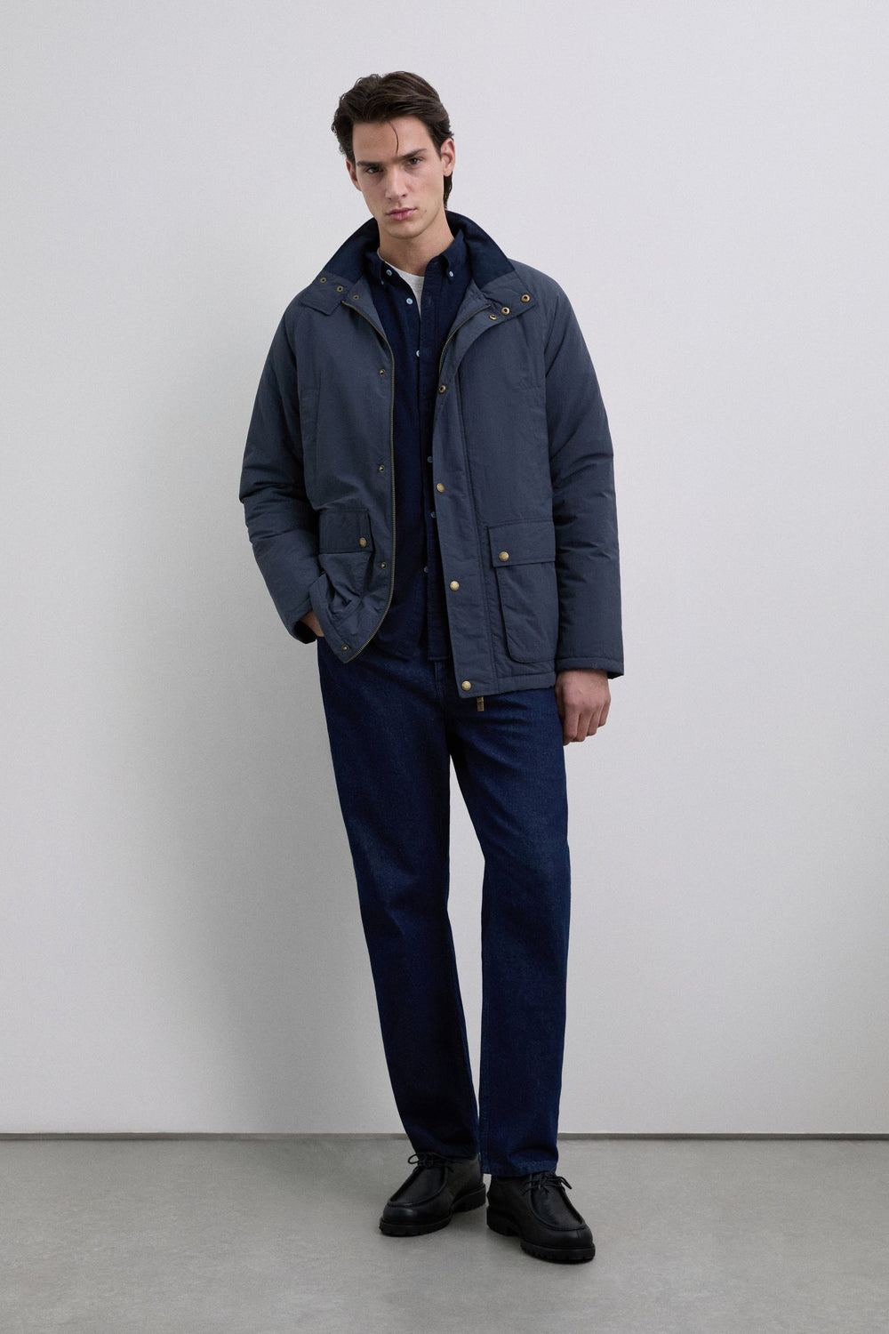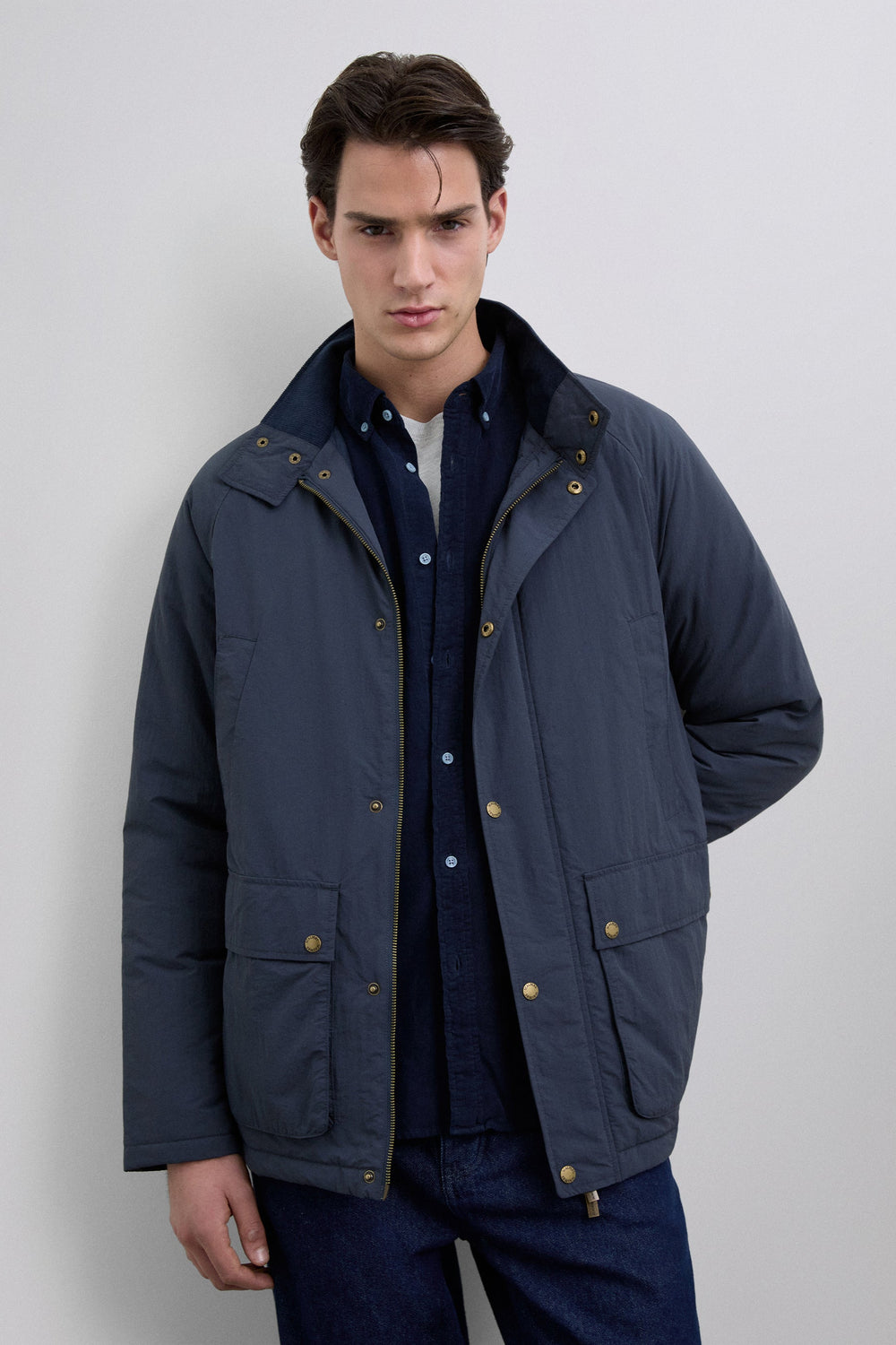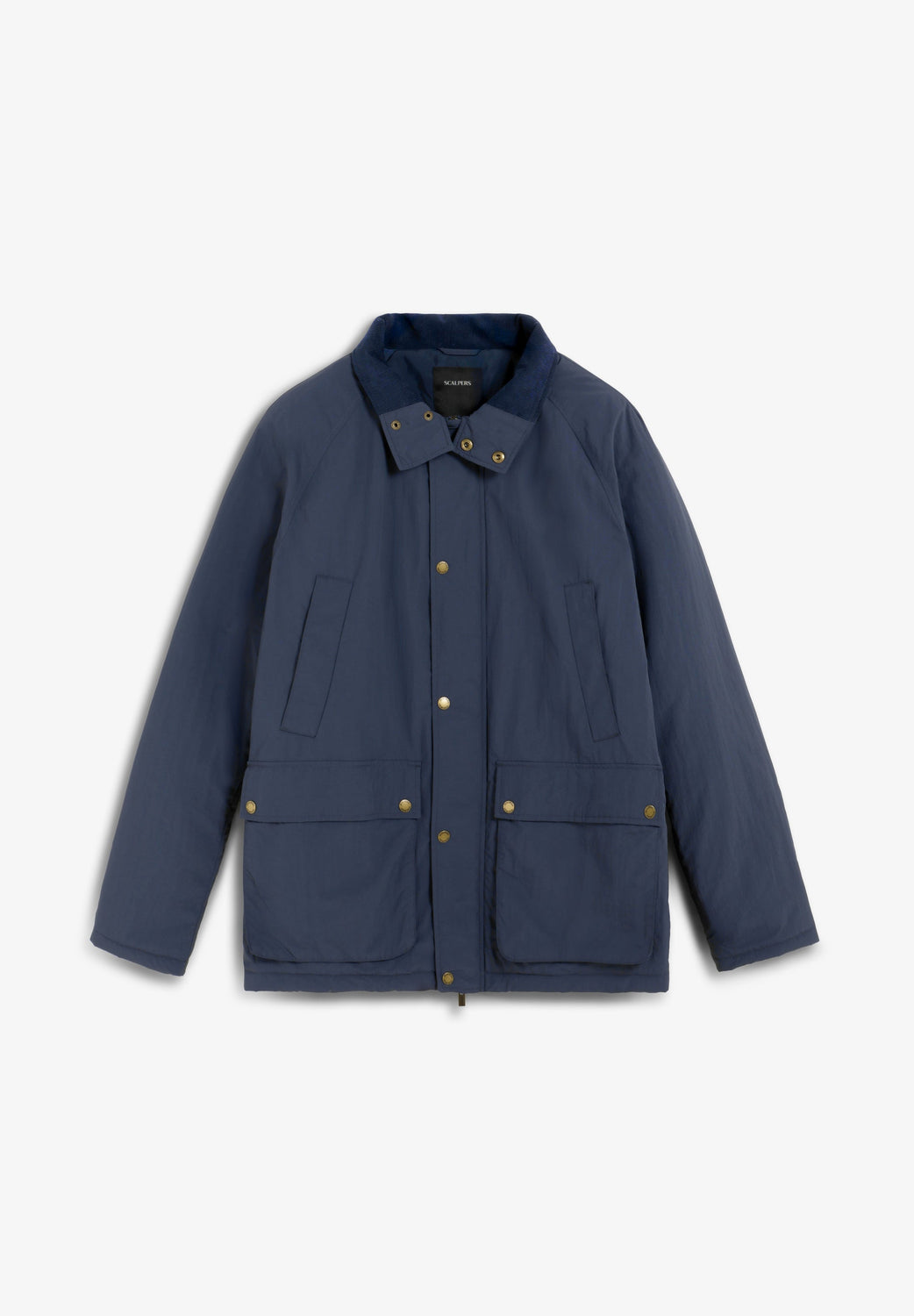 Waterproof technical jacket with raglan sleeves. Four front pockets. Zip and press stud fastening. Scalpers label detail on the side and customised Scalpers pull tab. Tonal corduroy detail inside the collar.