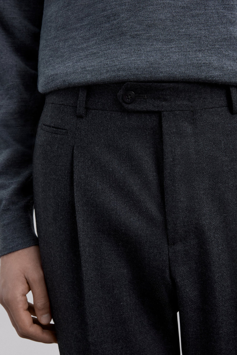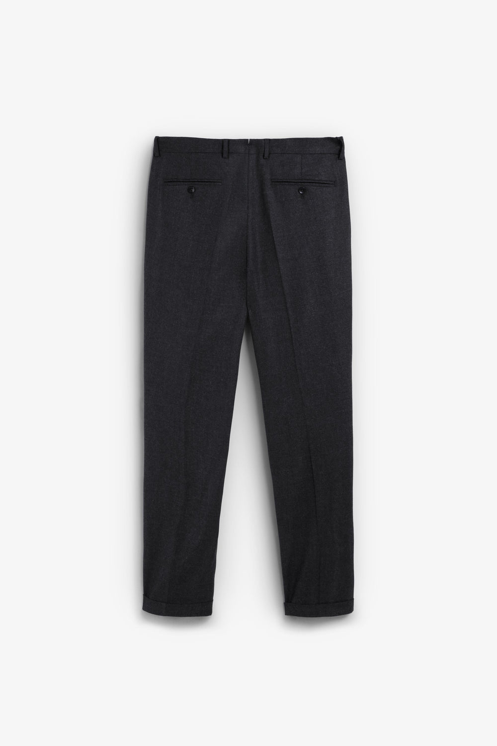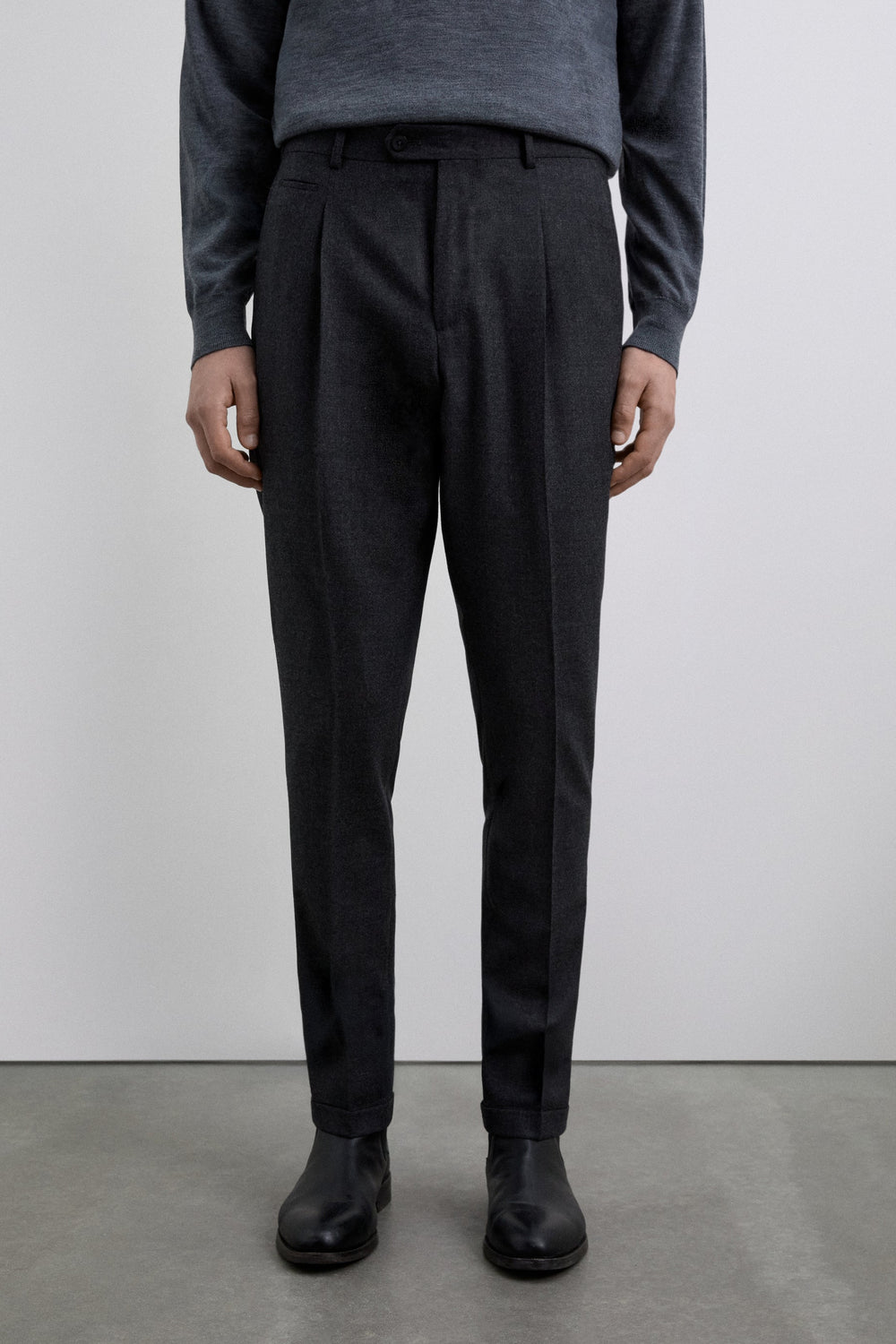 Trousers made of a wool and cotton blend. Front darts. Turn-up hem. Front zip and button fastening. Belt loops at the waist.
