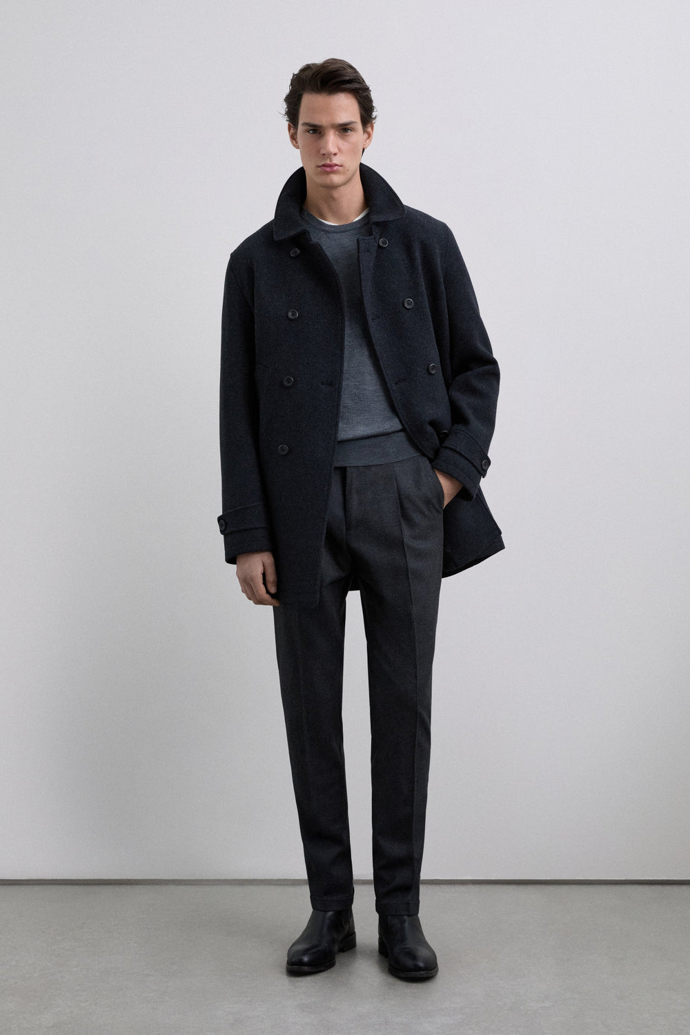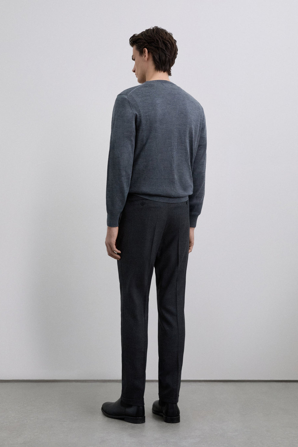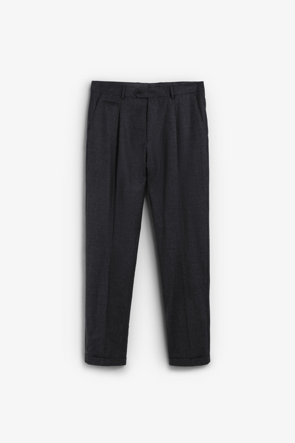 Trousers made of a wool and cotton blend. Front darts. Turn-up hem. Front zip and button fastening. Belt loops at the waist.