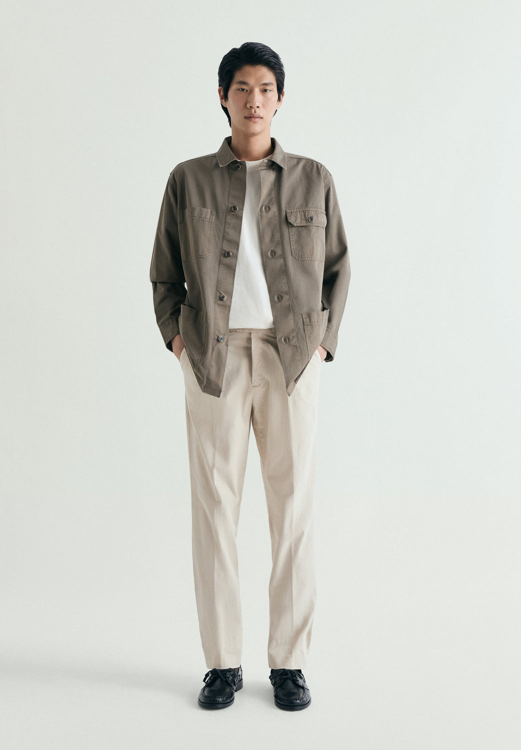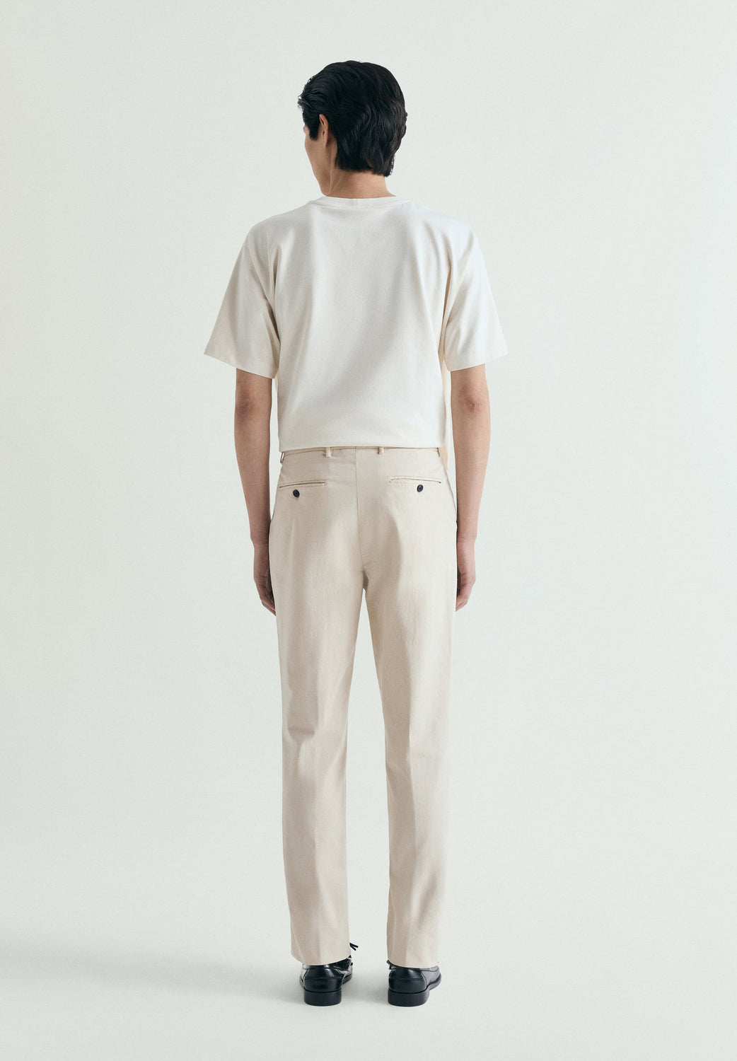 Trousers made of a cotton blend. Front darts. Front button fastening with extended button at the waist. Belt loops. Double piped back pockets with button.