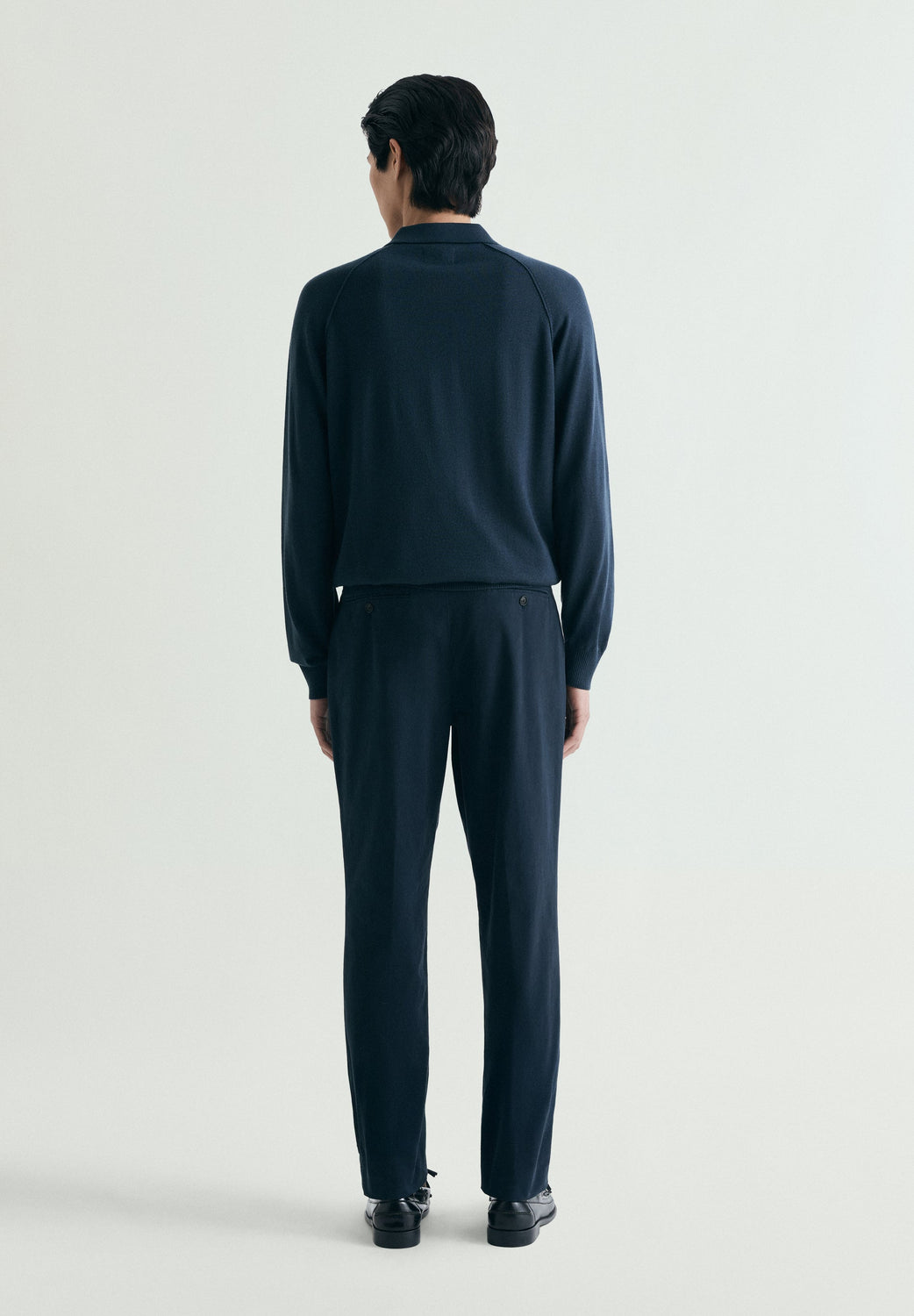 Trousers made of a cotton blend. Front darts. Front button fastening with extended button at the waist. Belt loops. Double piped back pockets with button.
