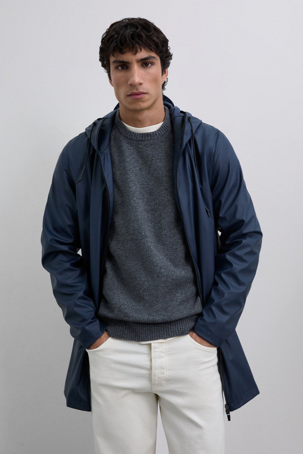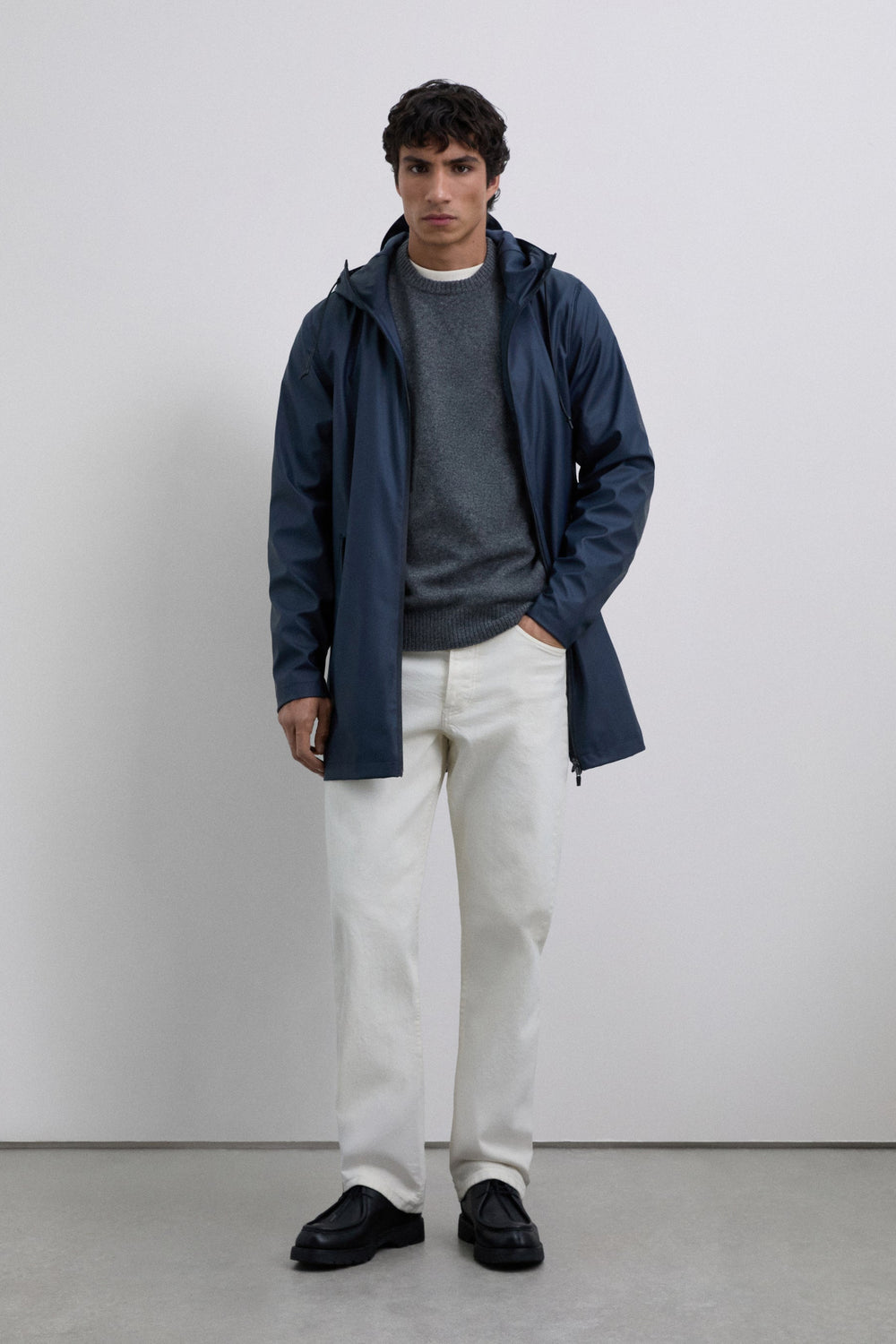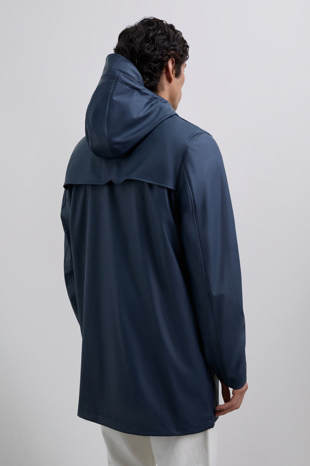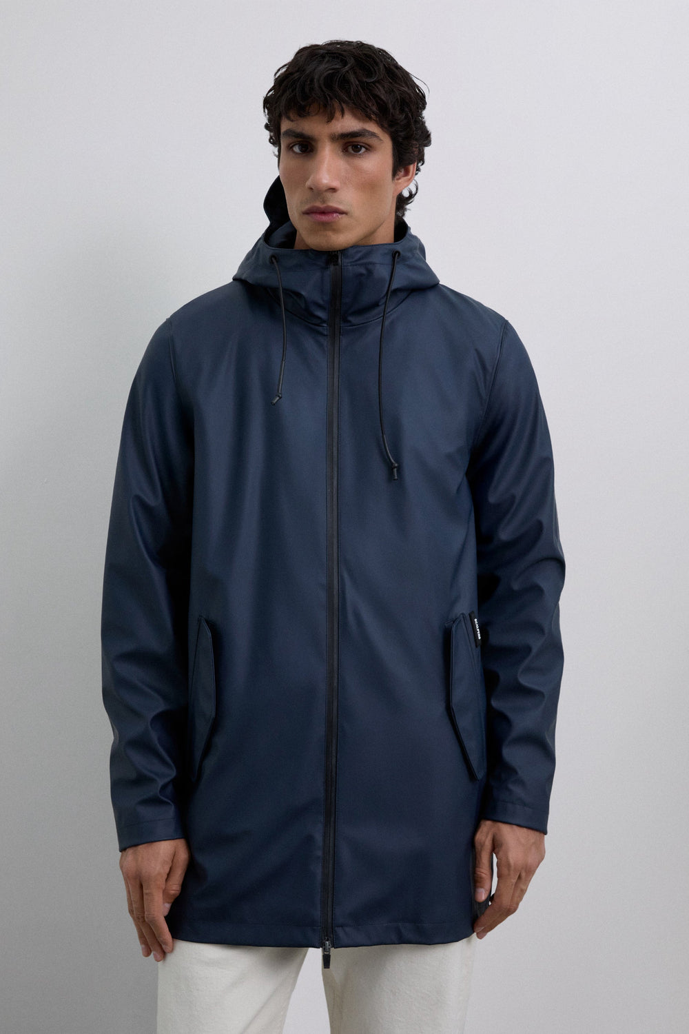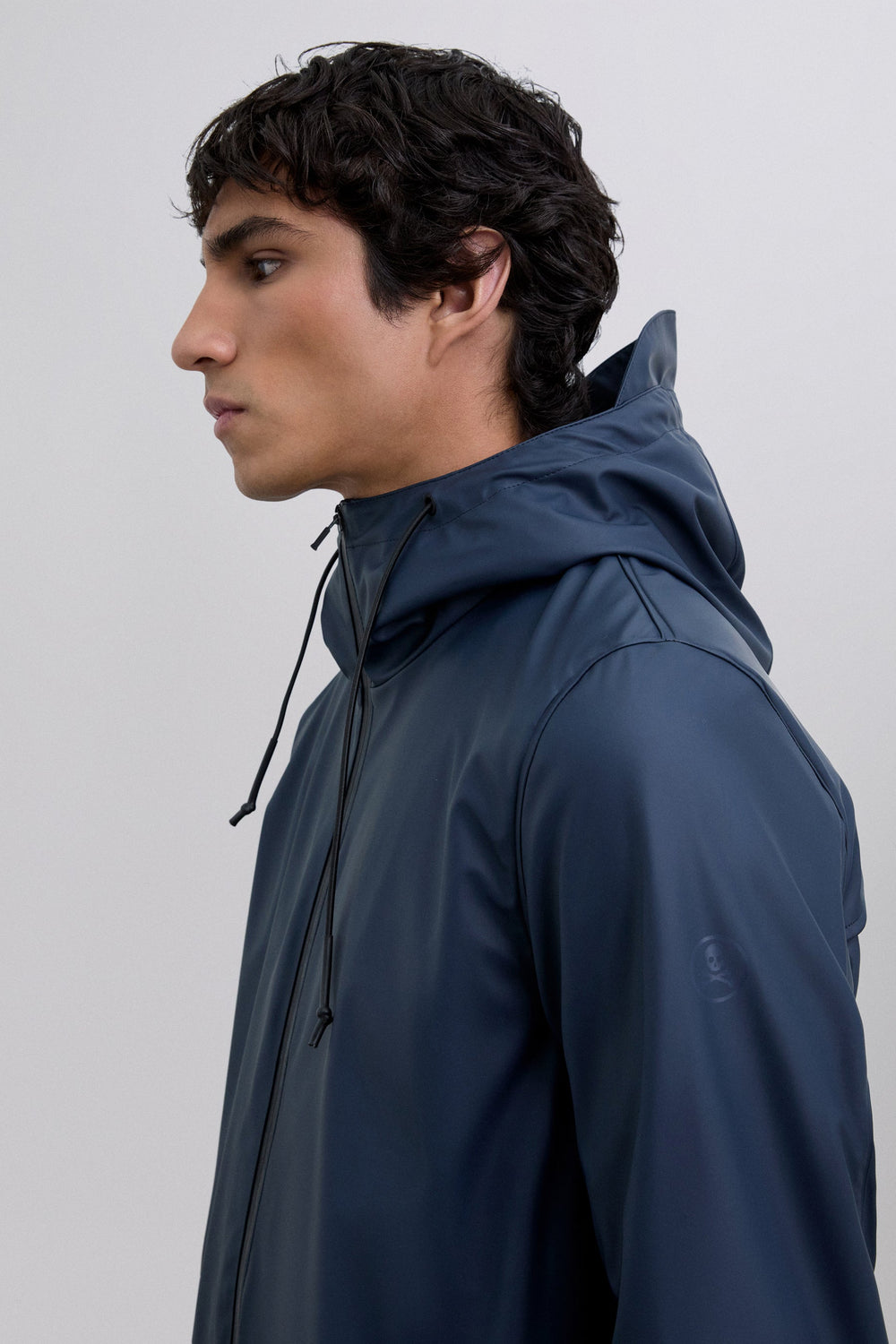 Waterproof jacket. Collar with an adjustable drawstring hood. Double slider thermo-sealed zip fastening. Long sleeves. Side pockets with placket and snap button. Contrast rubberised logo detail on lower front and matching skull on zip.
