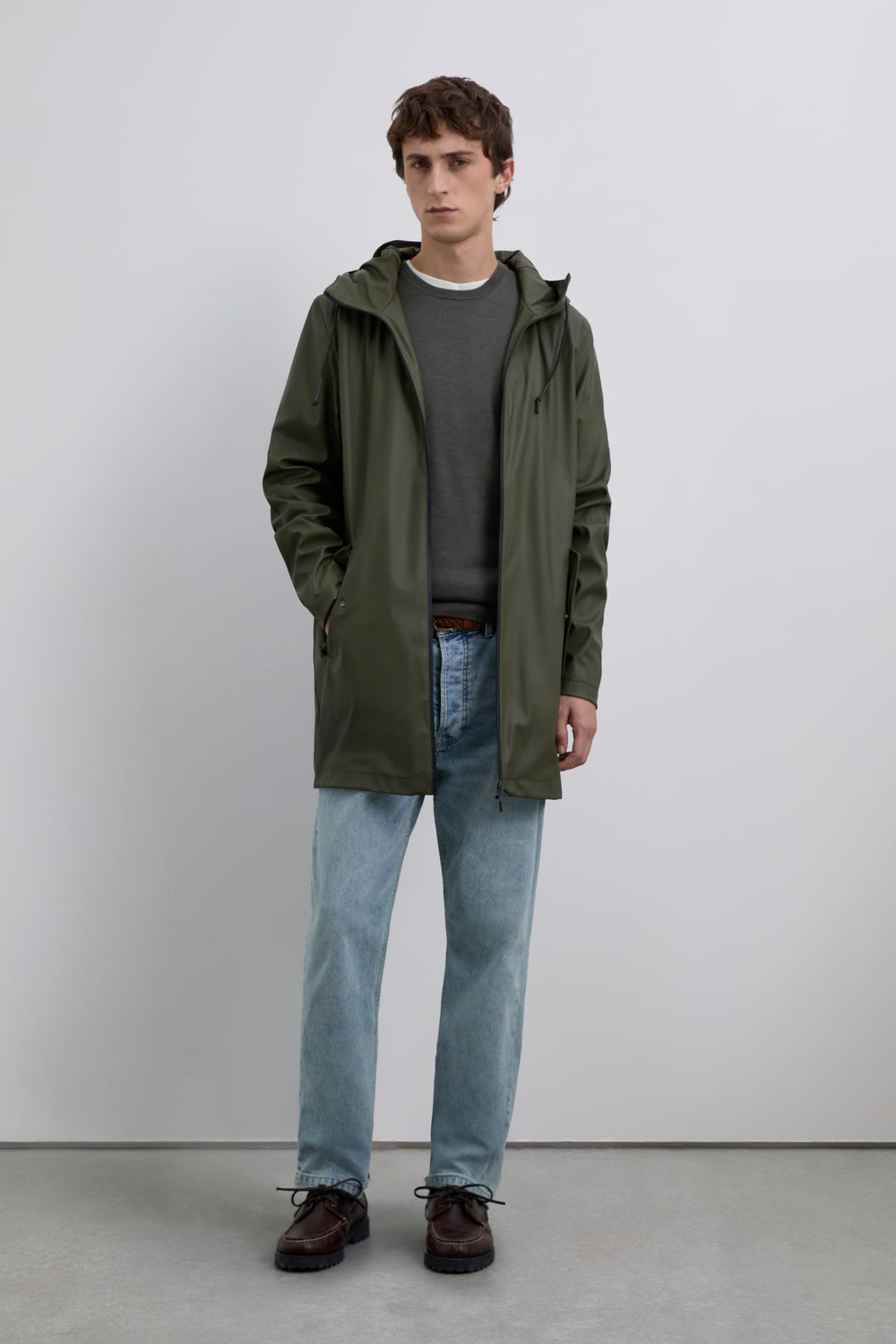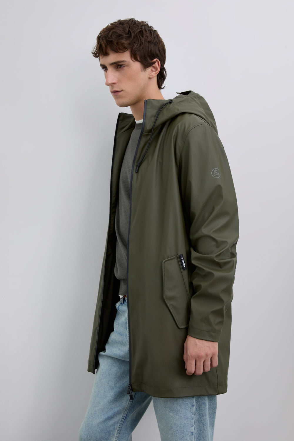 Waterproof jacket. Collar with an adjustable drawstring hood. Double slider thermo-sealed zip fastening. Long sleeves. Side pockets with placket and snap button. Contrast rubberised logo detail on lower front and matching skull on zip.