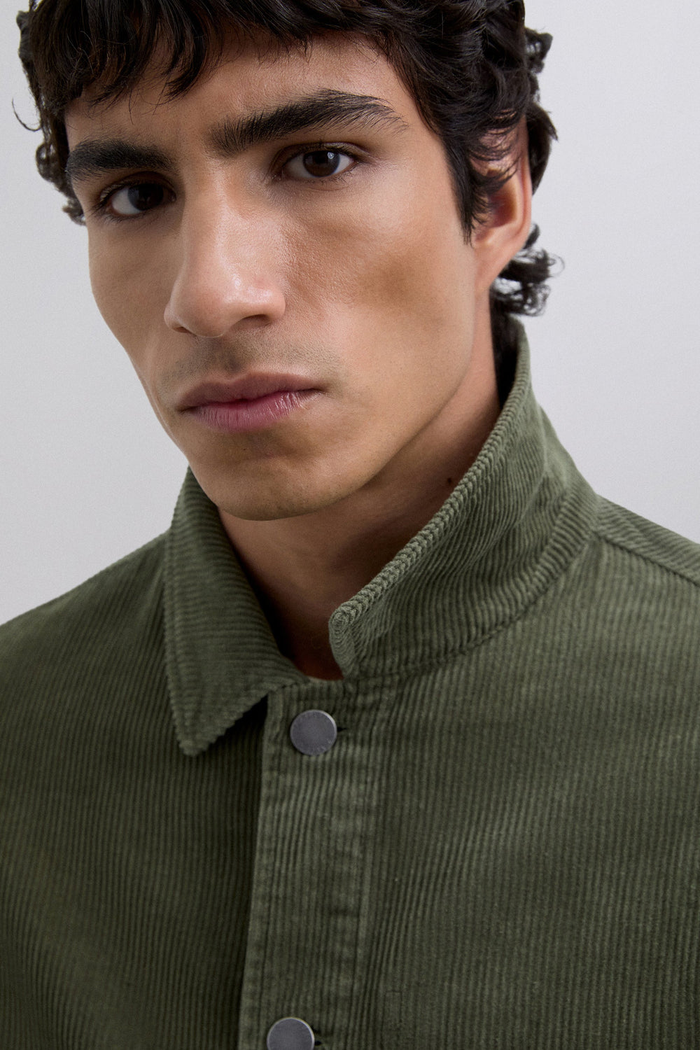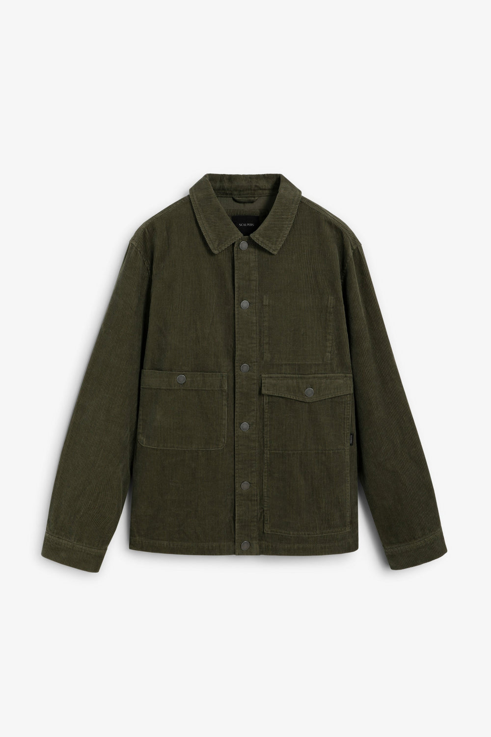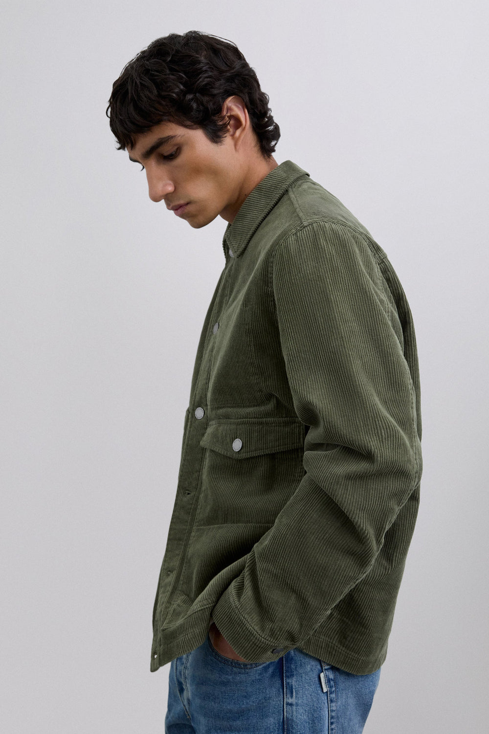 Corduroy overshirt made of 100% BCI cotton. Long sleeves. Shirt collar. Front button fastening. Two front pockets with flaps and patch design. Buttoned cuffs. Logo detail on buttons and label.