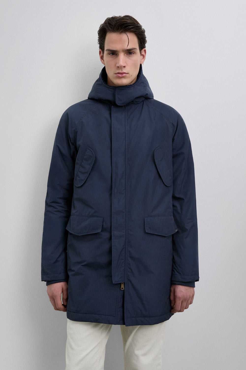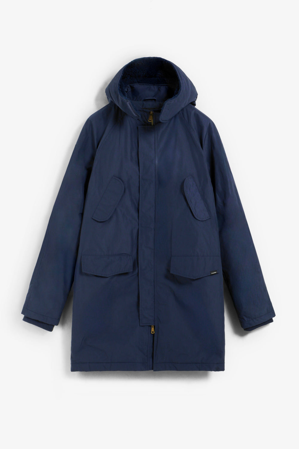 Waterproof parka with hood. Front zip fastening. Long sleeves. Padded garment with quilting. Four front pockets, two slanted flap pockets and two straight lower pockets. Thermolite filling. Fleece detail on the hood. Velcro neck fastening. Rubber logo patch detail on the pocket and skull print on the sleeve.