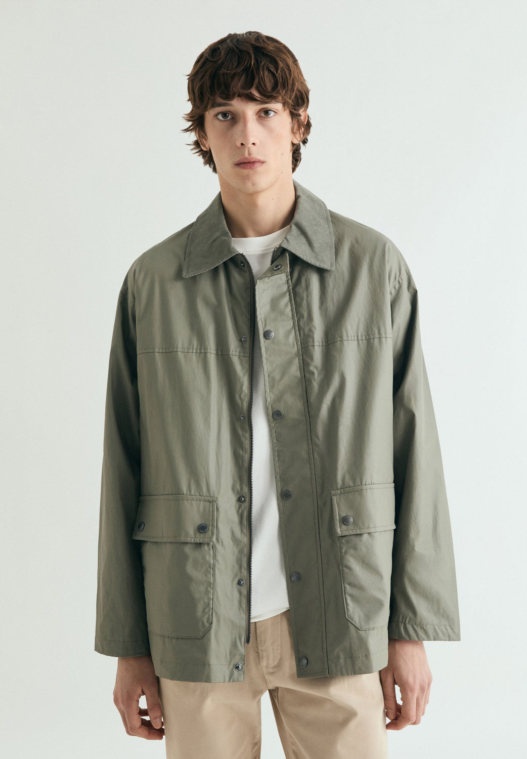 Jacket made of 100% BCI cotton. Waxed effect fabric. Two front pockets. Corduroy detail on collar and inside pocket. Front zip fastening concealed by placket with press-studs.