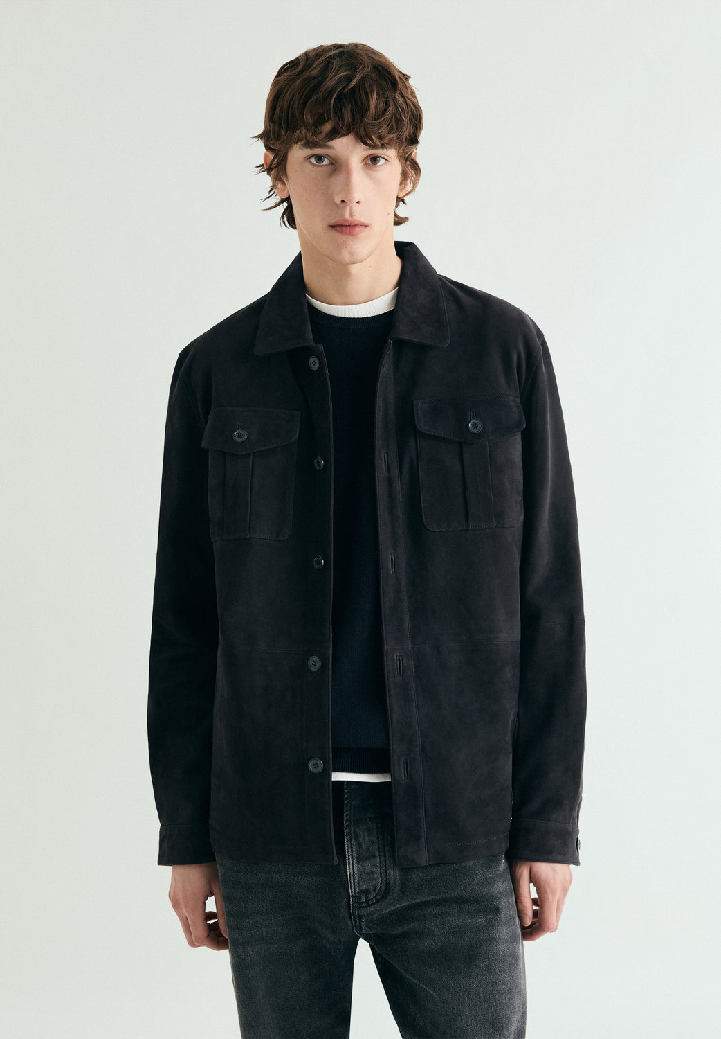 Overshirt made of 100% suede. Two chest pockets. Adjustable cuffs. Mother-of-pearl button fastening.