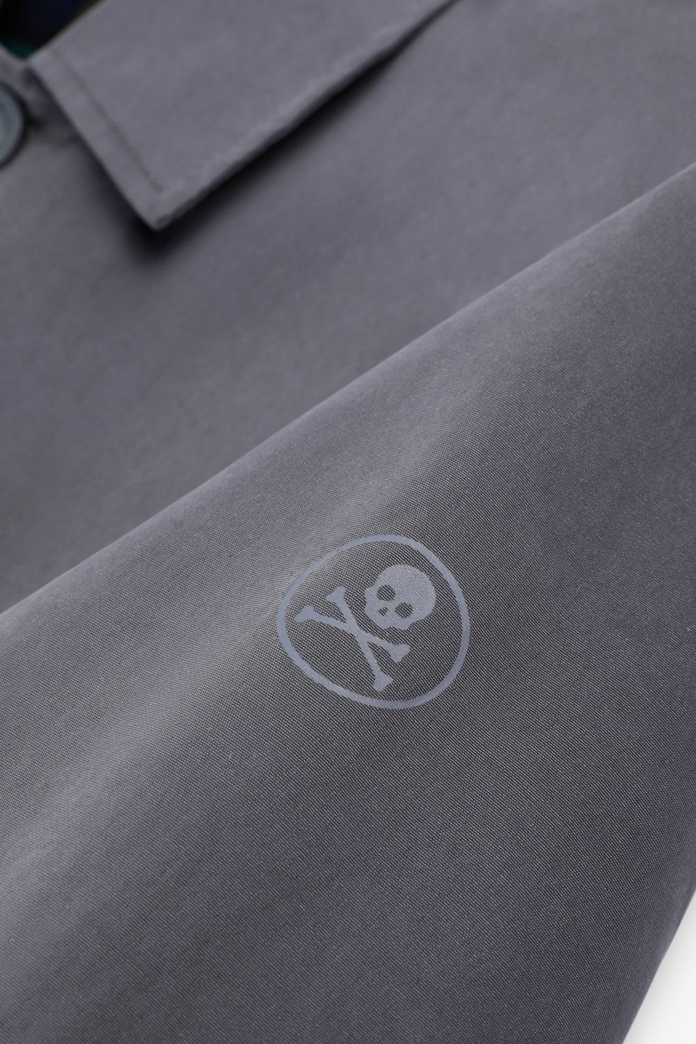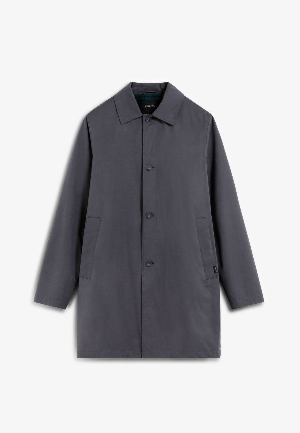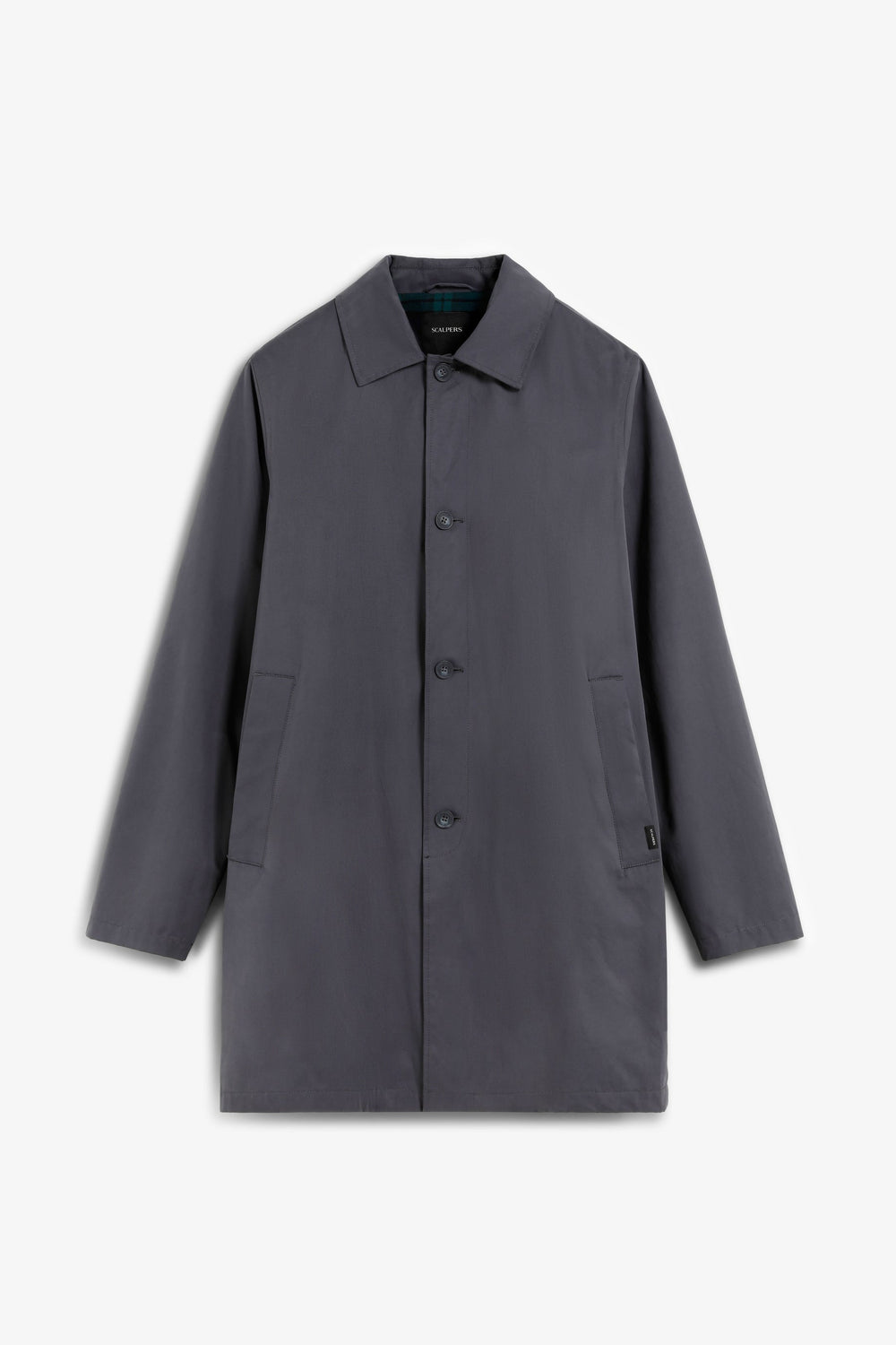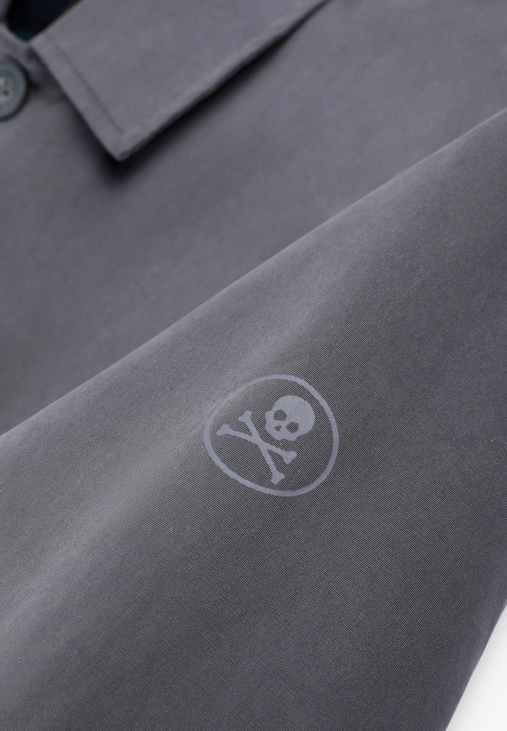 Trench coat with front button fastening. Shirt collar. Two front slant pockets. Stitching details along the length of the garment. Front button fastening. Checked lining. Logo label detail on pocket and inside pocket and skull print on sleeve.