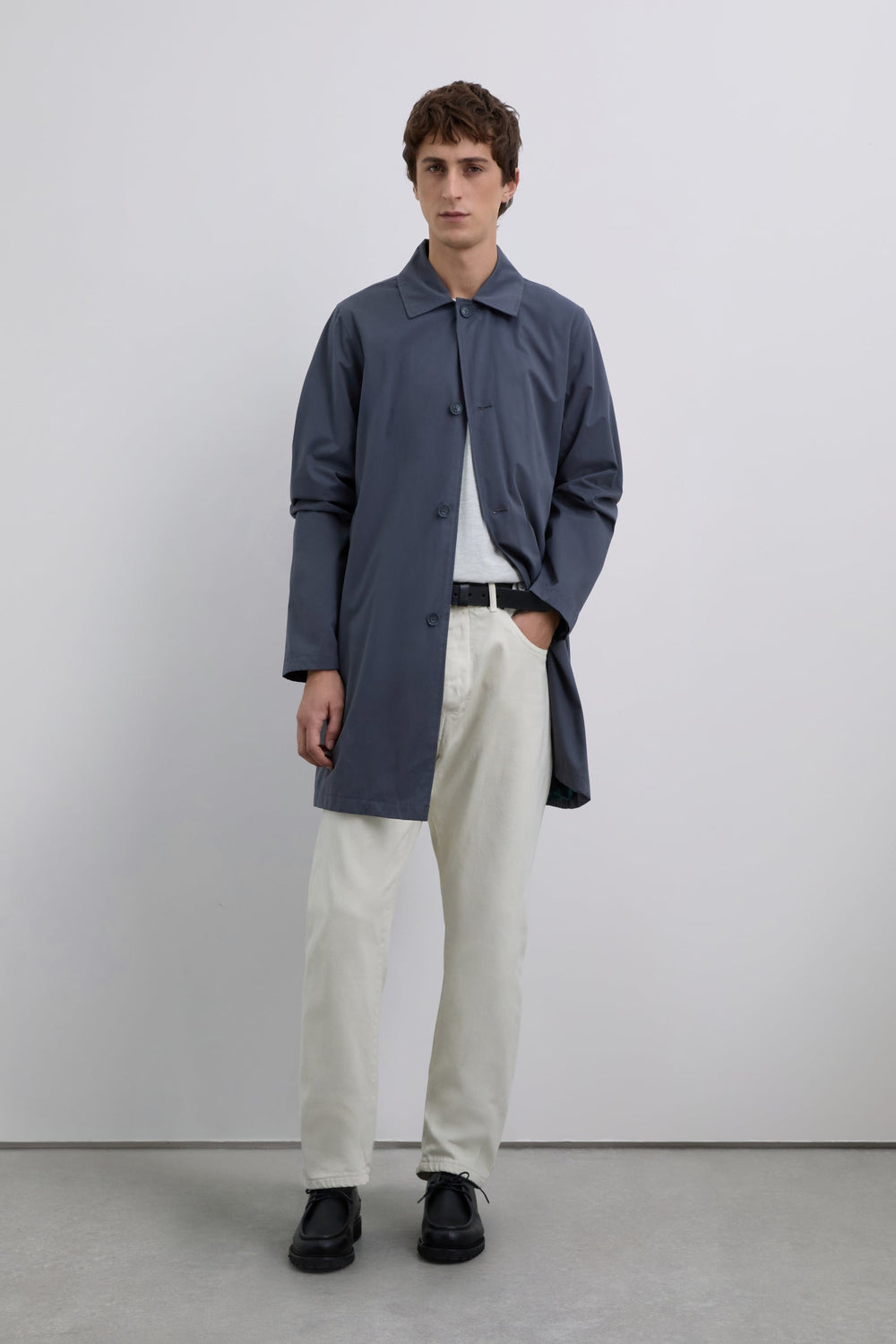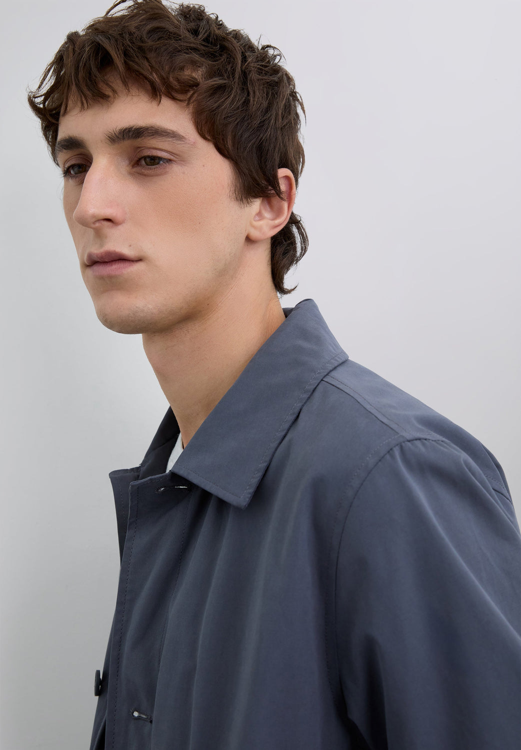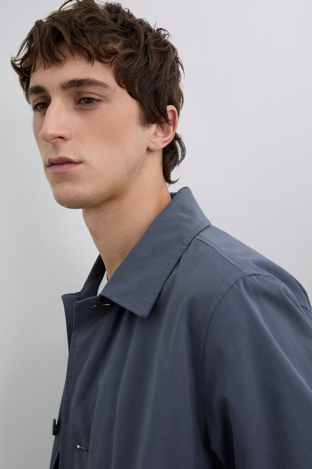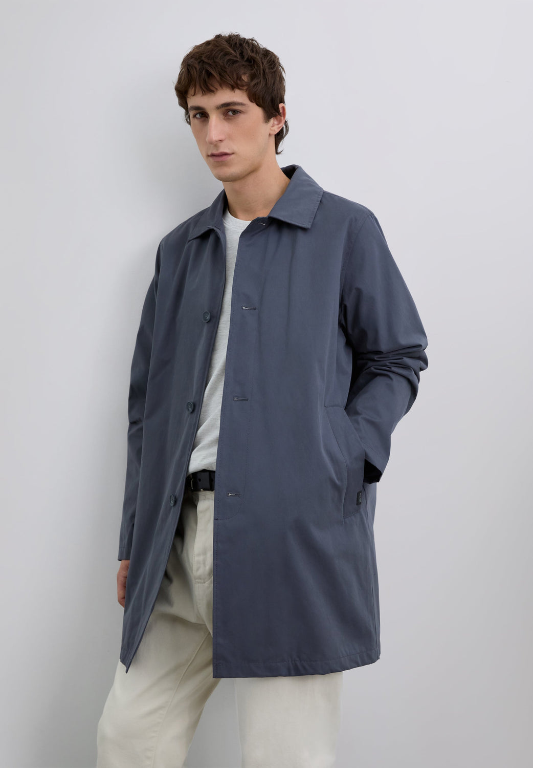 Trench coat with front button fastening. Shirt collar. Two front slant pockets. Stitching details along the length of the garment. Front button fastening. Checked lining. Logo label detail on pocket and inside pocket and skull print on sleeve.