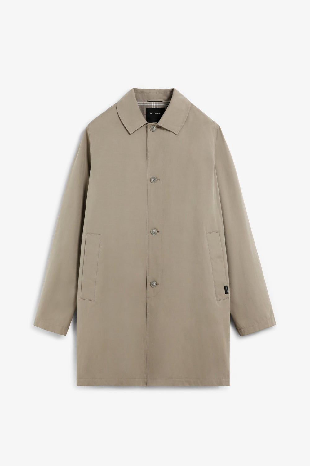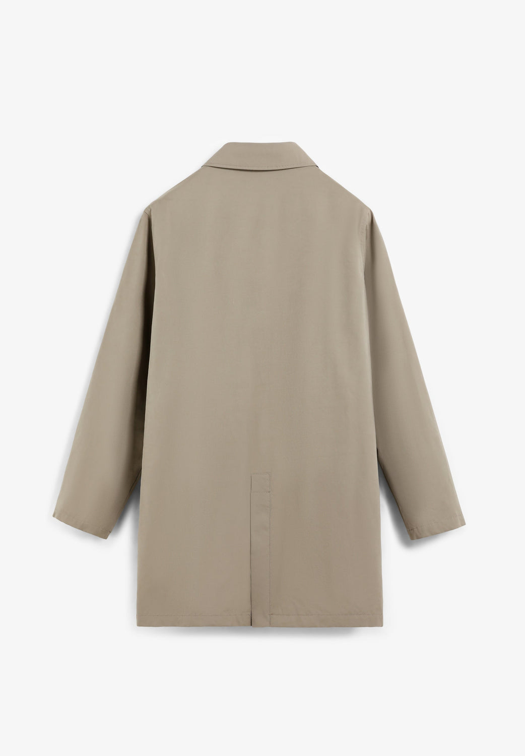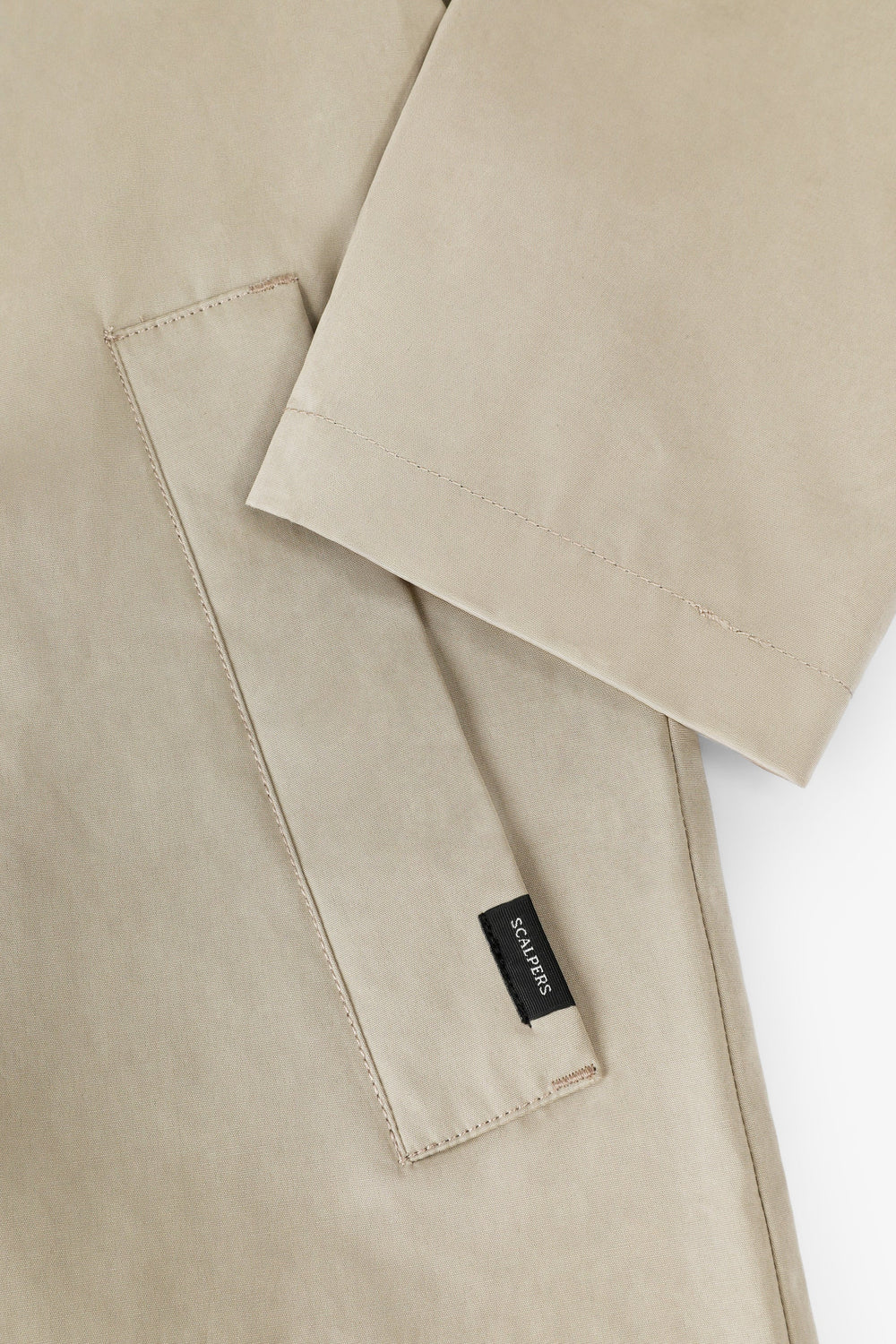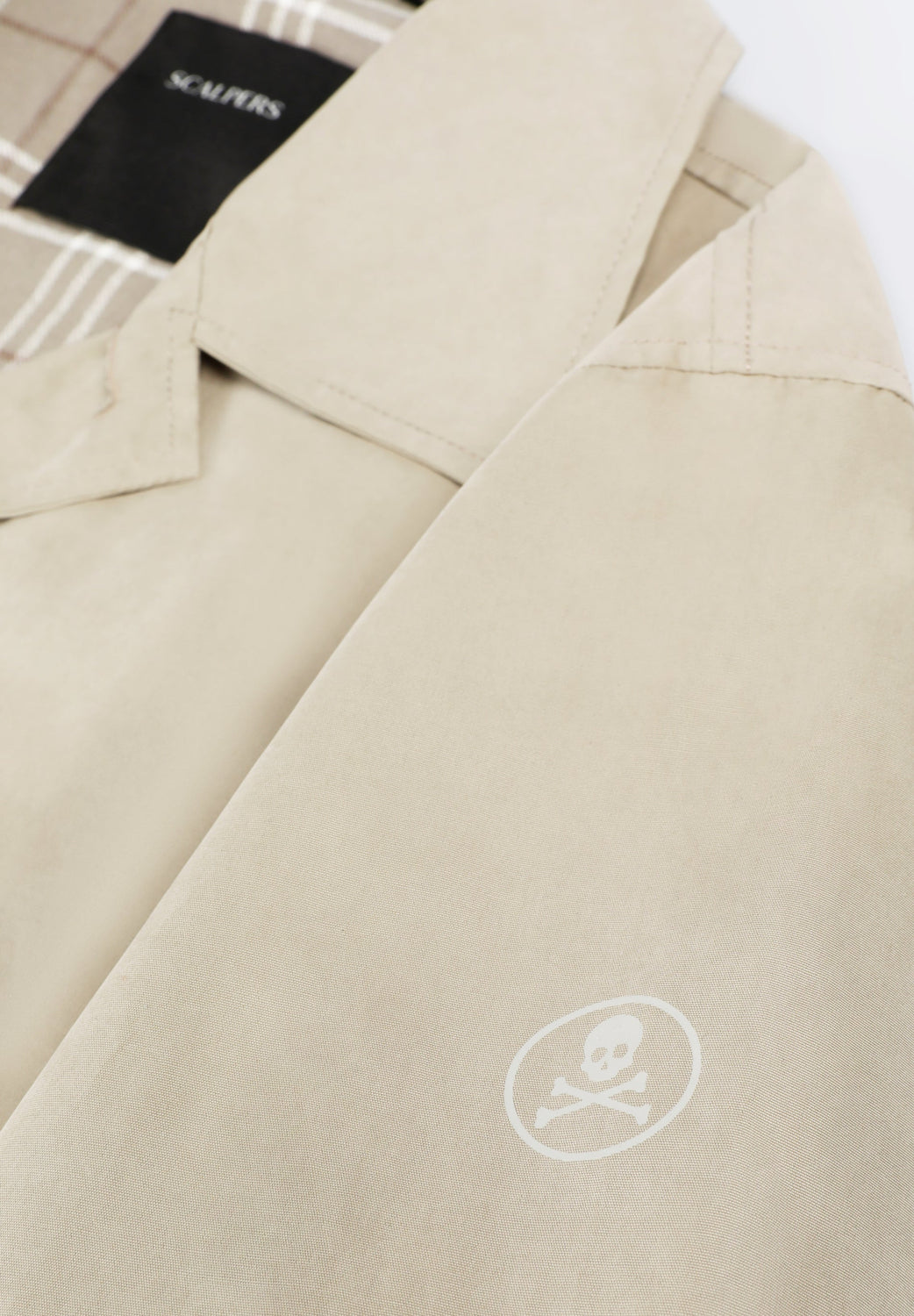 Trench coat with front button fastening. Shirt collar. Two front slant pockets. Stitching details along the length of the garment. Front button fastening. Checked lining. Logo label detail on pocket and inside pocket and skull print on sleeve.