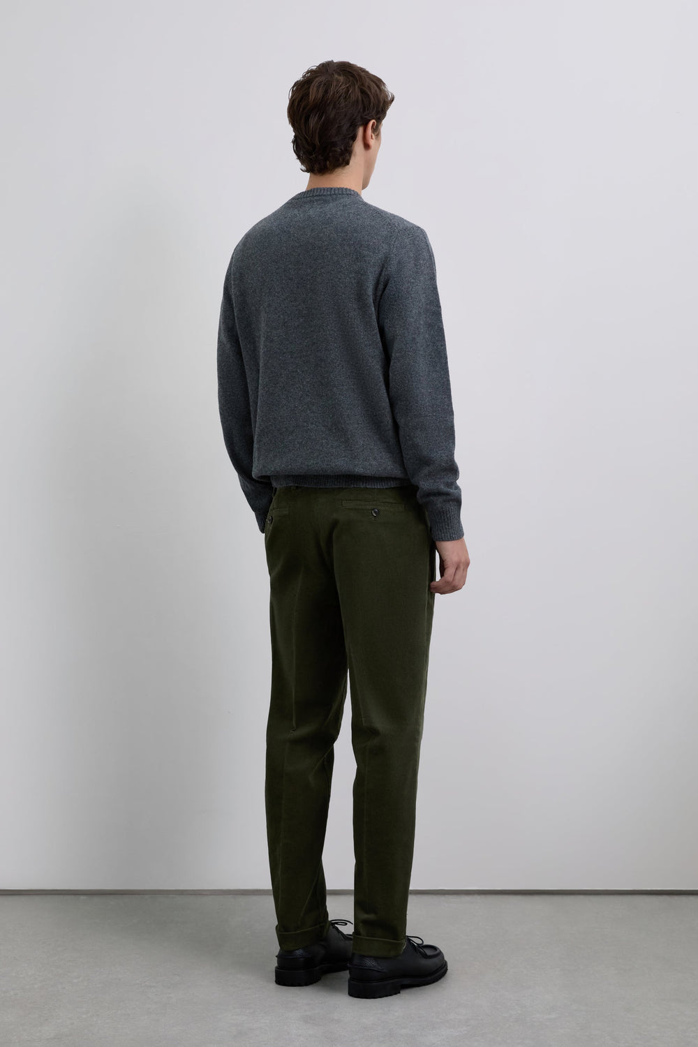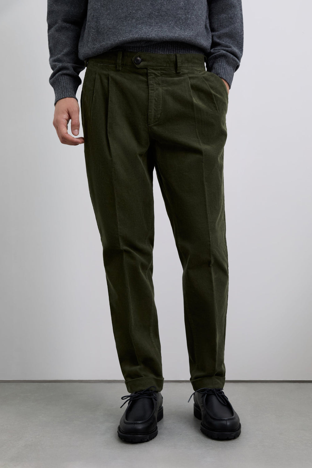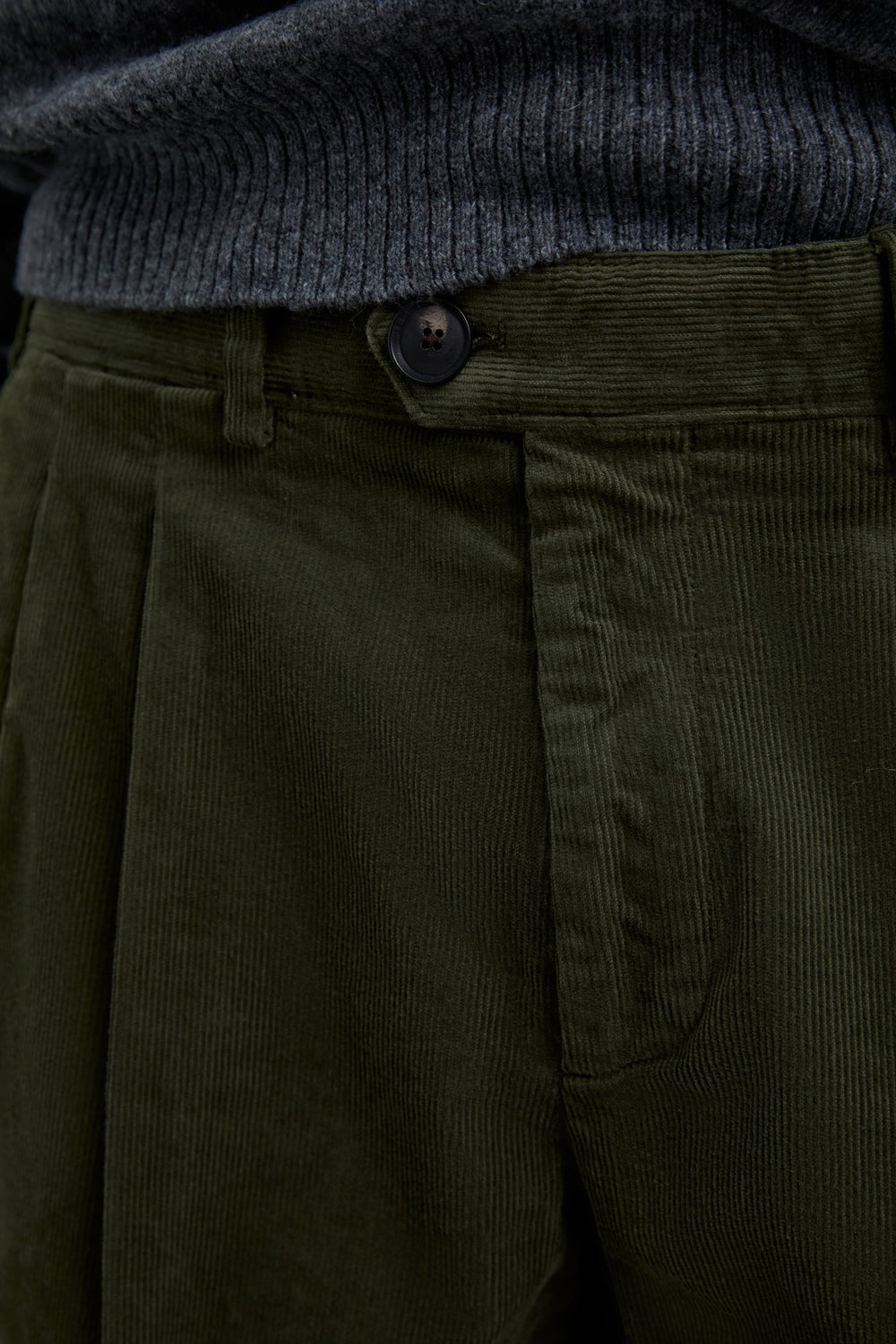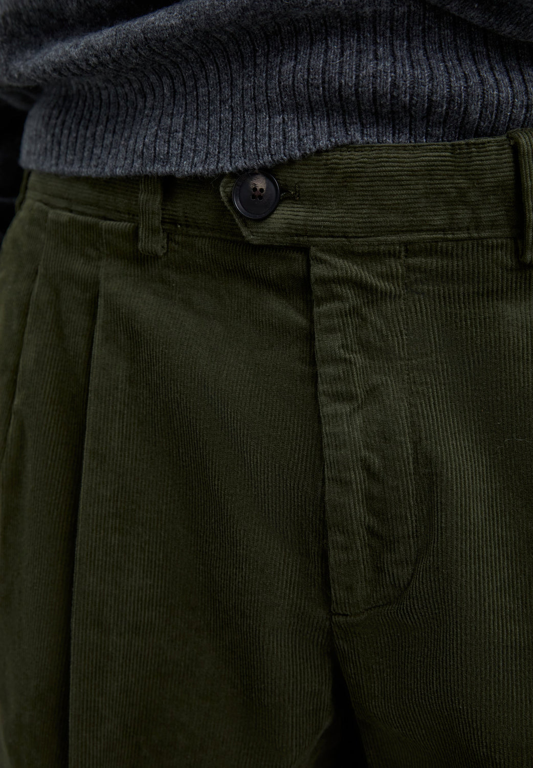 Corduroy chino trousers made of cotton. Loose fit with darts. Concealed zip fastening with an extended button at the waist. Side and back pockets.