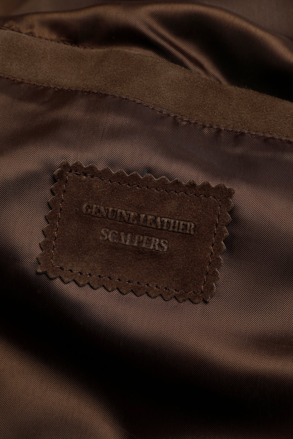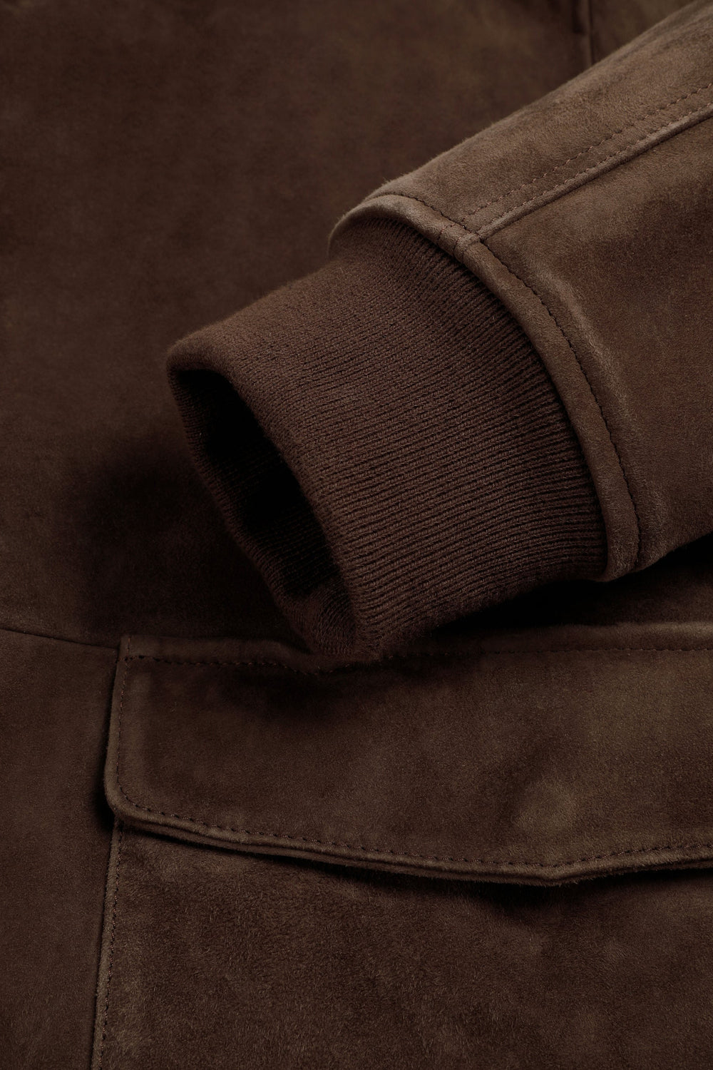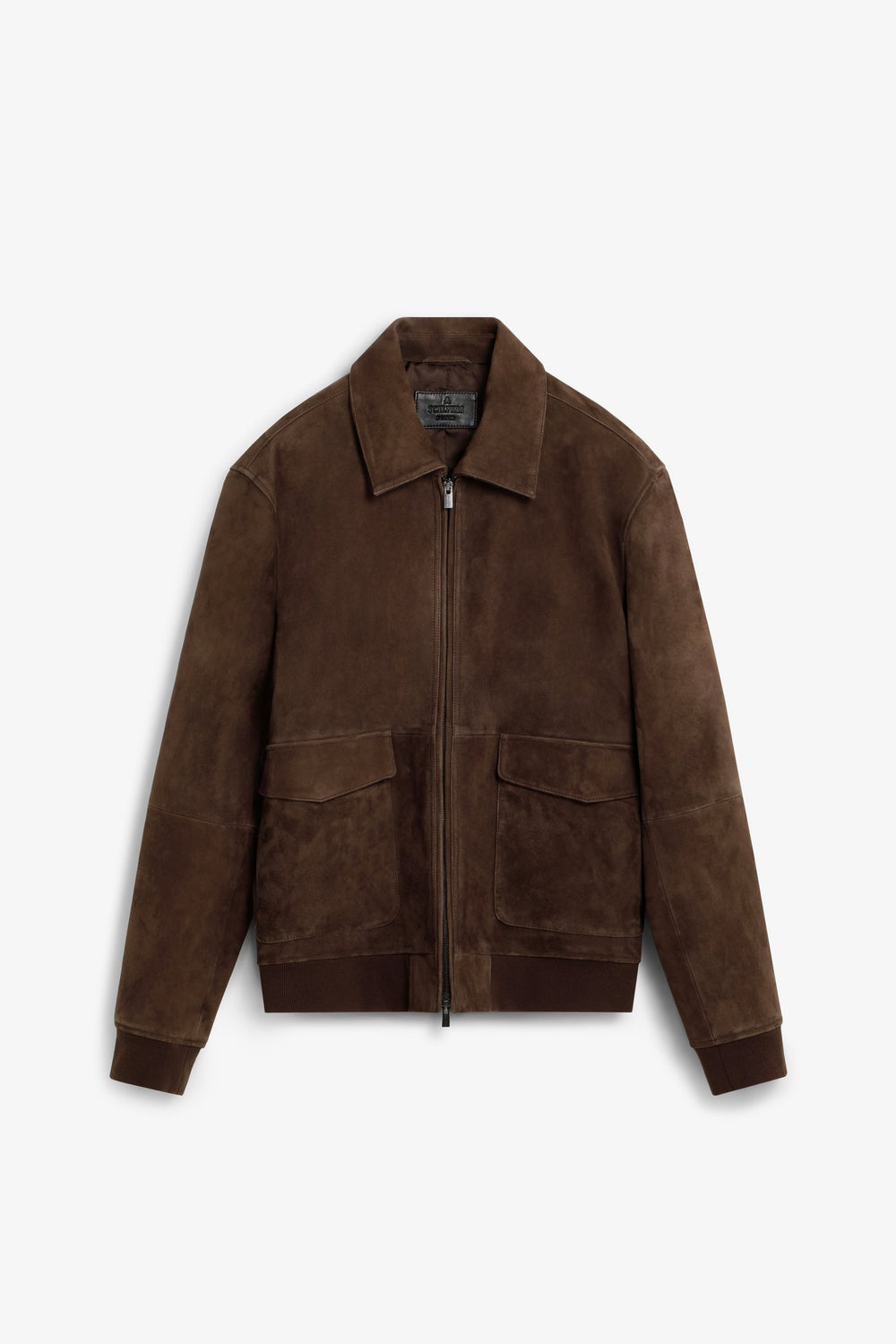 Suede jacket with shirt collar. Double front zip fastening. Ribbed cuffs and hem. Two front pockets with flap fastening.