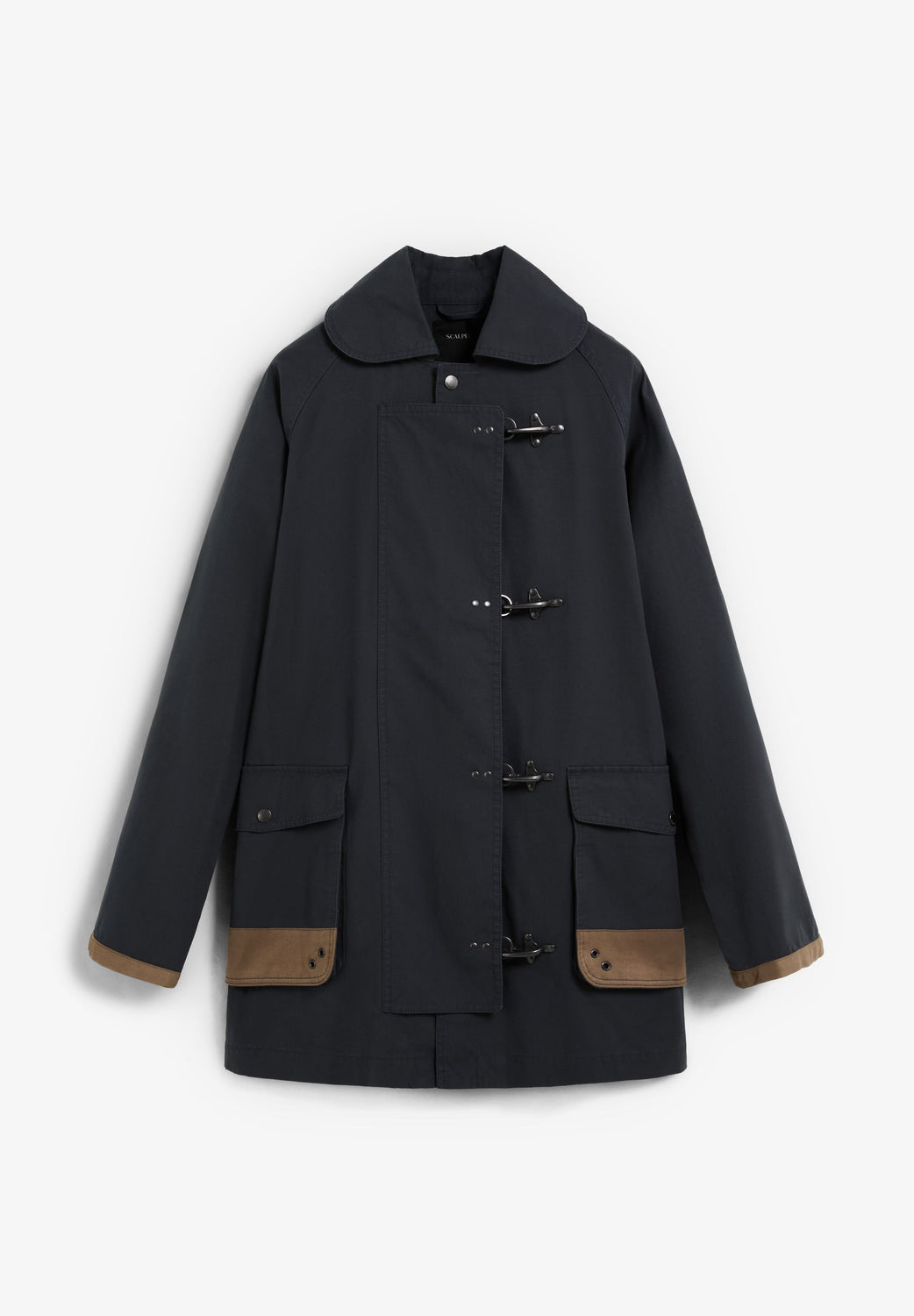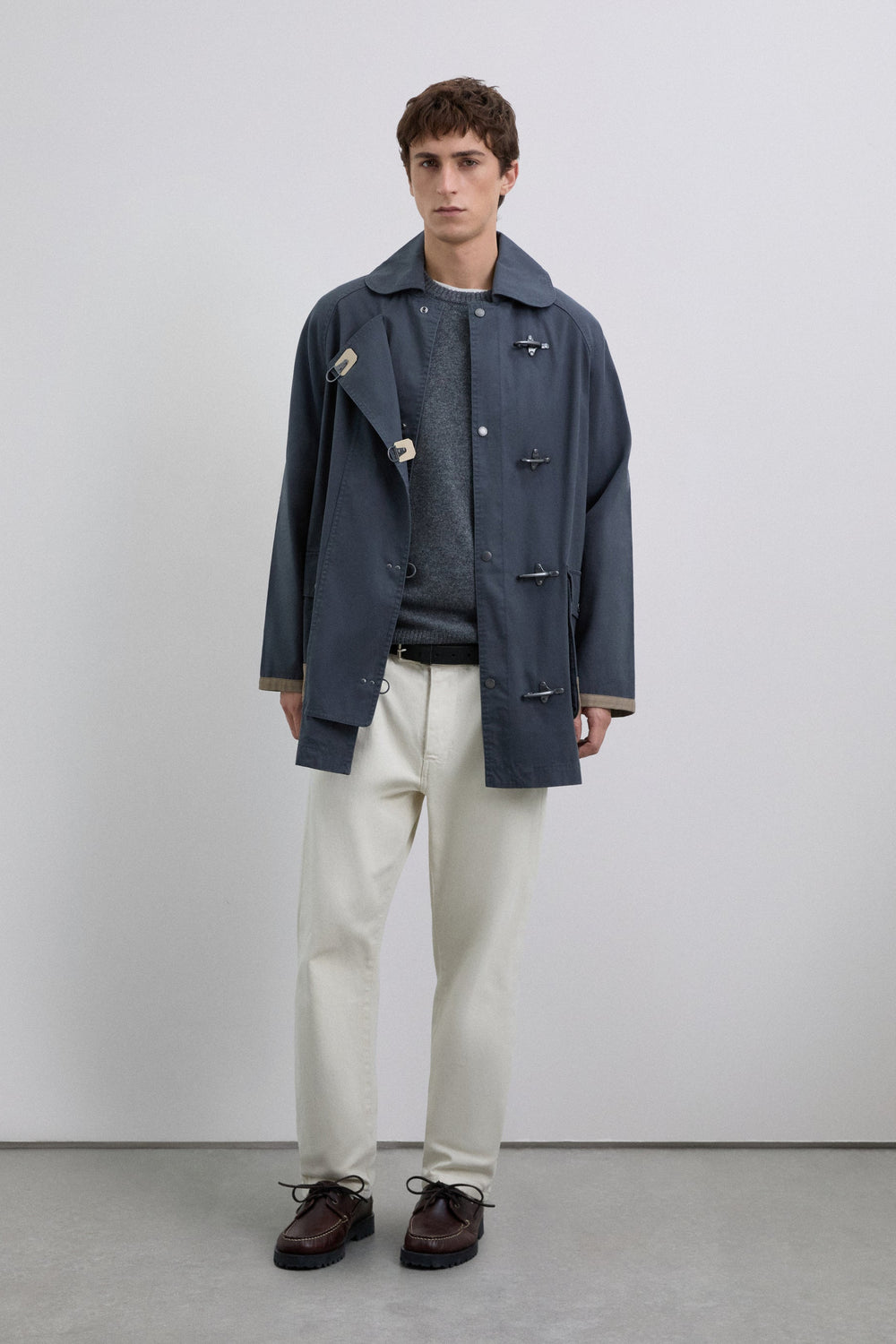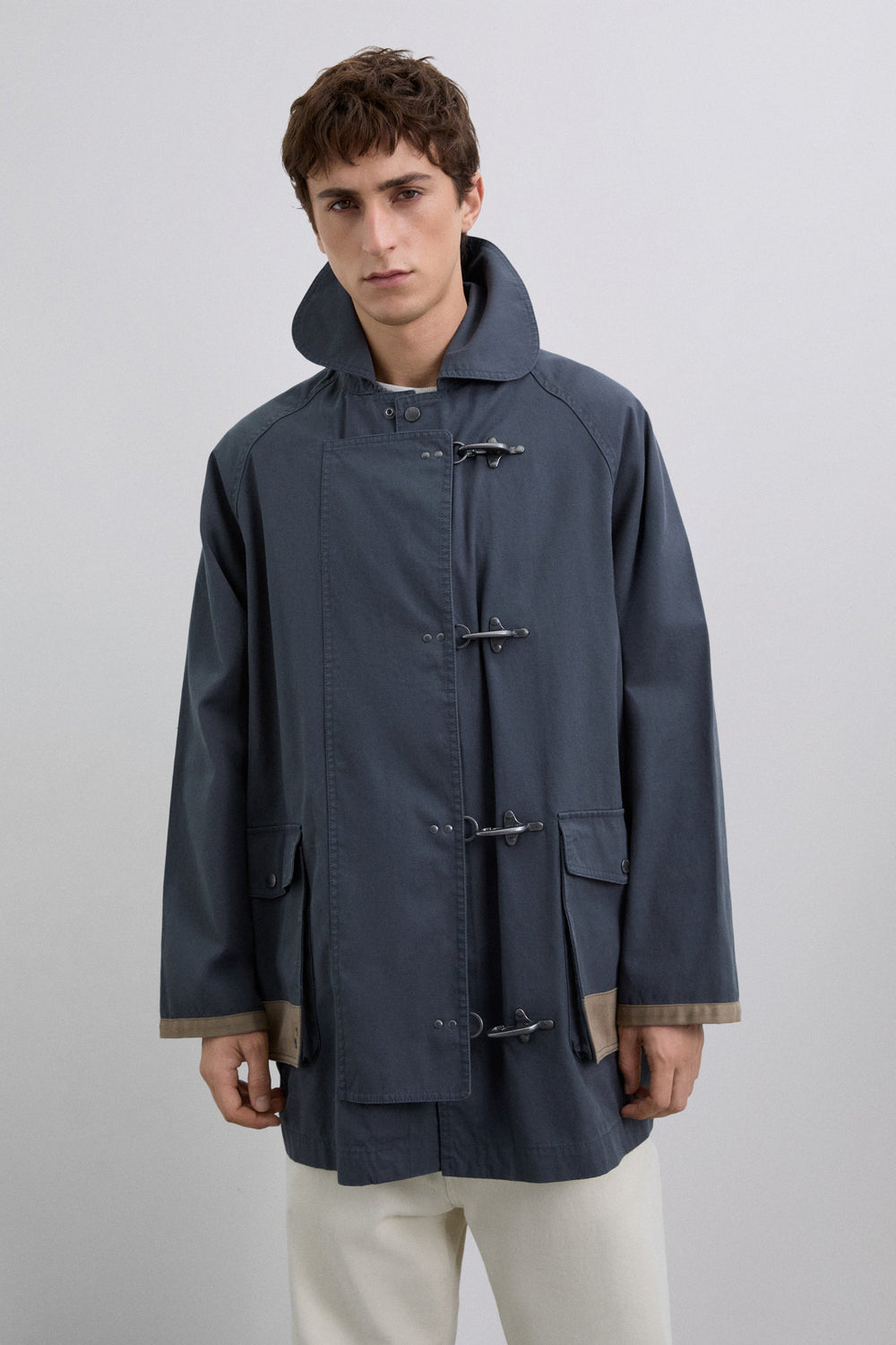 Jacket made of 100% organic cotton. Front buttoned pockets. Side pockets with eyelet details. Oversize design. Rounded shirt-style collar. Raglan sleeves. Fastens with snaps and toggles. Suede piping around the sleeve opening and on the lower edge of the pocket.
