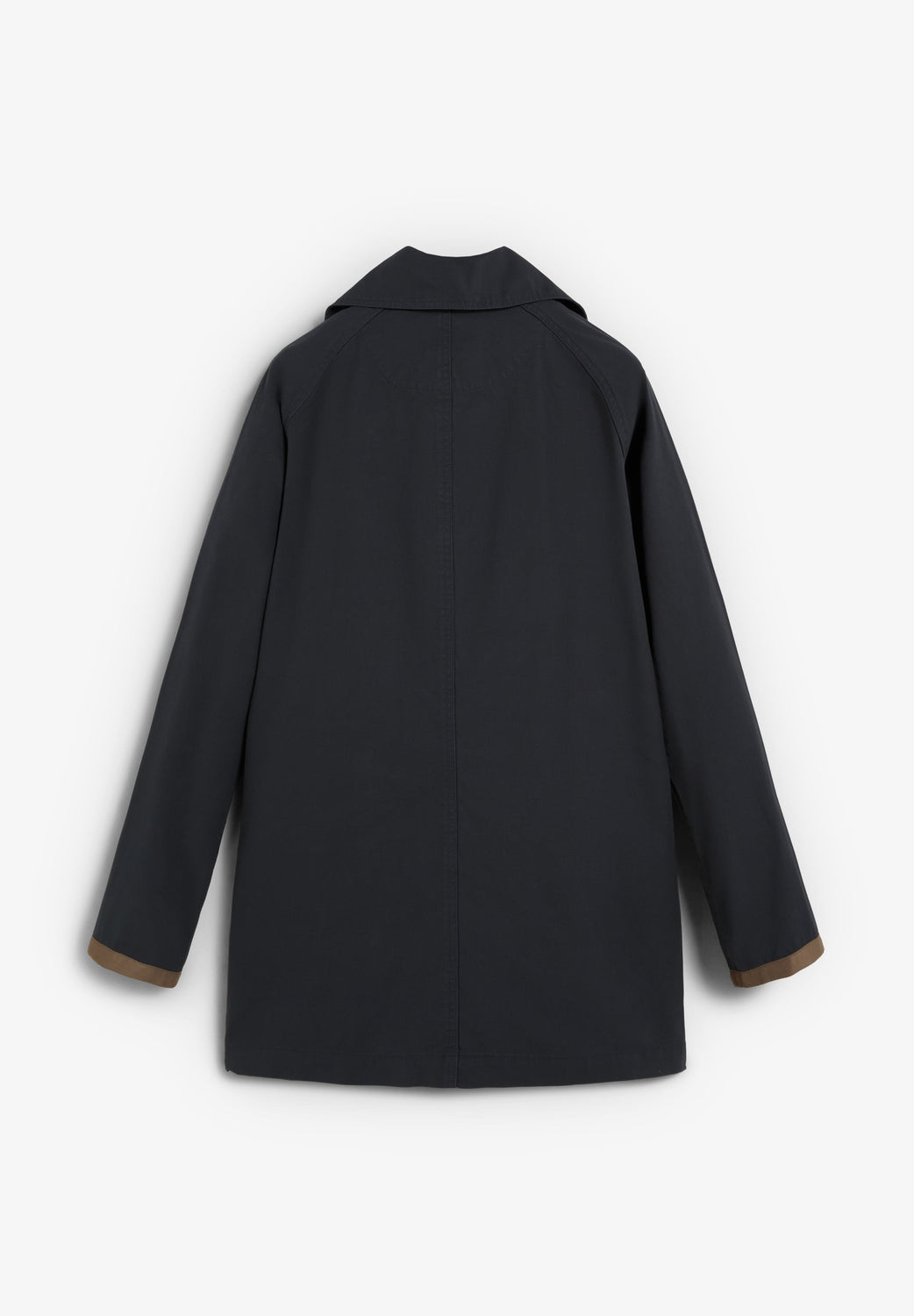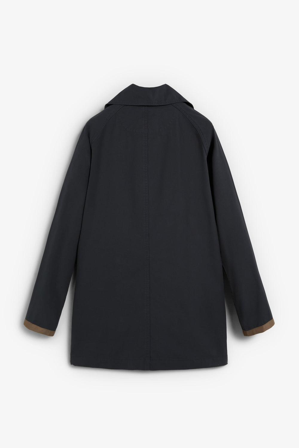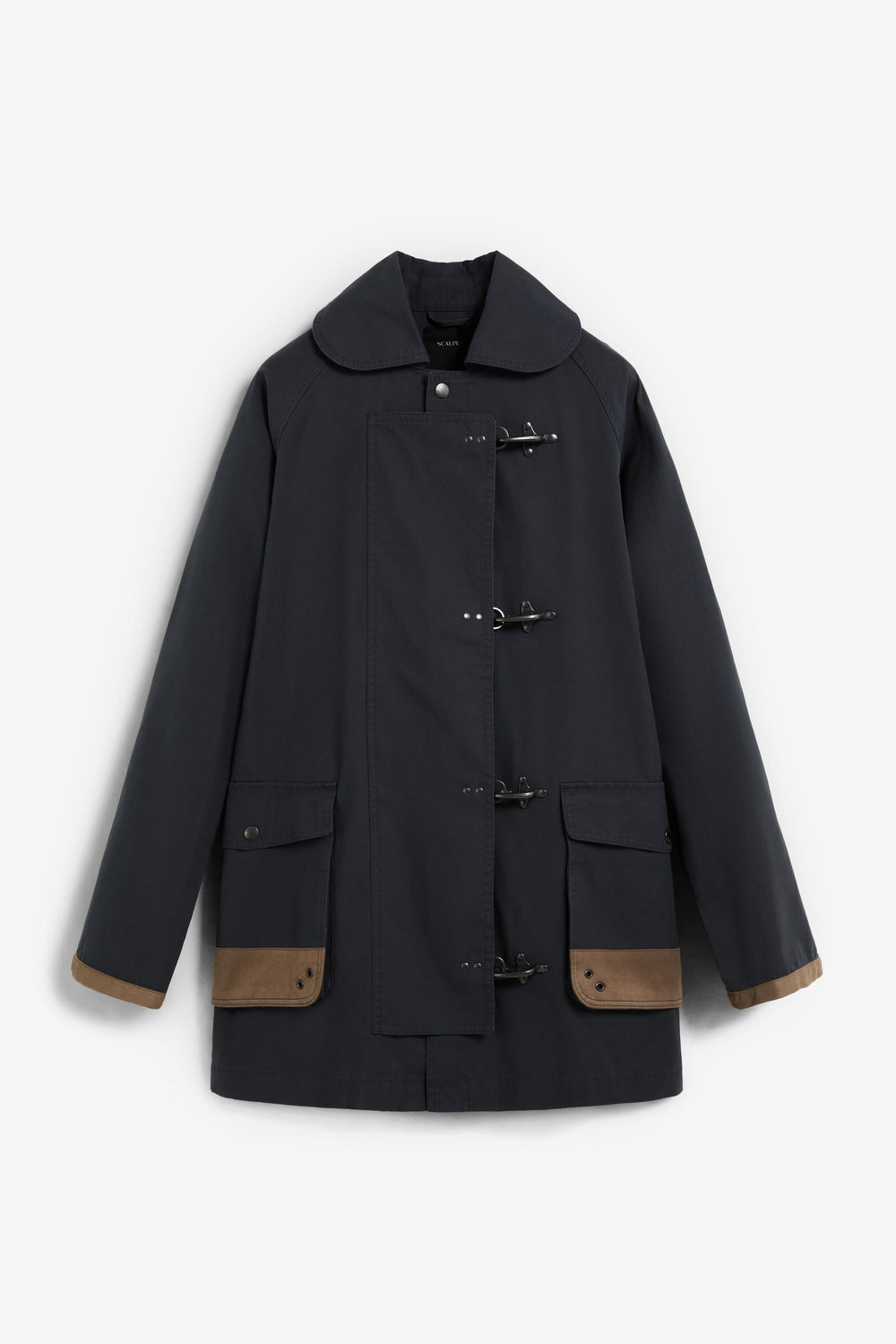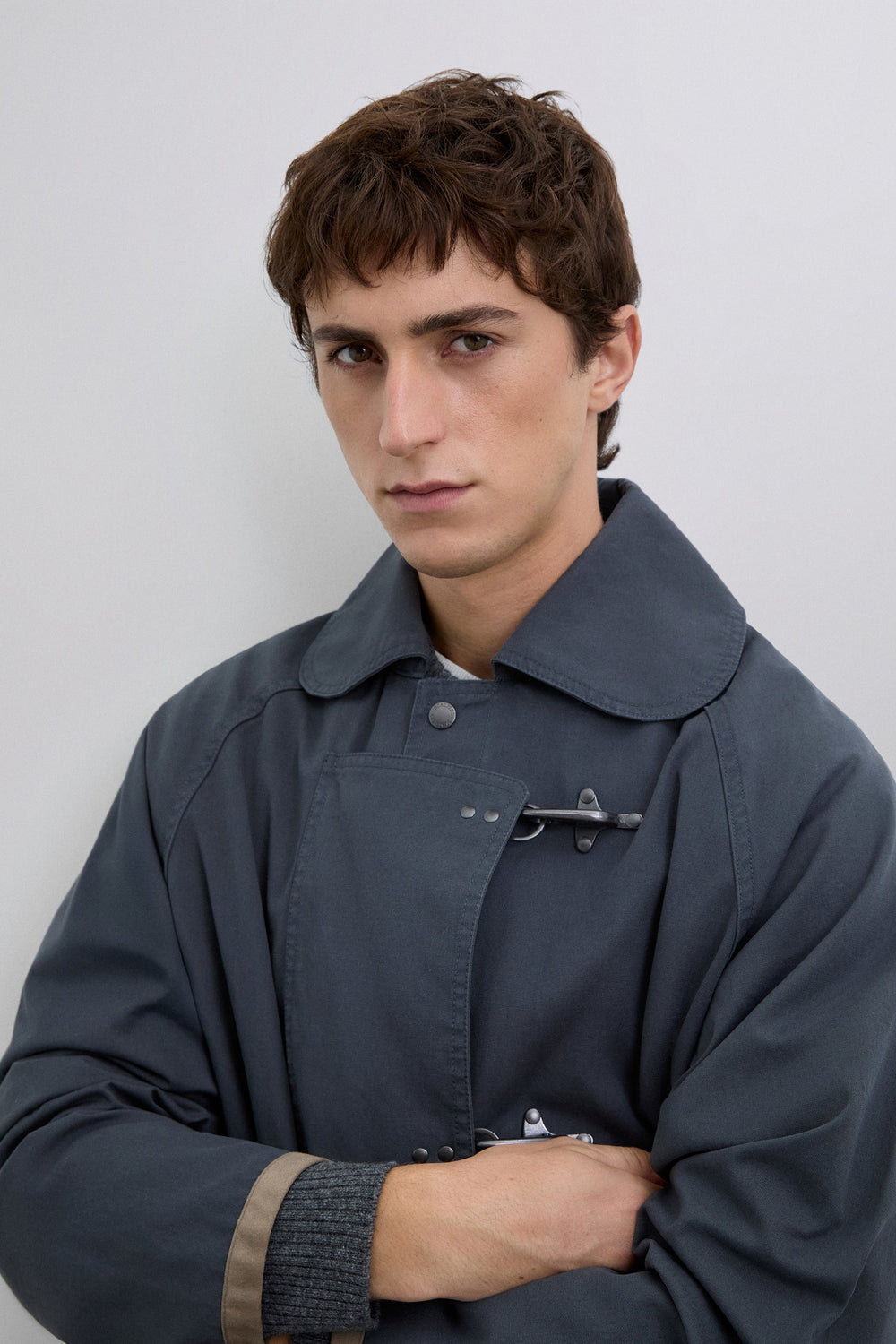Jacket made of 100% organic cotton. Front buttoned pockets. Side pockets with eyelet details. Oversize design. Rounded shirt-style collar. Raglan sleeves. Fastens with snaps and toggles. Suede piping around the sleeve opening and on the lower edge of the pocket.