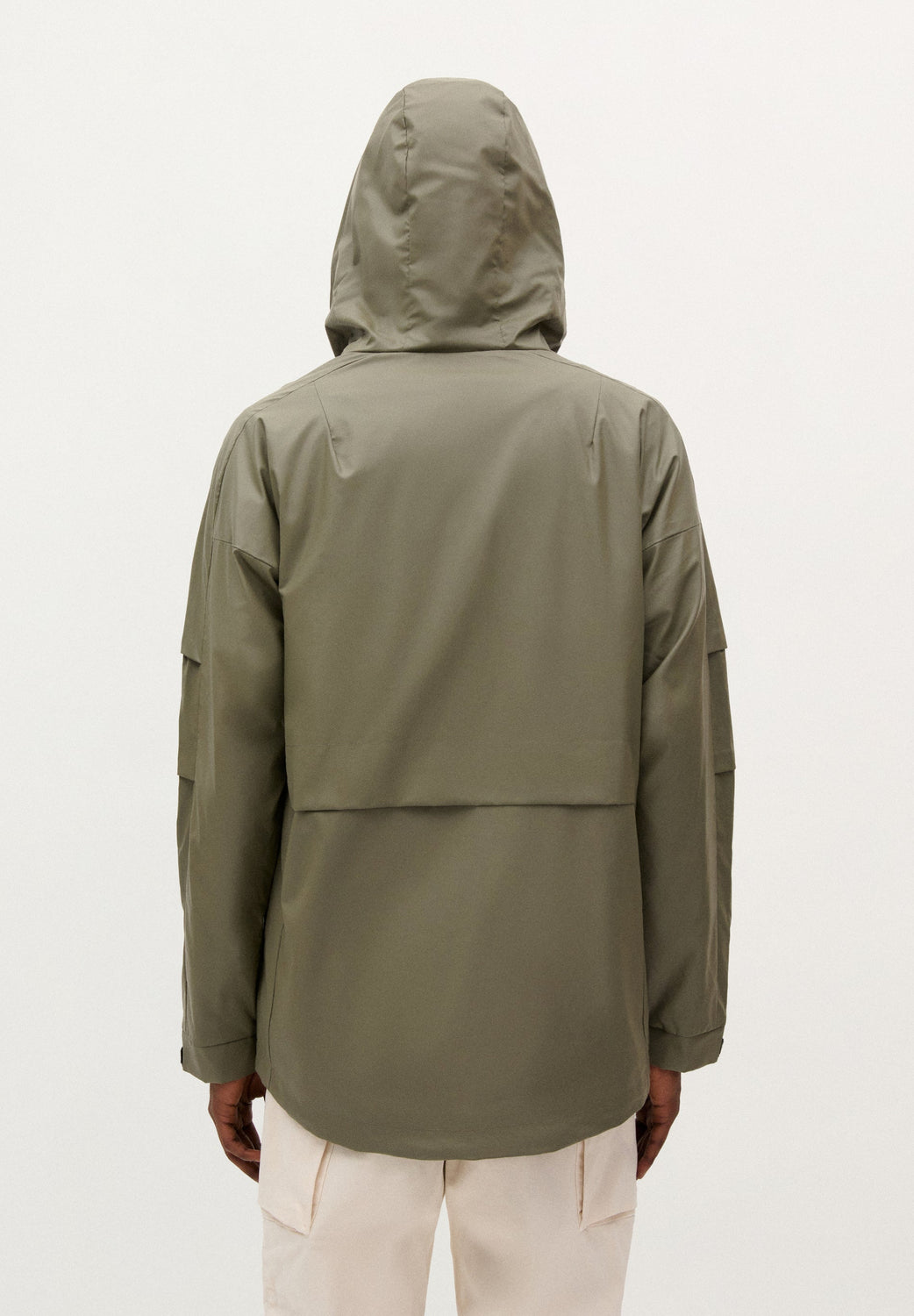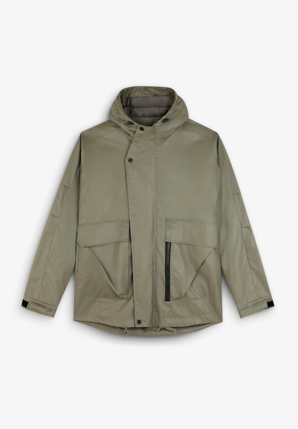 Crossed waterproof jacket. Adjustable hooded collar. Button fastening with heat-sealed zip. Long sleeves finished with adjustable fastening. Side pockets with flap and snap button.