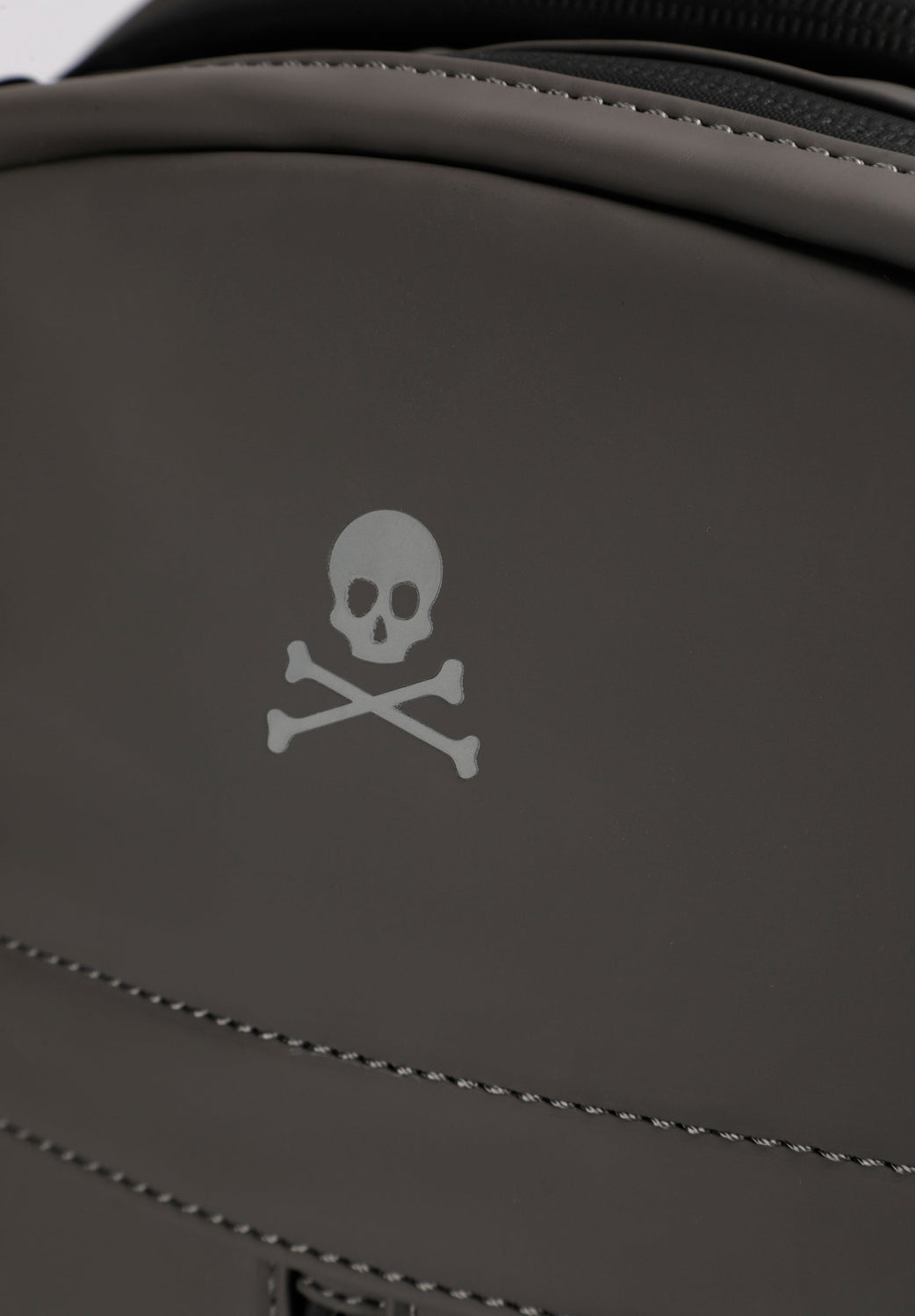 Backpack made of a technical fabric. Double exterior front pocket. Adjustable buckle fastening. Skull detail on front and back print. Top handle. Side and back fastening adjustments. Padded reinforced back.