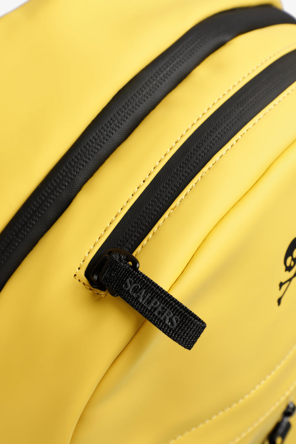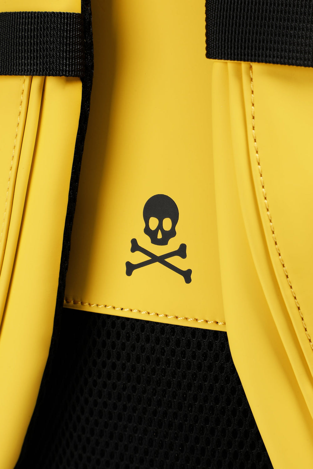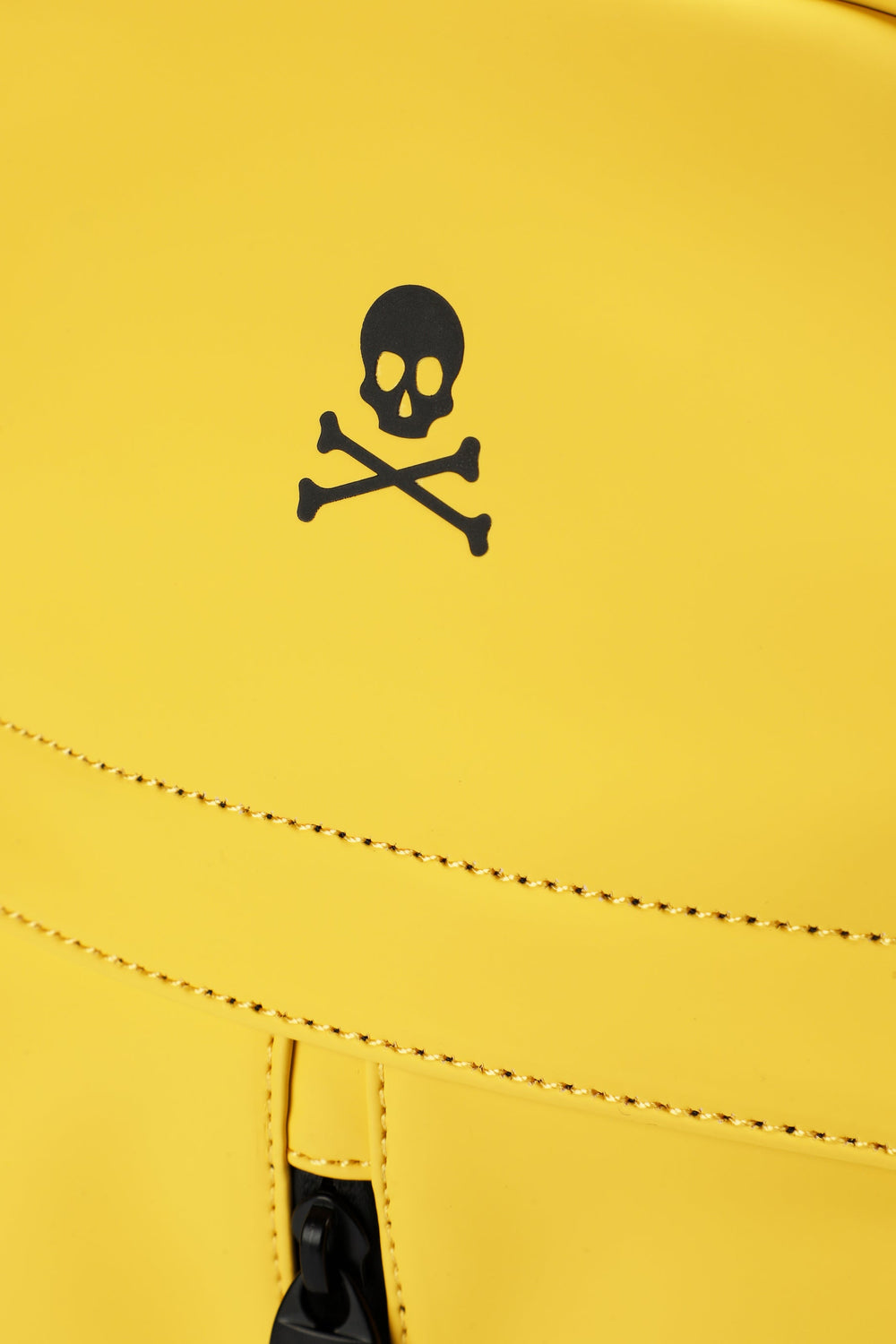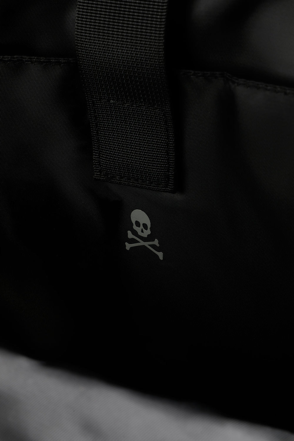 Backpack made of a technical fabric. Double exterior front pocket. Adjustable buckle fastening. Skull detail on front and back print. Top handle. Side and back fastening adjustments. Padded reinforced back.