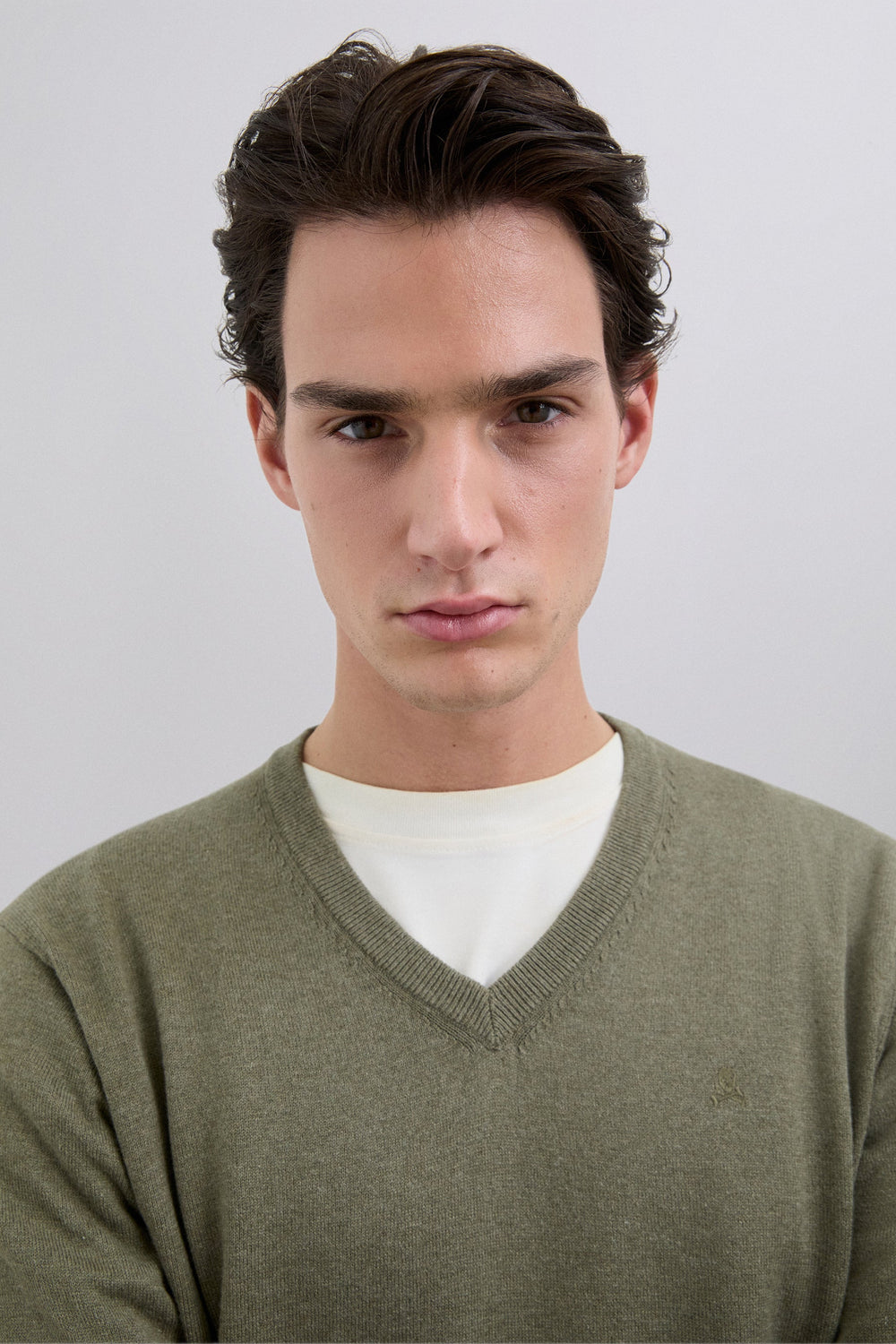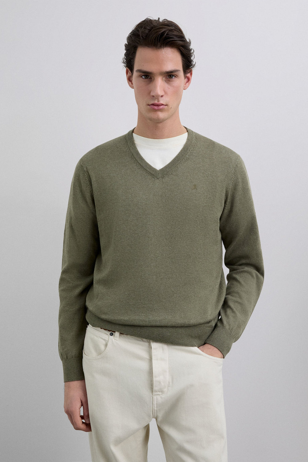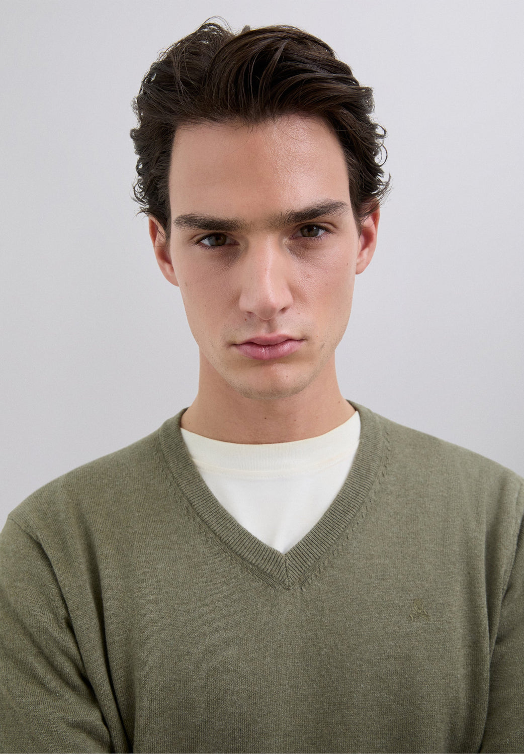Sweater made of cotton. Regular fit. V-neck. Long sleeves. Ribbed cuffs and waistband. Matching embroidered skull detail on the chest.