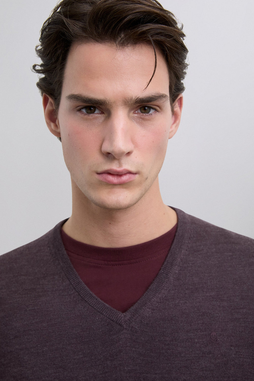 Sweater made of 100% wool. Regular Fit. V-neck. Long sleeves. Matching embroidered skull detail on the chest. Ribbed trim.