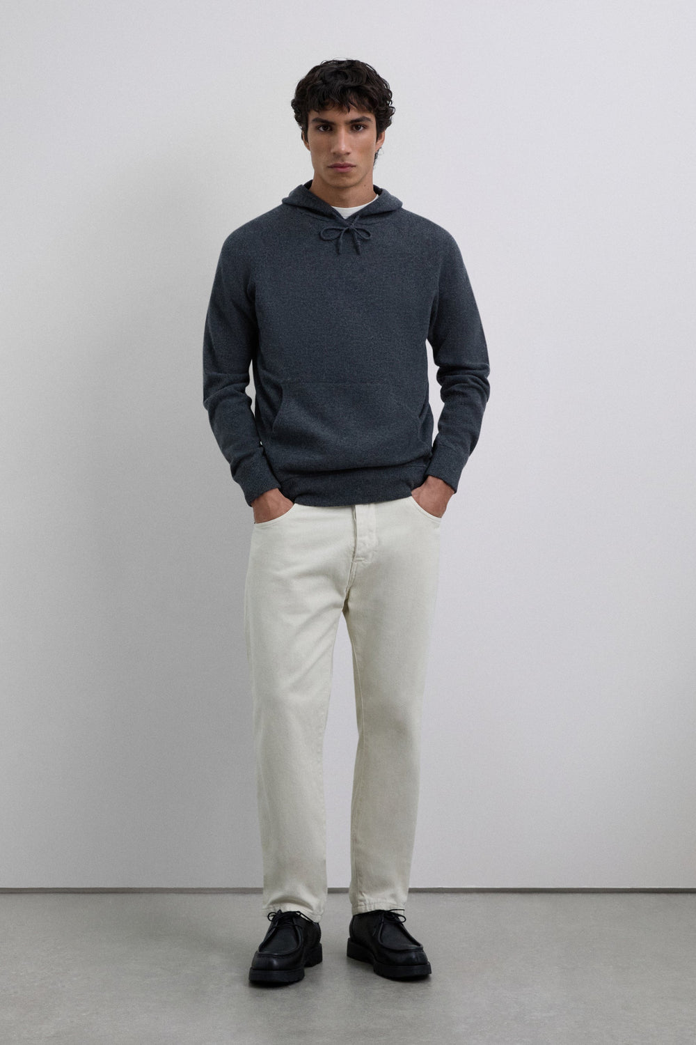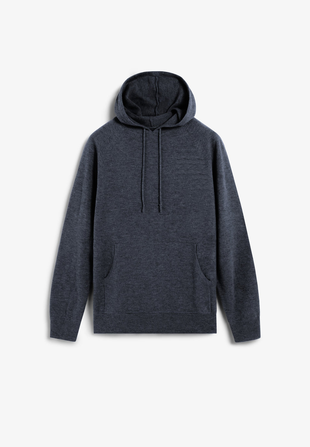 Sweater made of 100% wool. Adjustable drawstring hood. Long sleeves. Pouch pocket on the front. Ribbed cuffs and waistband.