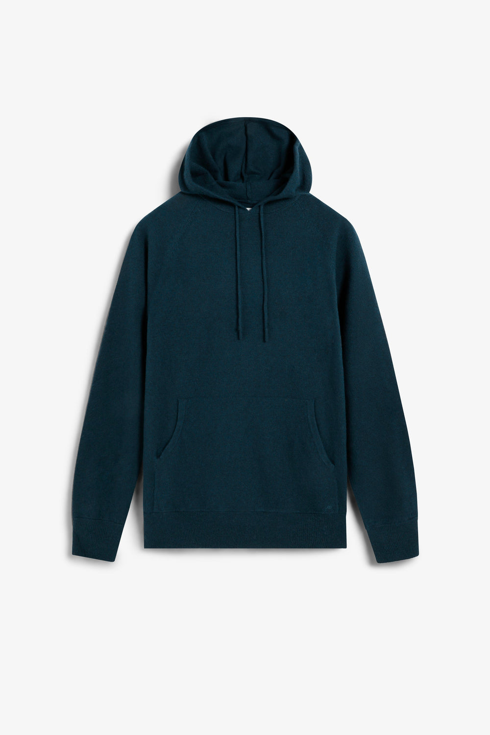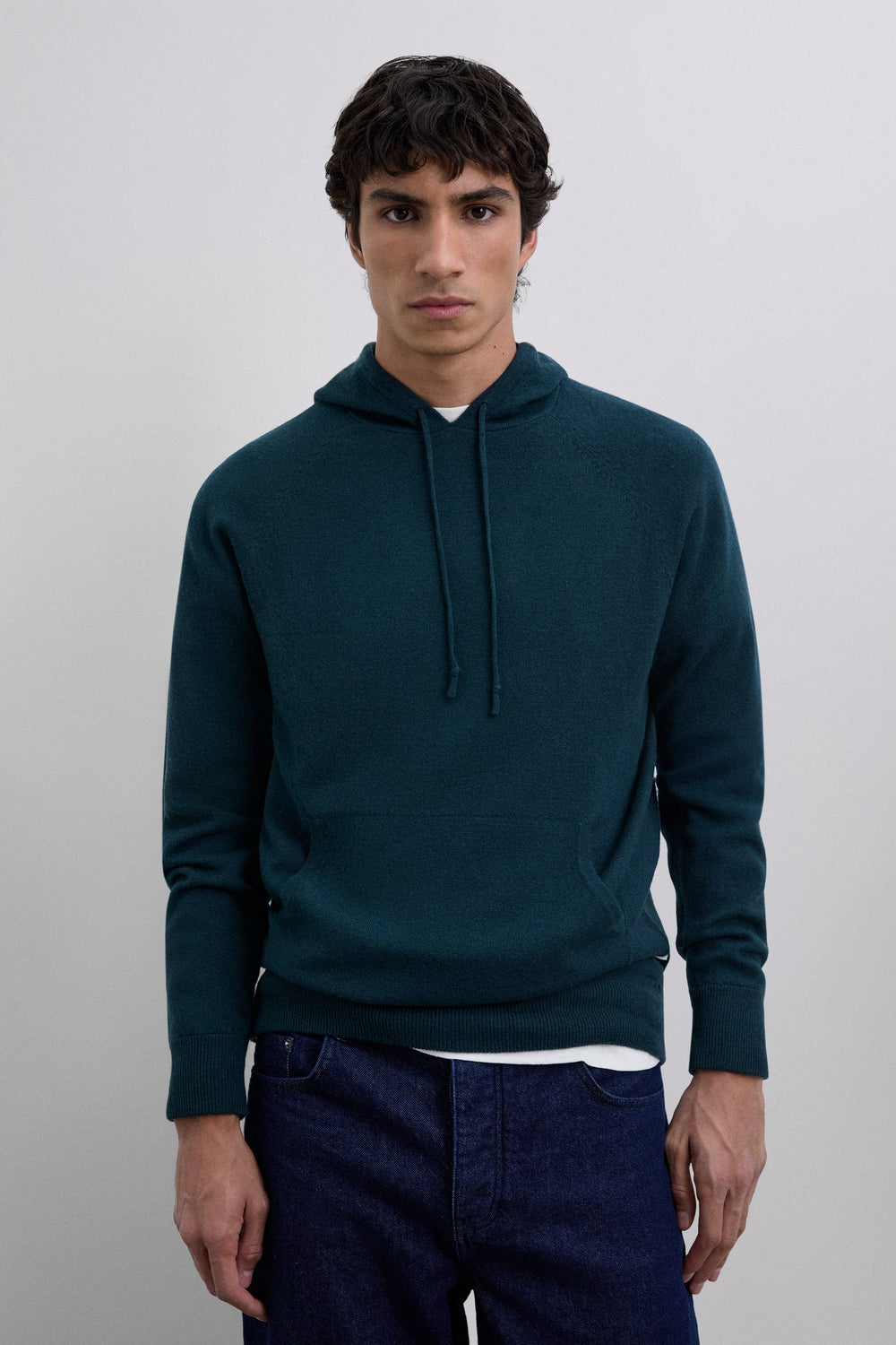 Sweater made of 100% wool. Adjustable drawstring hood. Long sleeves. Pouch pocket on the front. Ribbed cuffs and waistband.