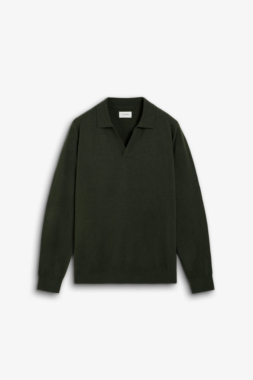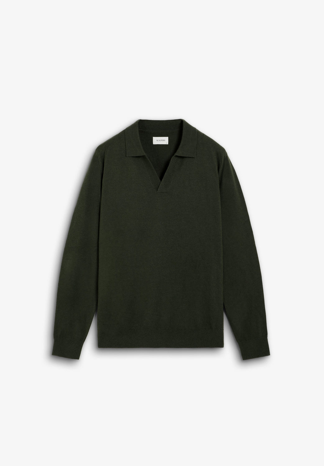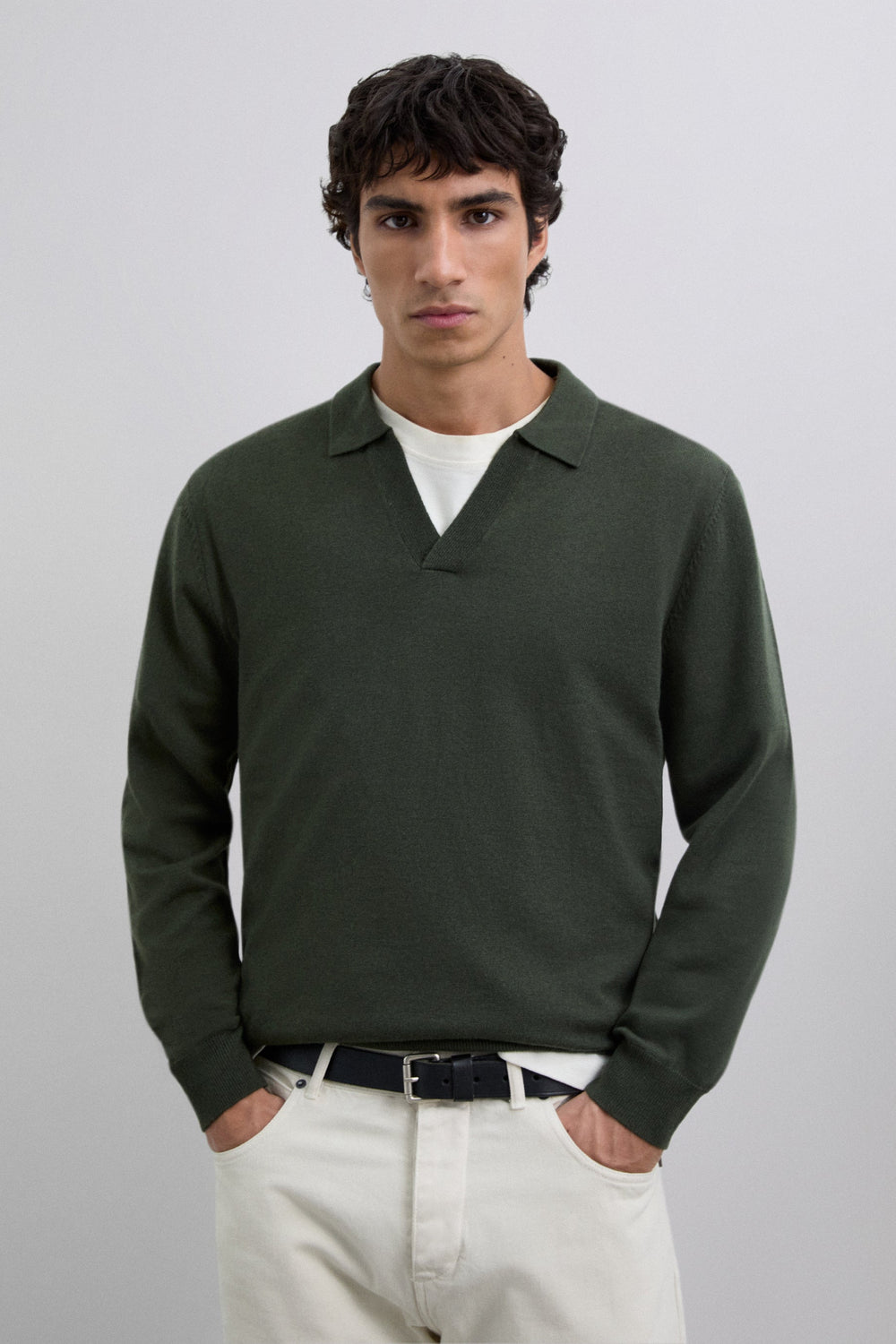 Polo shirt made of wool. Long sleeves. Ribbed trim. V-neck.