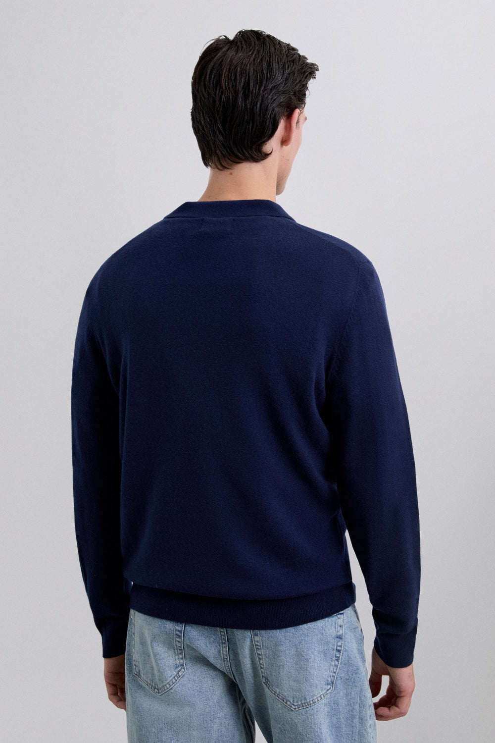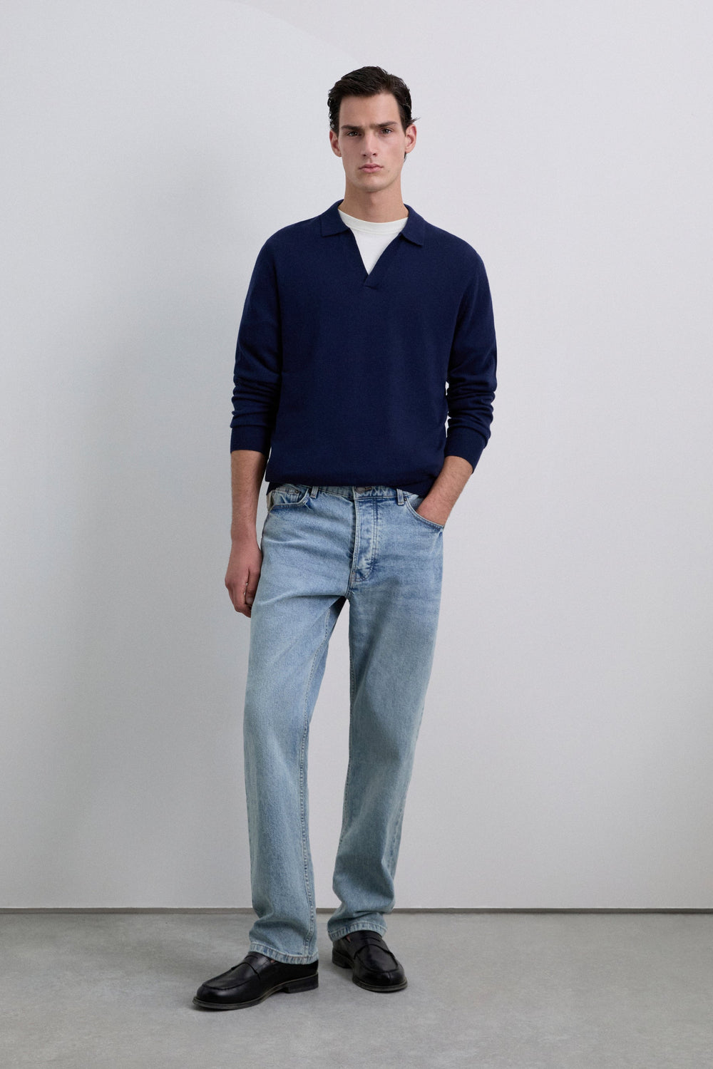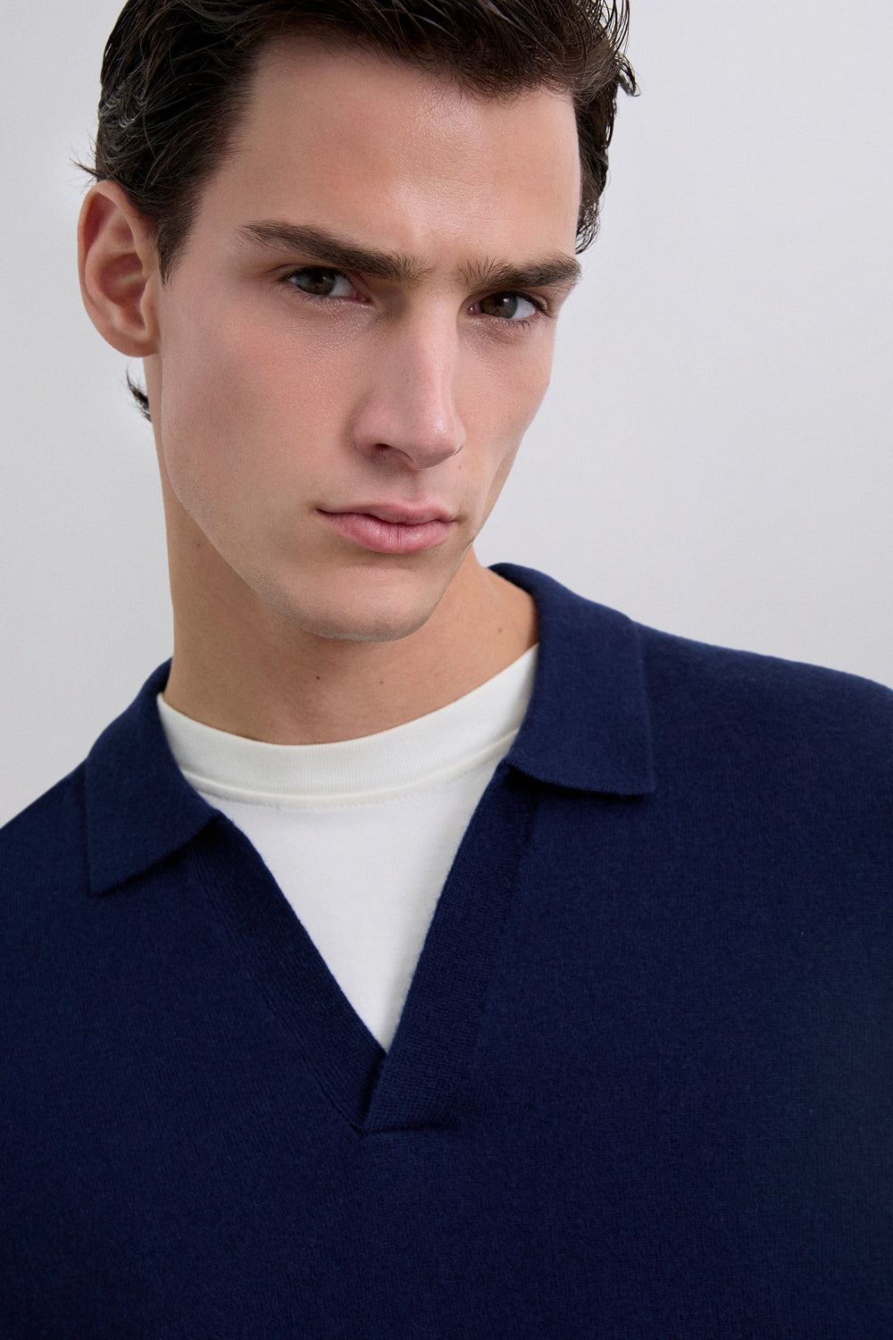 Polo shirt made of wool. Long sleeves. Ribbed trim. V-neck.