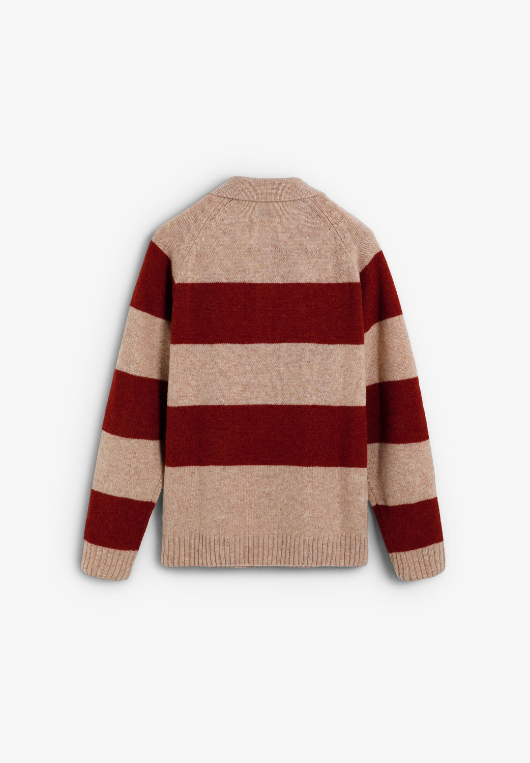 Sweater made of 100% wool. Polo shirt collar with buttons. Stripe print. Long sleeves. Regular fit.