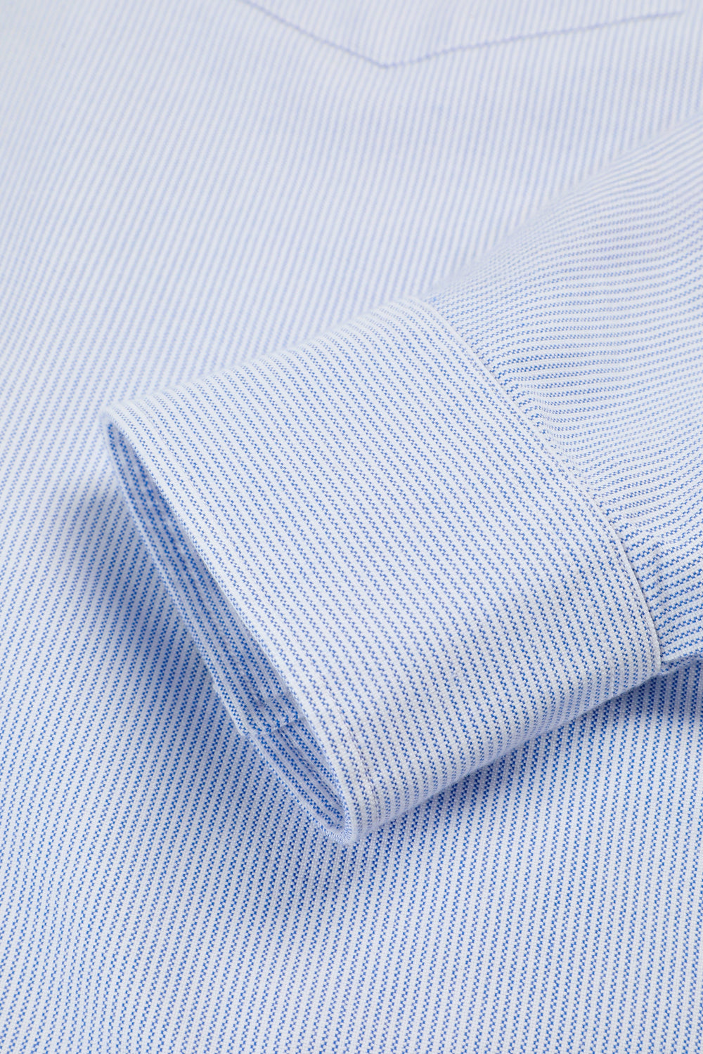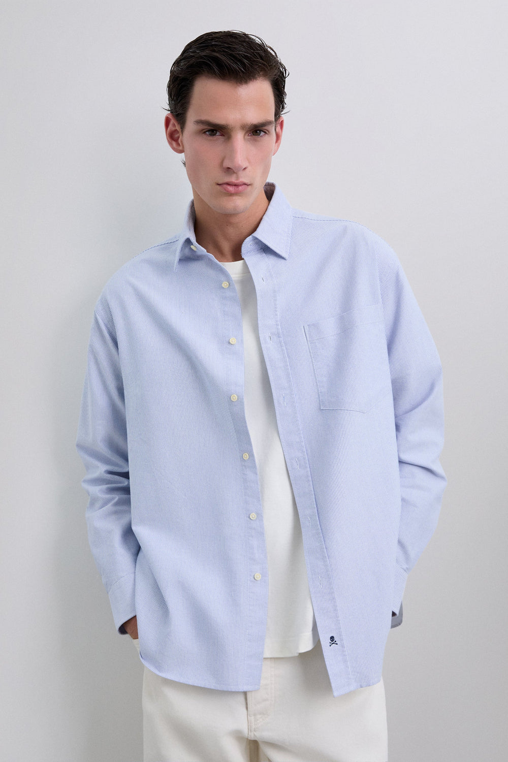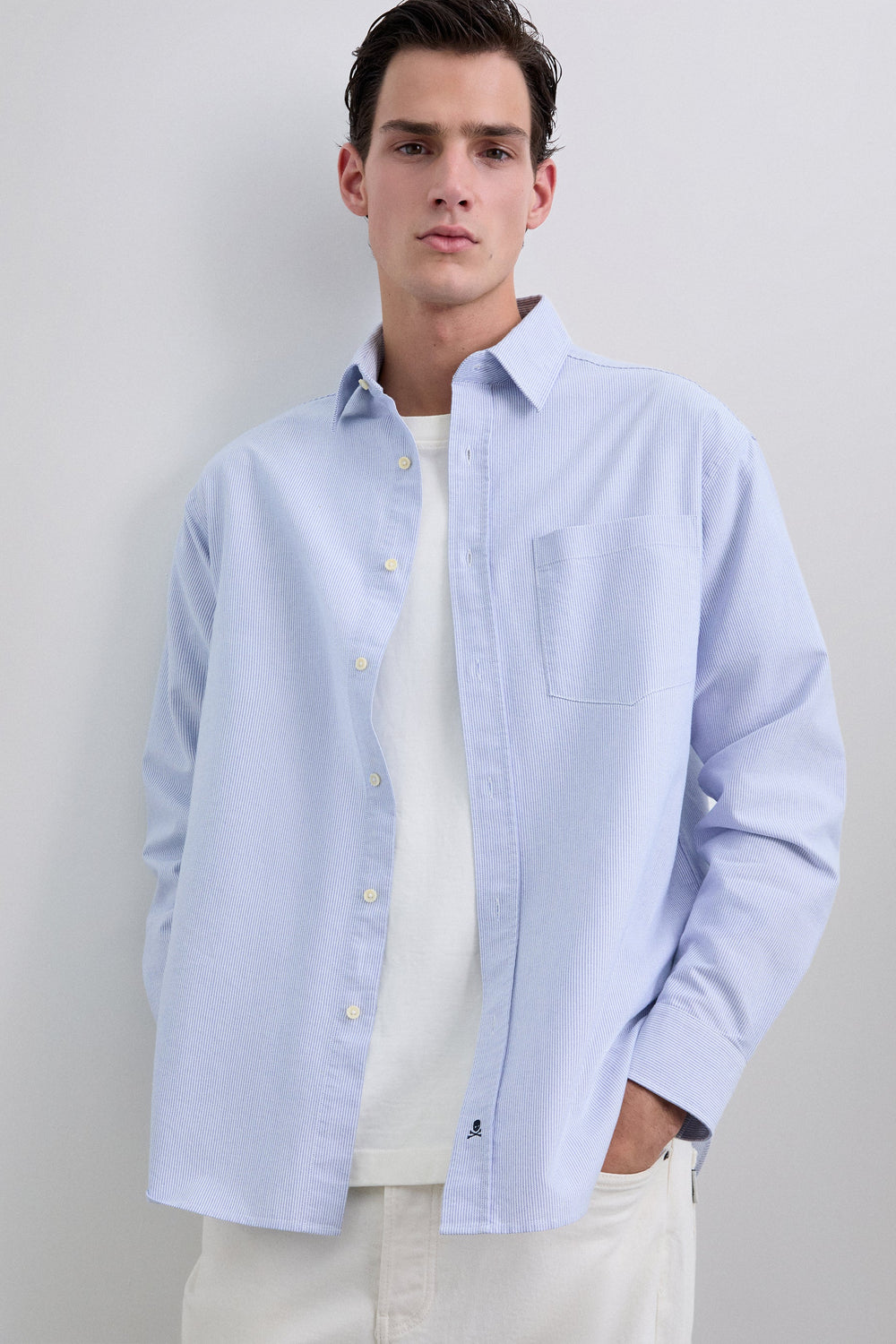 Shirt made of 100% BCI cotton. Stripe print. Chest pocket detail. Long sleeves. Button fastening at front and cuffs. Contrast embroidered skull detail on the lower front.