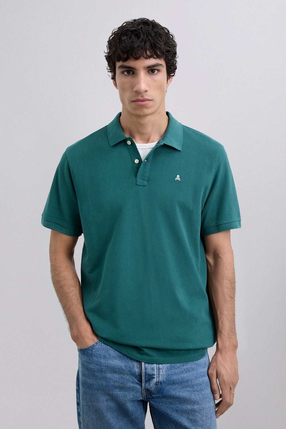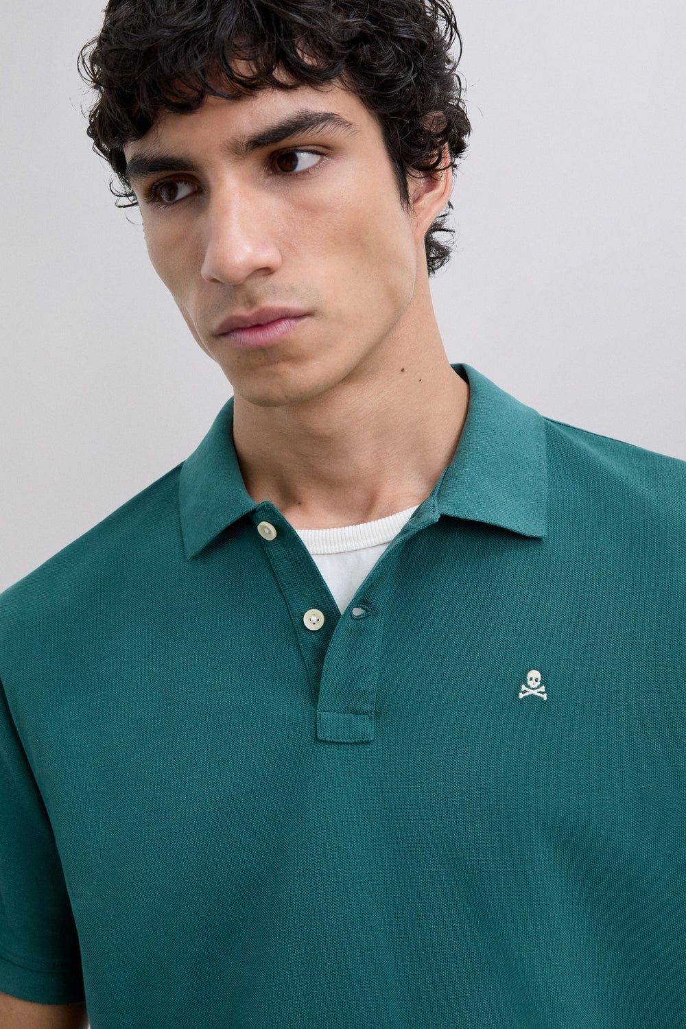 Pique polo shirt made of 100% organic cotton. Short sleeve. Regular fit. Two-button placket. Ribbed collar and cuffs. Contrast embroidered skull on the chest.