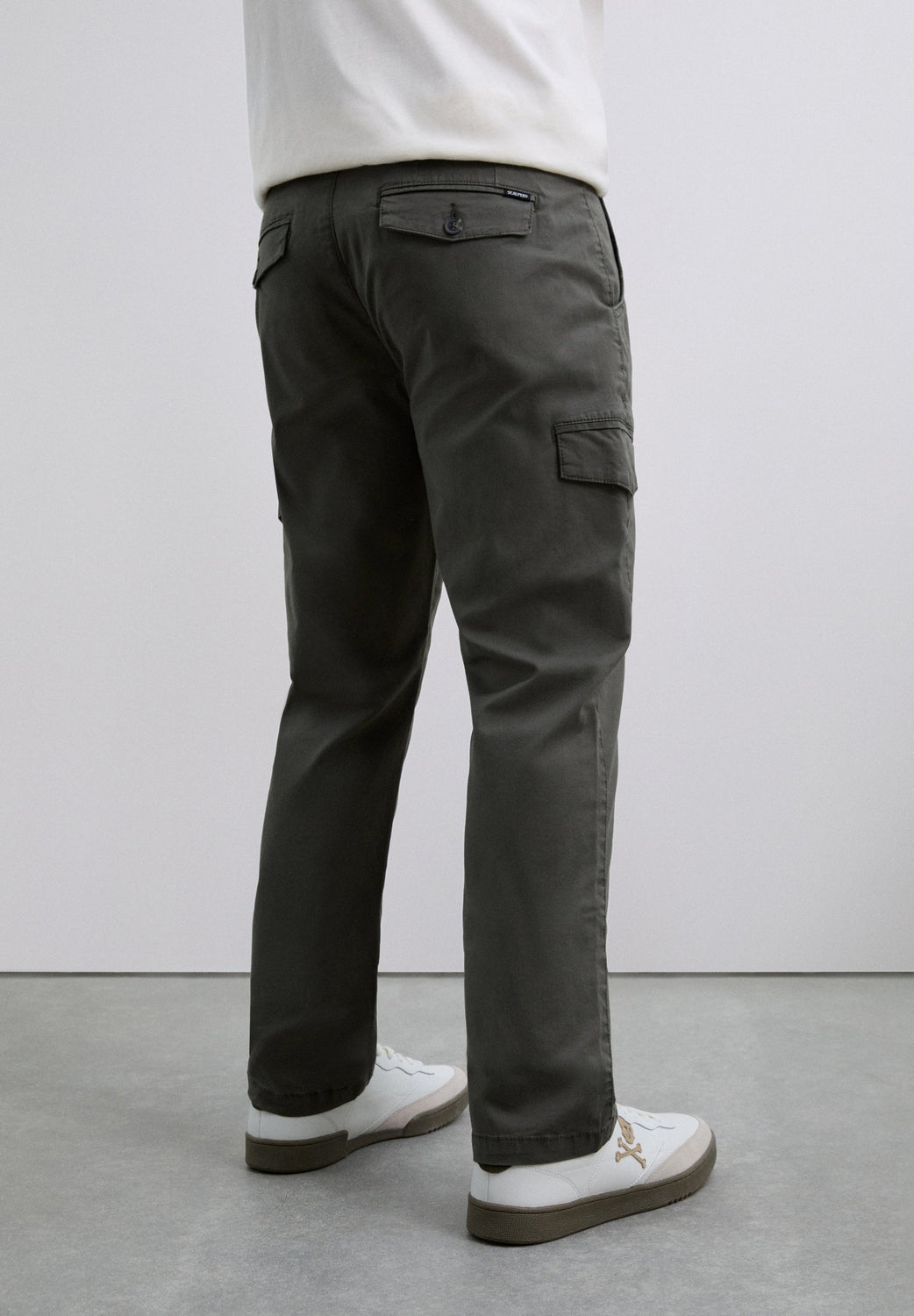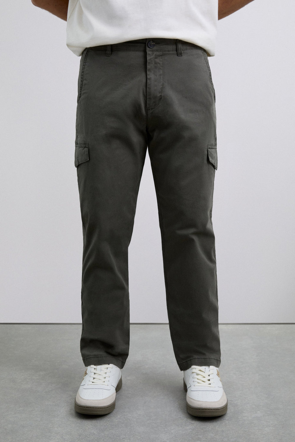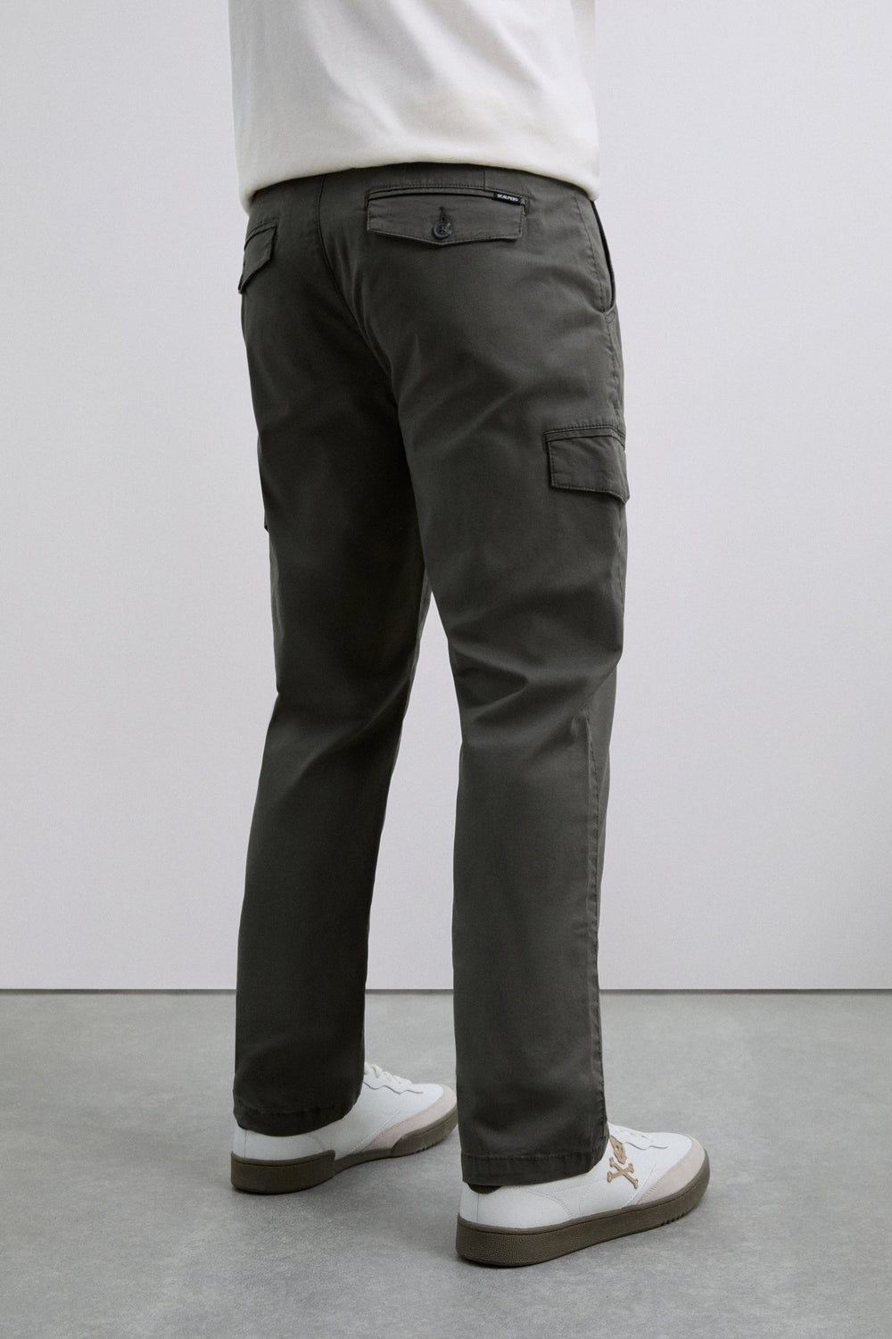 Cargo trousers made of BCI cotton. Slim fit. Two front pockets, back pockets with button fastening and side flap pockets. Belt loops and button and zip fastening. Embroidered logo on the back pocket.