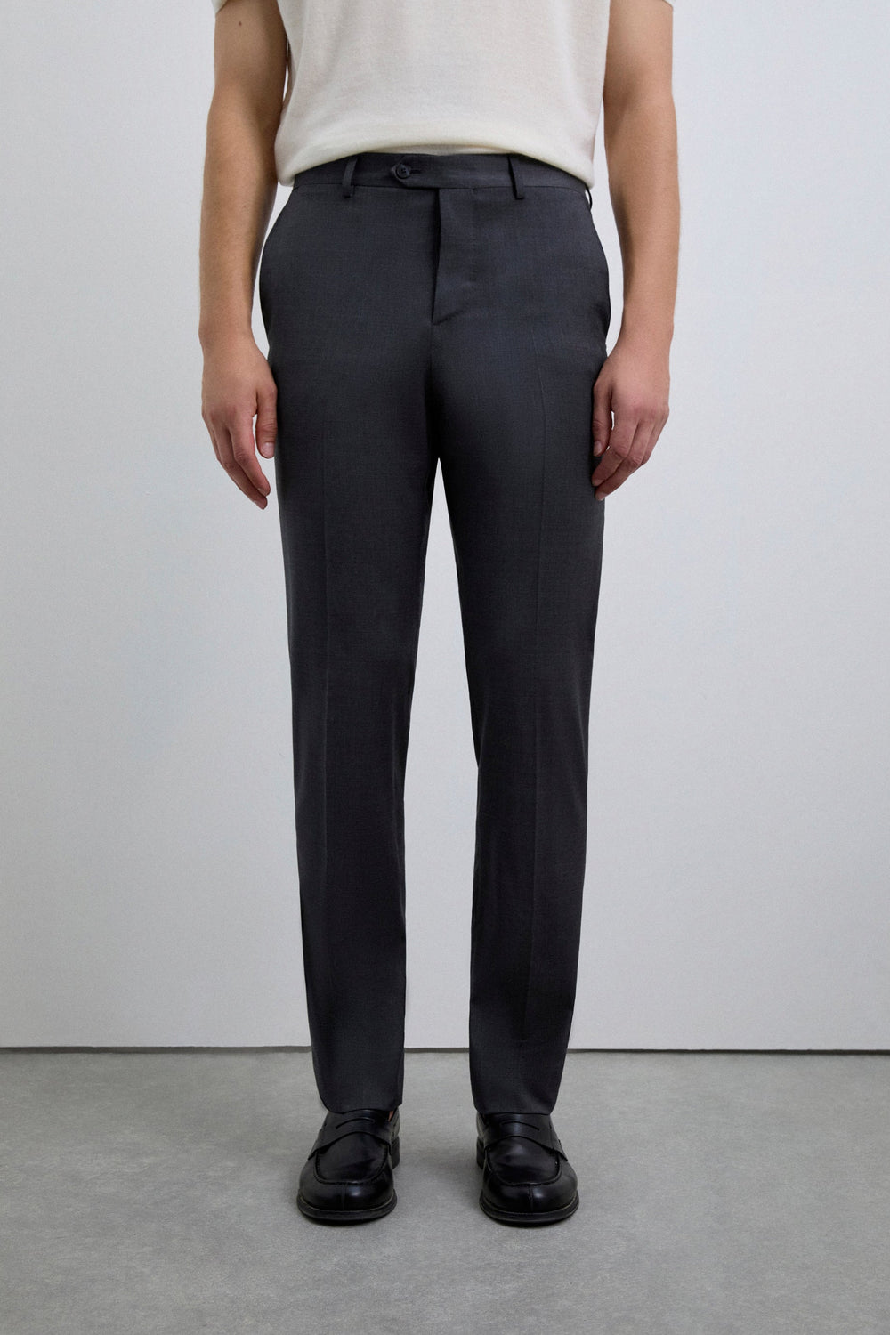 Pantalón de vestir con pinzas confeccionado en mezcla de lana ligeramente elástica. Cierre de cremallera oculta y botón en cintura prolongada con trabillas. Bolsillos inclinados delanteros y traseros de vivo con botón.