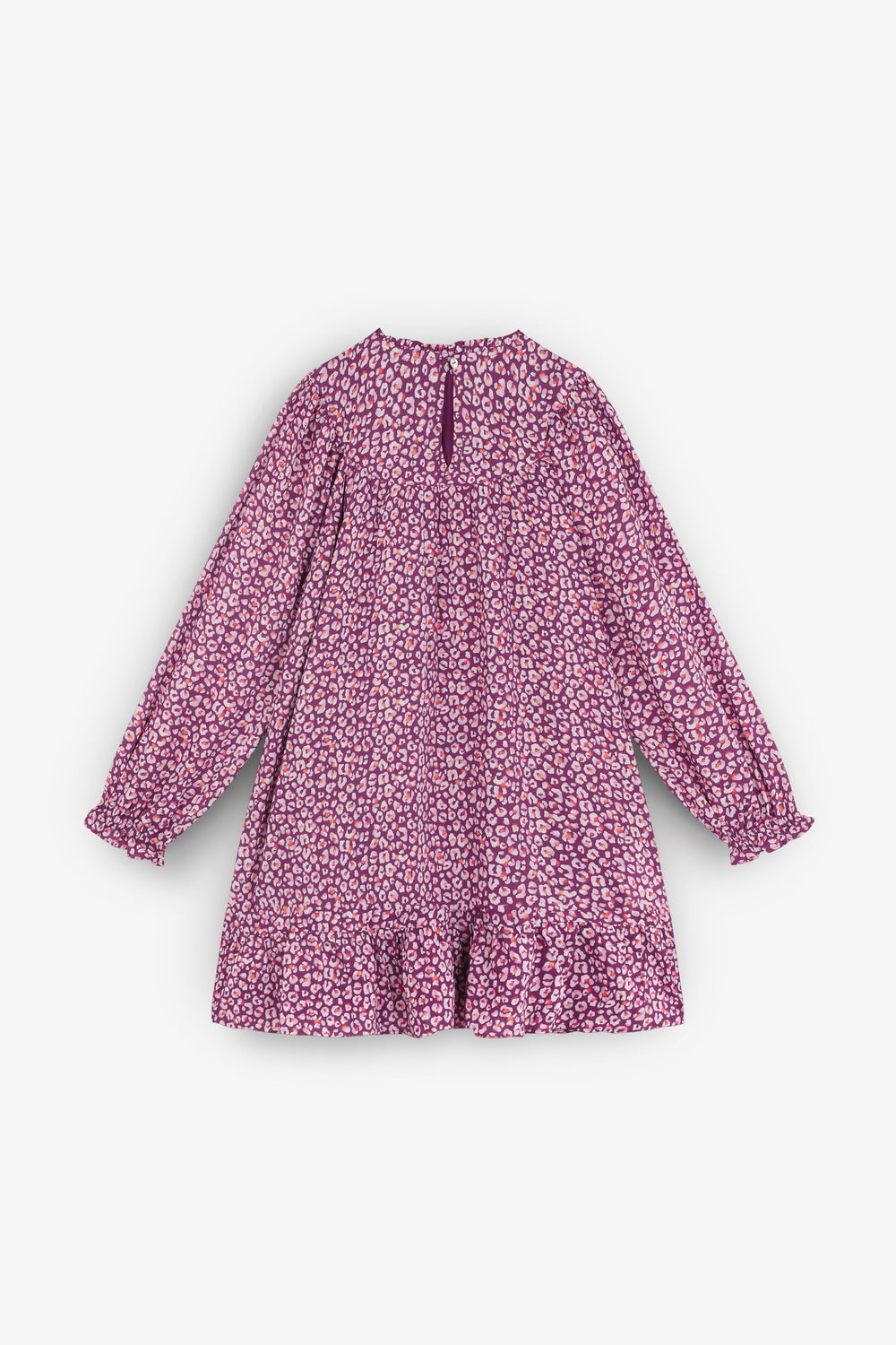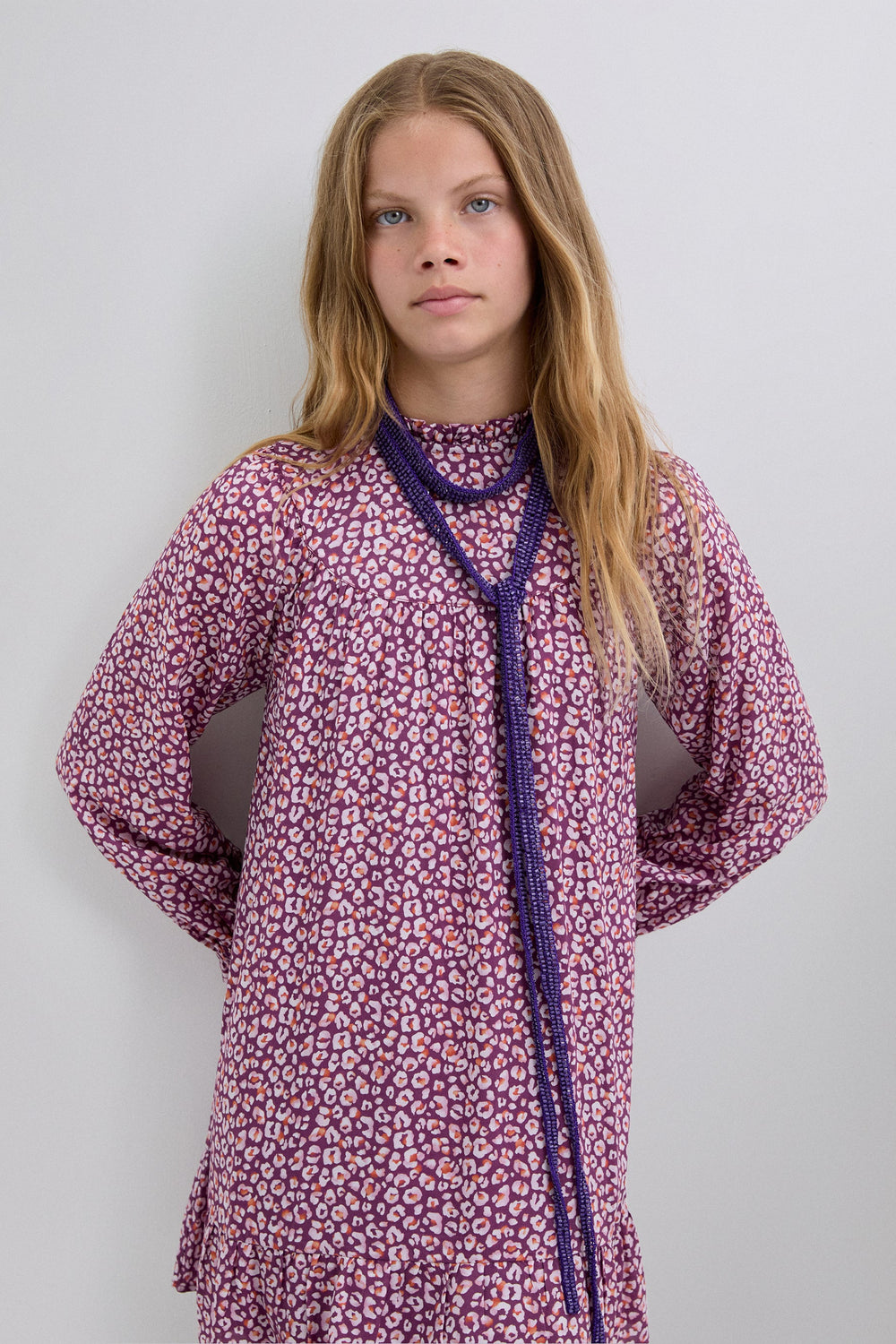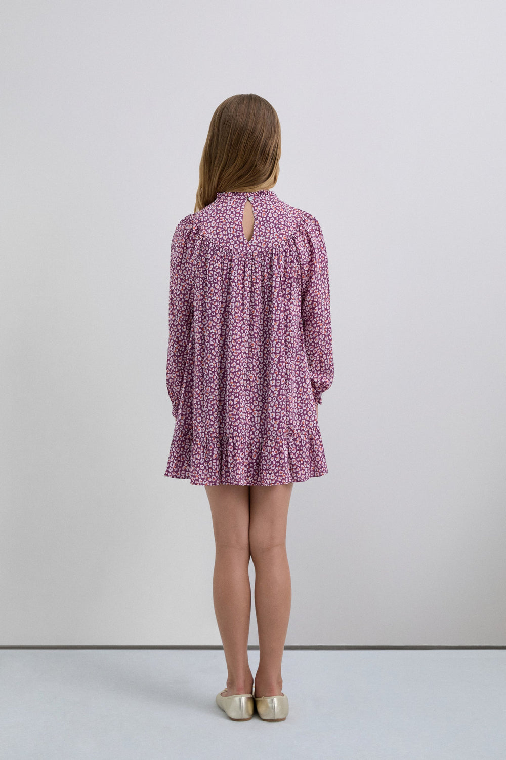 Mini dress made of 100% viscose with animal print. Babydoll cut, high collar with gathering on the chest and long sleeves with gathered cuffs. Skirt with a slight flounce.